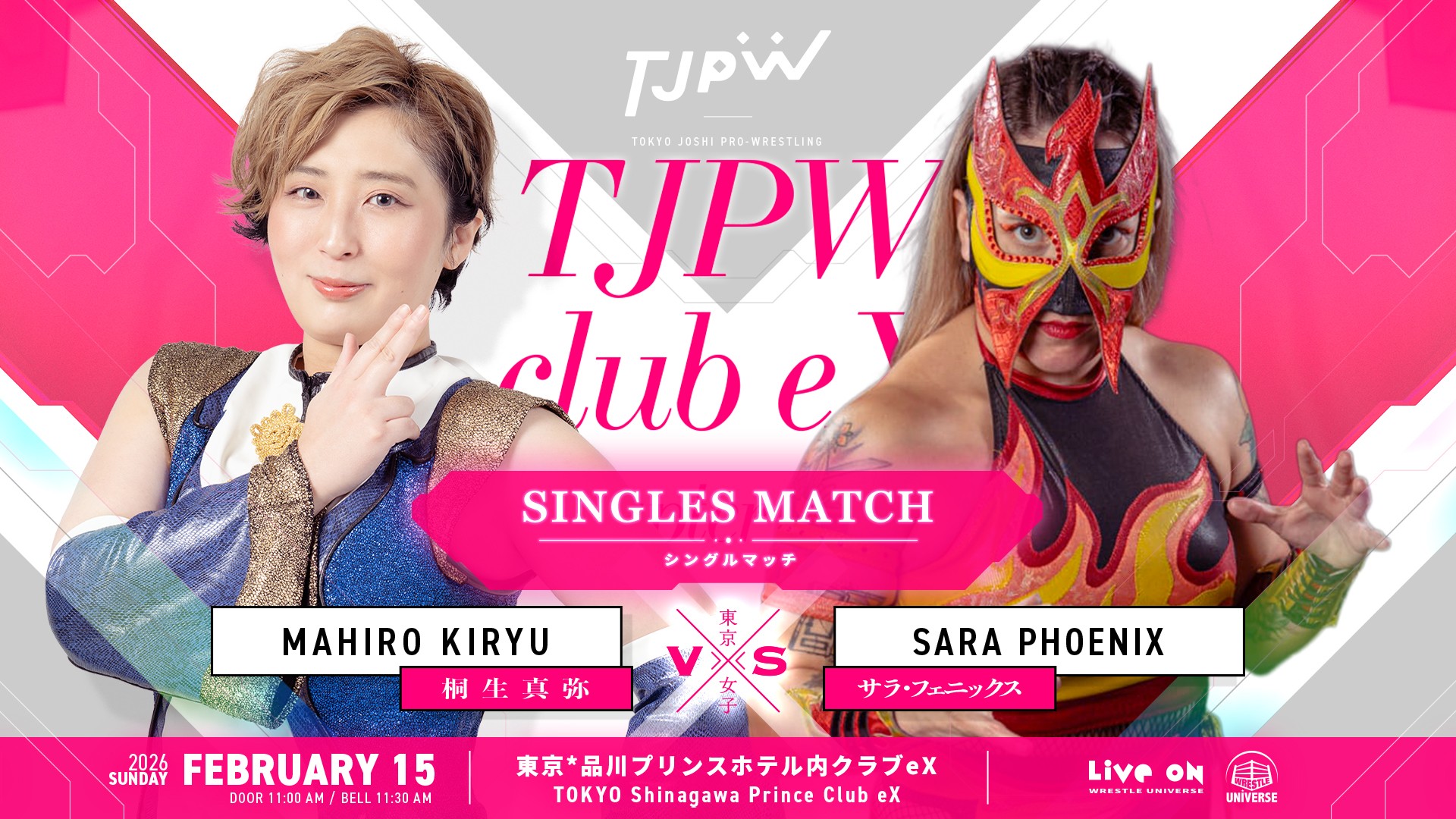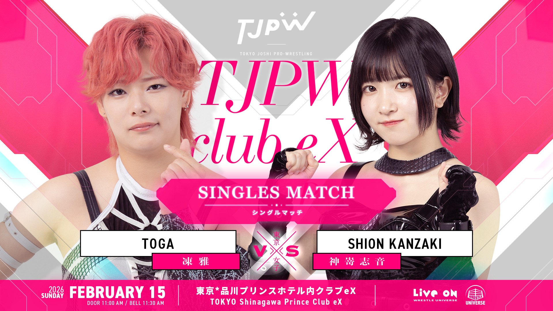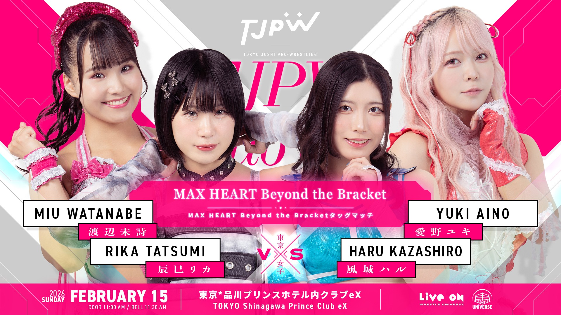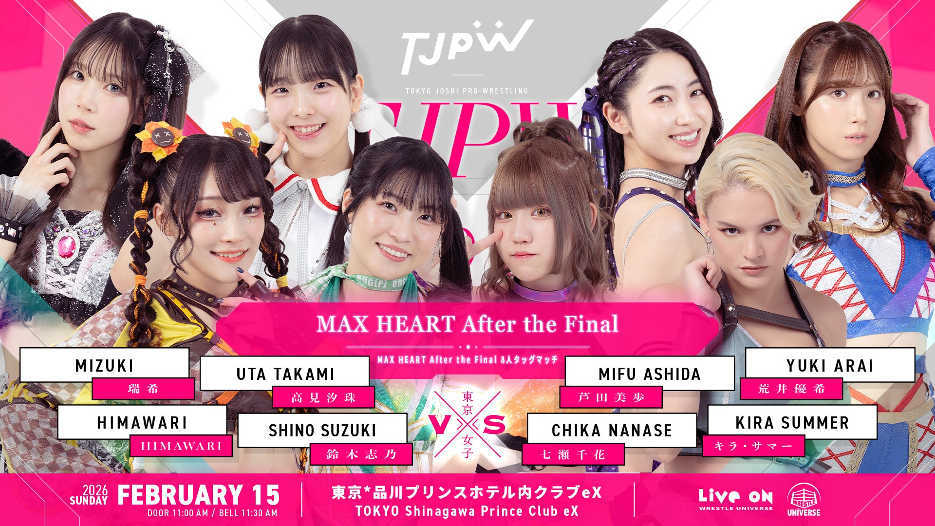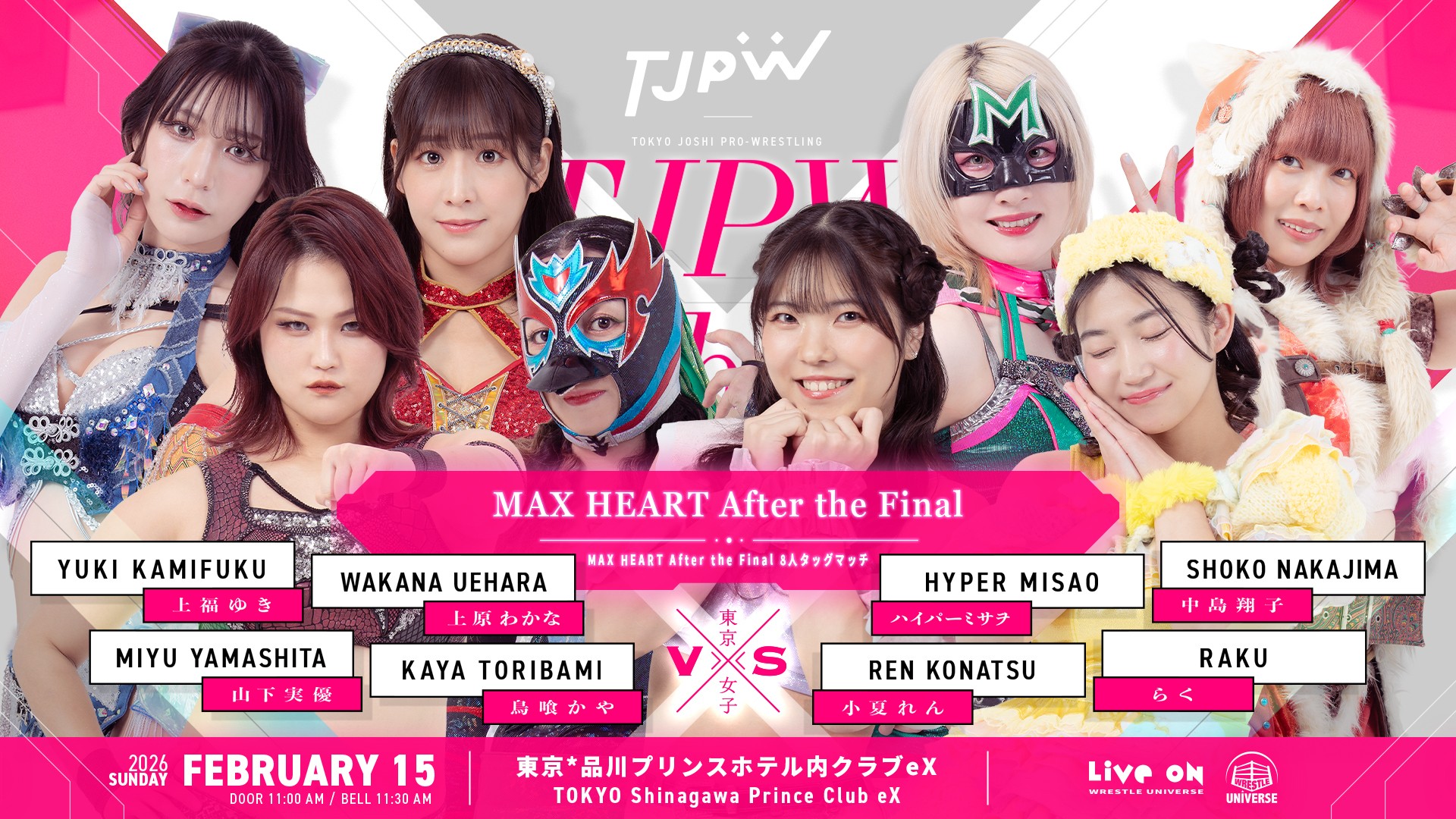 2月15日(日)品川クラブeX大会の対戦カードが決定しました。『MAX HEART After the Final』と銘打ち、8人タッグマッチが2試合。また『MAX HEART Beyond the Bracket』としてトーナメントで実現しなかった対戦カードが2試合おこなわれます。