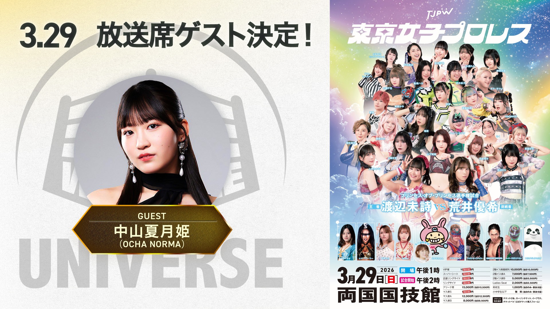 3月29日(日)、東京・両国国技館で開催される『GRAND PRINCESS ’26』の模様は、プロレス動画配信サービス「WRESTLE UNIVERSE」にて実況生中継いたします。