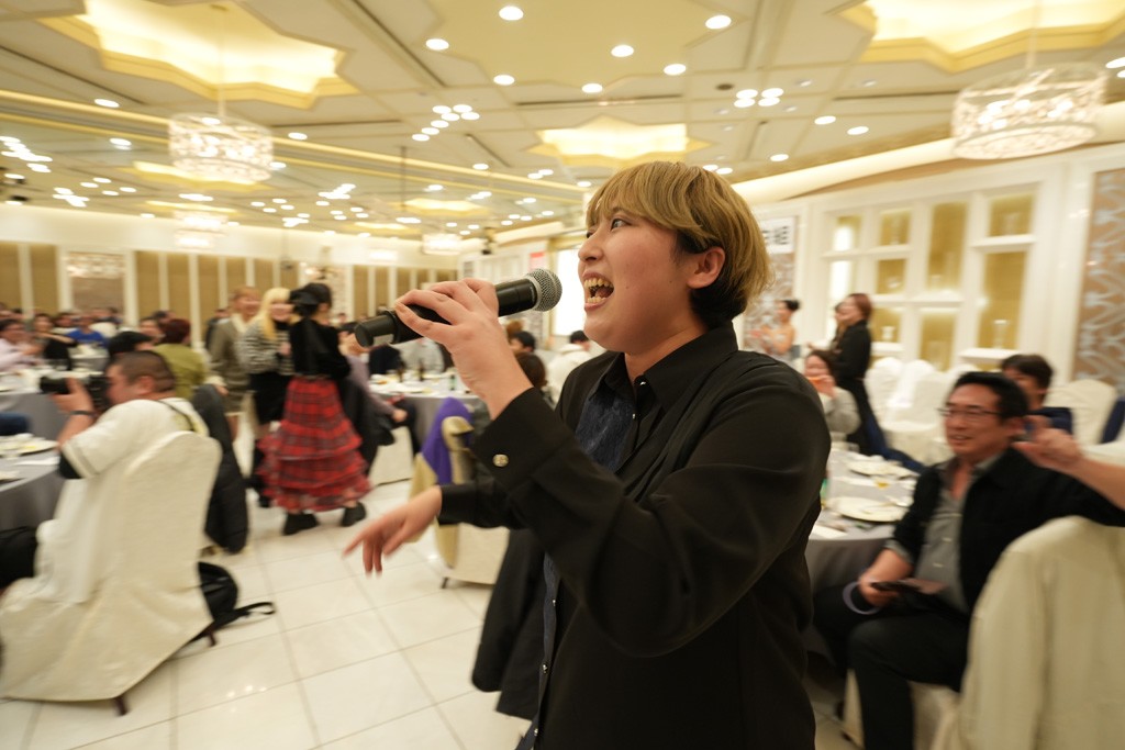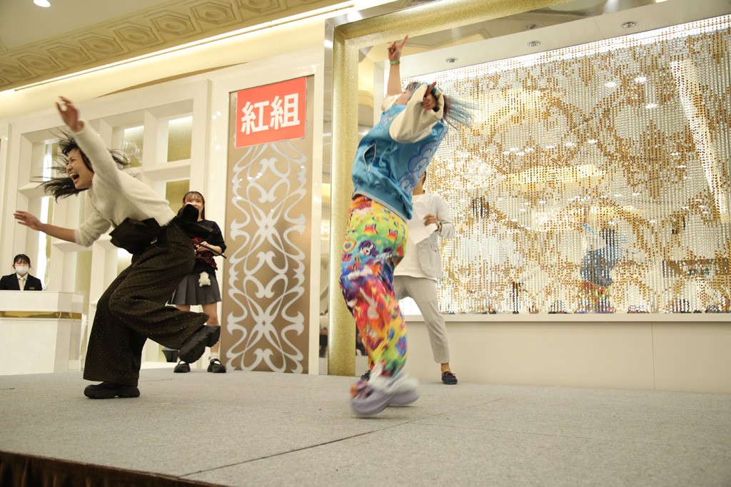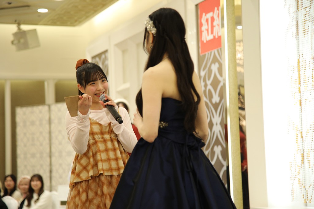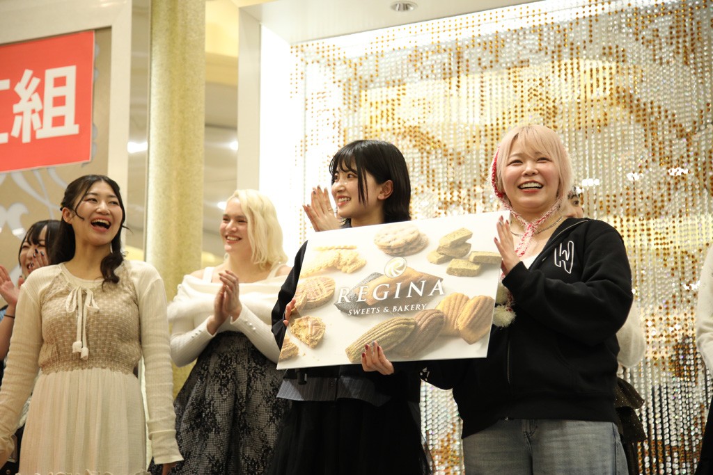 その後も究極の運試しや、神嵜志音と桐生真弥によるカラオケ対決などが行われ、最終結果は104ポイント対1ポイントで紅組が優勝しました。紅組には優勝賞品として、Duo CEREZOを運営する平安セレモニー株式会社の古渕英一取締役副社長より、REGINA SWEETS & BAKERYの焼き菓子が贈呈されました。