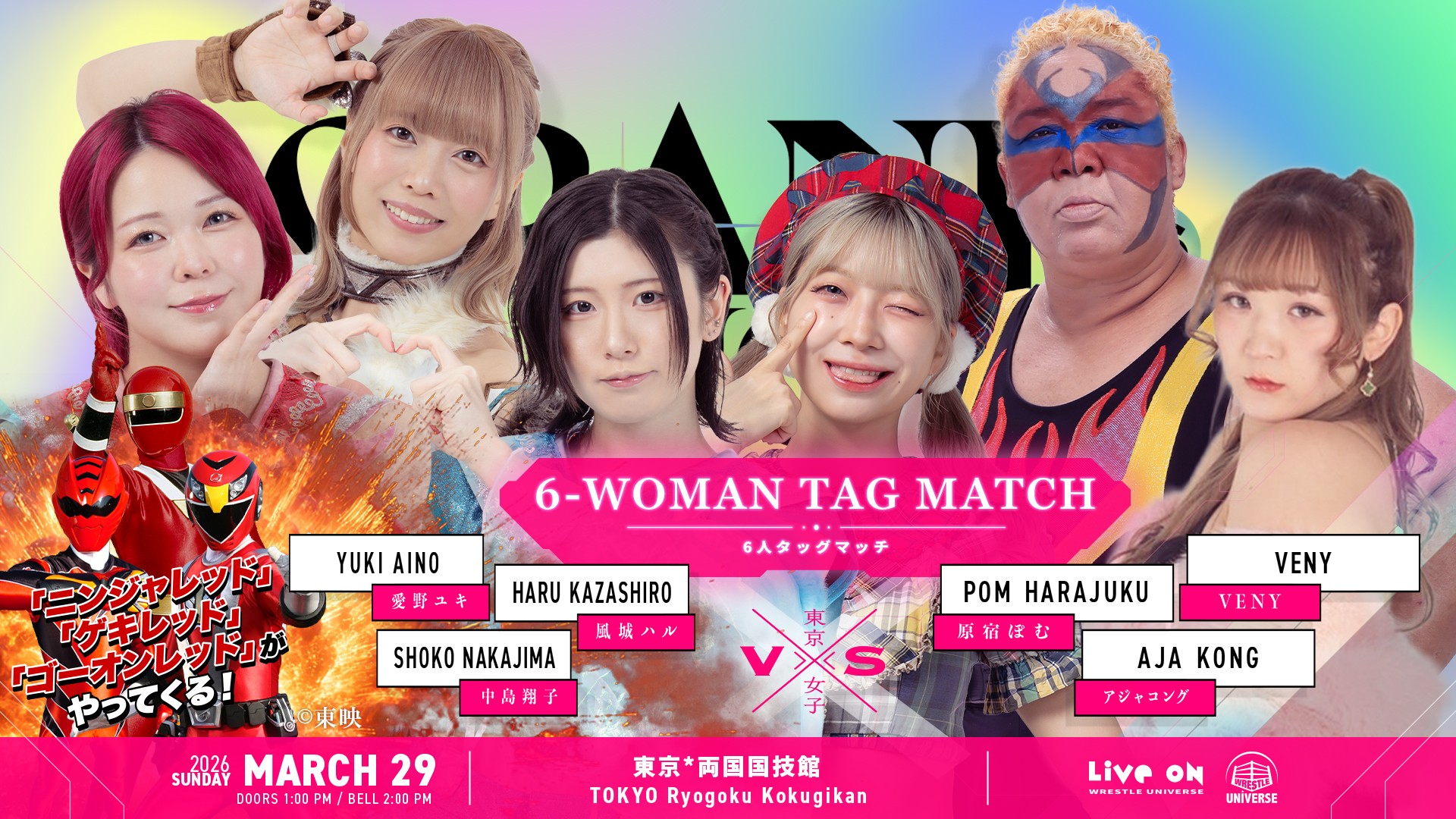 中島翔子&愛野ユキ&風城ハル(with)ニンジャレッド&ゲキレッド&ゴーオンレッド vs アジャコング&VENY&原宿ぽむ