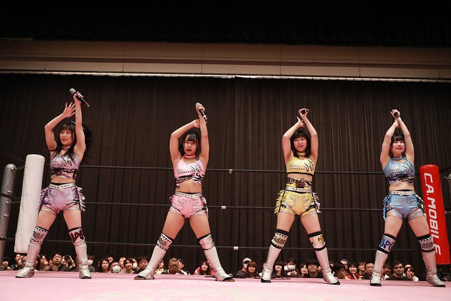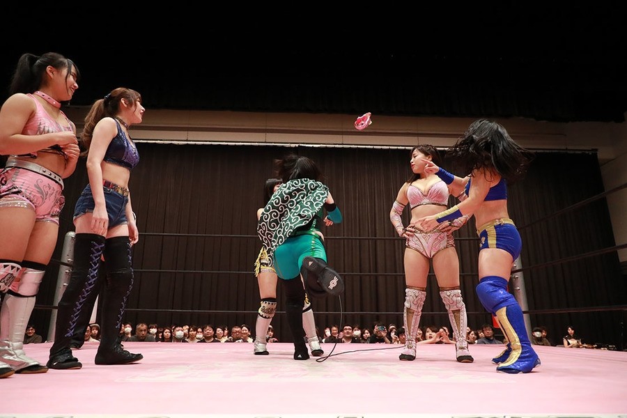 試合前、いつものようにハイパミがマイク。相手チームの白川と共通点が多いとし、「まず青山学院大学卒業。今現在の共通点としてコスチュームに隠れM。マスクにもMって入ってる。これめっちゃおしゃれじゃないですか」と奪うと客席に投げ捨て「青学には嫌な思い出しかねえんだよ!」とヒーロー矯正システム。「ヒエラルキートップ」へのルサンチマンを炸裂させたハイパミに続き、上福は白川の入場シーンをモノマネ。その隙に白川が反撃、ロメロスペシャルを決める。才木は豪快にボディスラム。ラクにタッチするとおやすみエクスプレス発車。上福はドロップキックを返しミウにタッチ。「かっとばしていくぞ!」とバッティング式ダブルチョップで3安打。上福はコーナーで「おやすみグリグリ!」と踏みつけ。ハイパミはロープにラクの腕を打ち付けていくとリング中央でも腕攻め。ラクはカウンターでクロスチョップを決めると才木がタックル。ハイパミとミウには同時にラリアット。ハイパミはランニングクロスボディ。ミウが入って才木にエルボー連打。才木の突進はベアハッグでキャッチ。才木はカウンターでドロップキック。タワーブリッジはミウが崩してカナディアンバックブリーカー。才木はバックドロップ。白川は上福にタックル。上福はカウンターでビッグブーツ、ボディスラム。カウントは2。しかし白川はコーナーからダイビング・テーズプレス。ランニングネックブリーカードロップも決めるとインプラントDDT。赤コーナー3人は上福にトレイン攻撃。ラクはMaxとき。才木と白川がダブルでブレーンバスター。才木がサッカーボールキック。カウント2で返した上福はブレーンバスター。才木にハイパミがアイアムアヒーロー。上福は串刺しドロップキックを決めて追い込む。しかしフェイマサーはブロックされ、才木がラリアットからタワーブリッジ。思い切り揺さぶられて上福はギブアップ。
