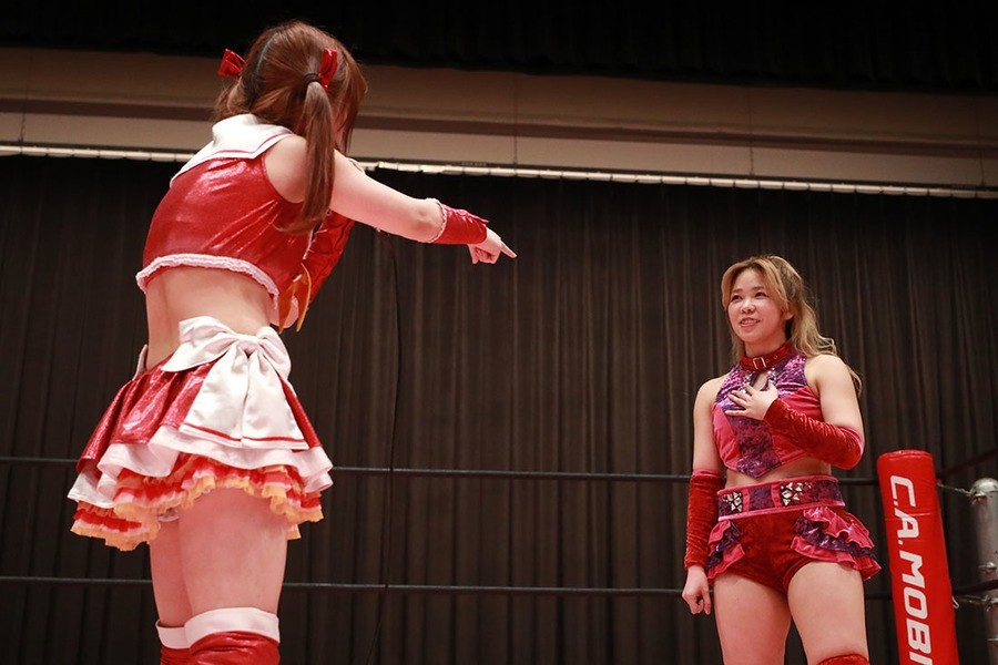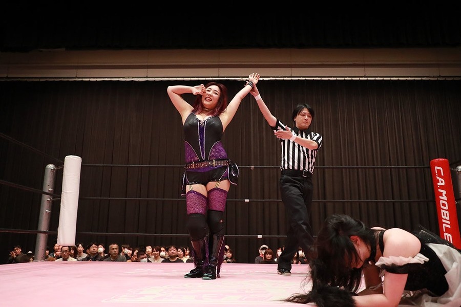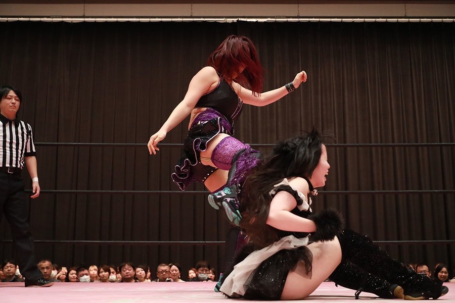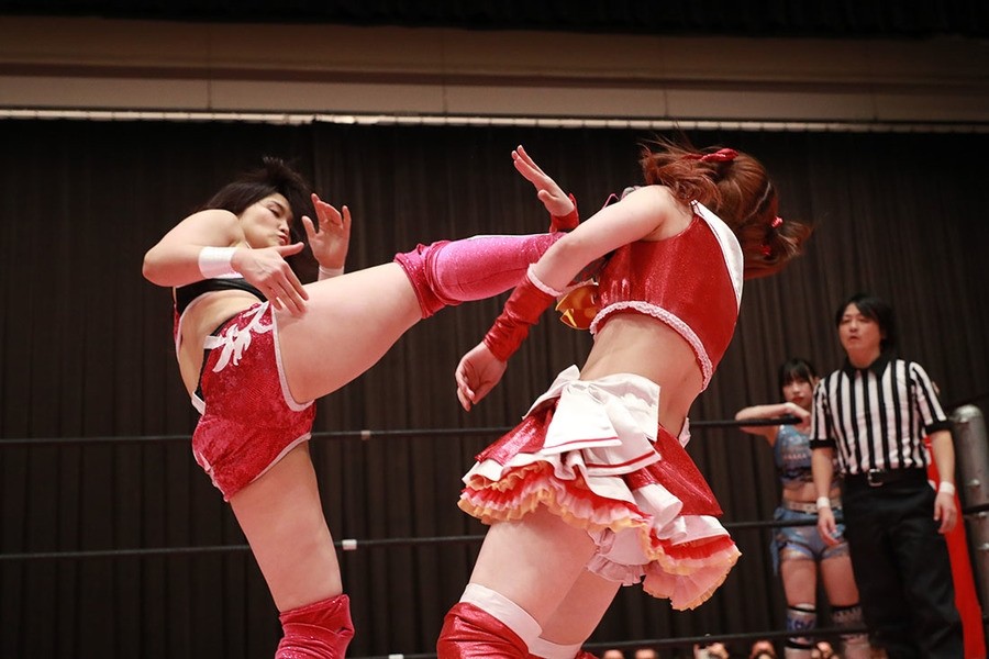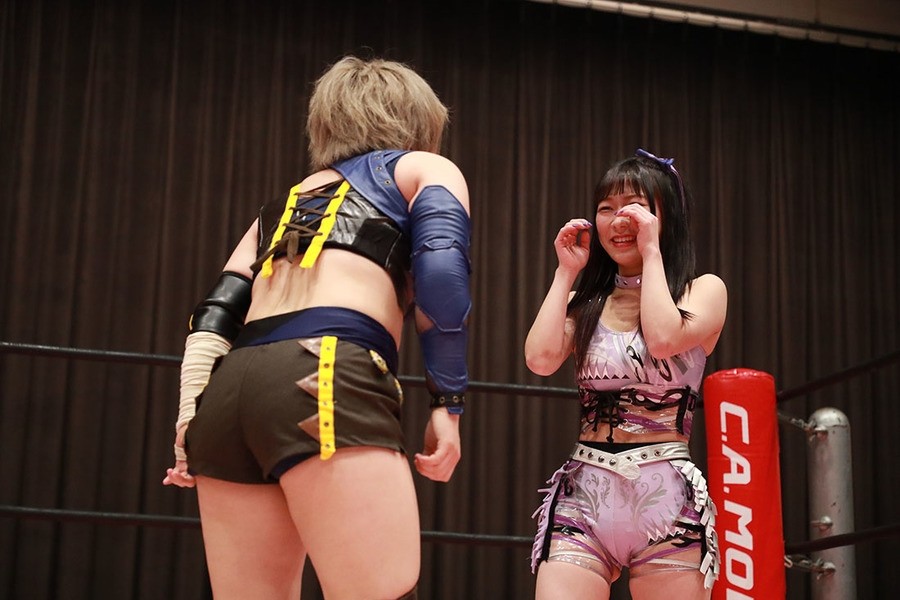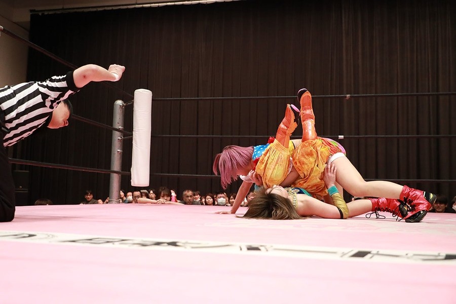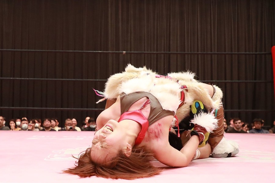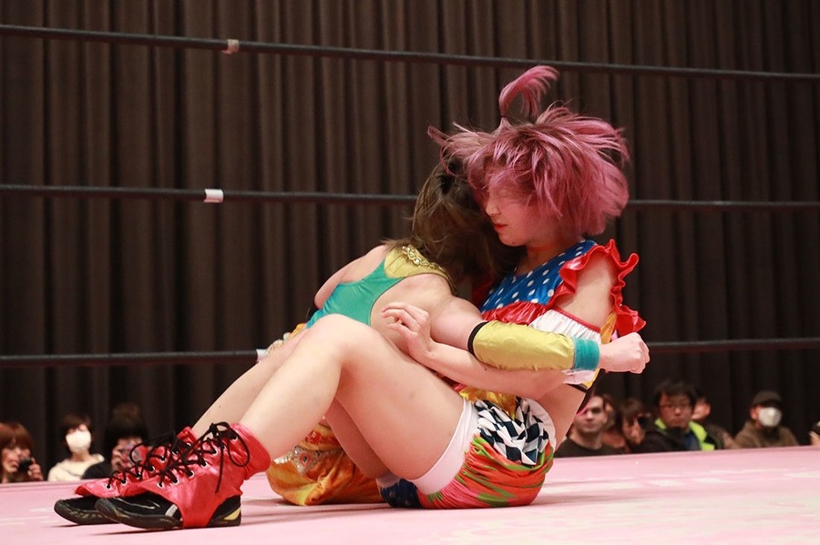まなせはて四つを要求も届かないはるな。ボディに一発入れて組み、手首を取っていく。グラウンドではまなせ優勢、ショルダーアタックにも微動だにせず、自分が倒すと「かわいい耳ついてんじゃん」と言いつつヘアーポイップ。コーナーでは顔面踏みつけ。さらにロープに磔にして蹴りを一閃。ボディスラムは高角度。ヘッドロックからグラウンドで絞め上げていくまなせ。これははるながロープエスケープ。すると腰を踏みつけていくまなせ。はるなはエルボーを連打、まなせはあえて受けると強烈な一発をお返し。走り込んでのヤシの実割りからランニングネックブリーカーを決めたはるな。まなせはサッカーボールキック。はるなは首固めもカウント2。まなせは串刺しビッグブーツからネックスクリュー・ホールドで3カウントを奪取してみせた。