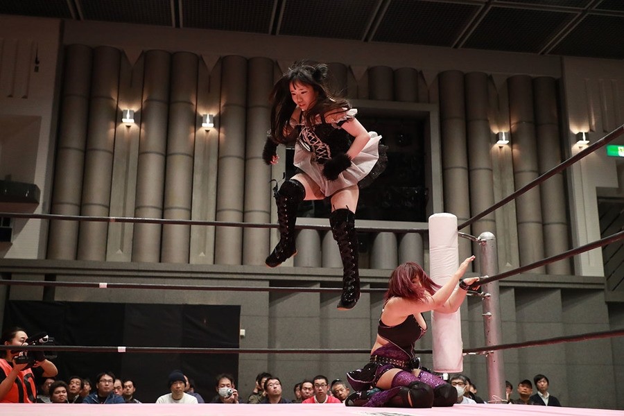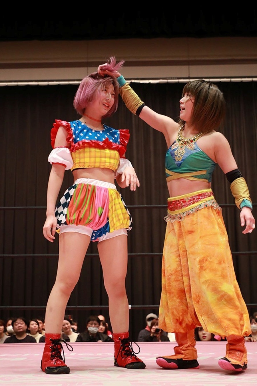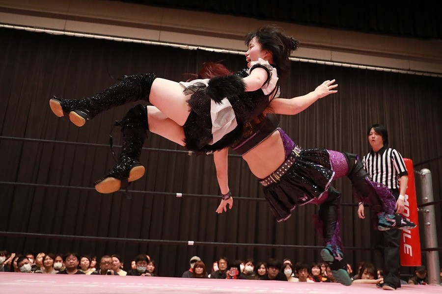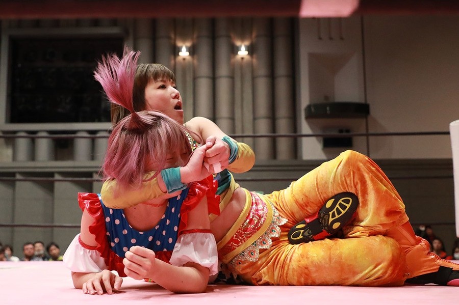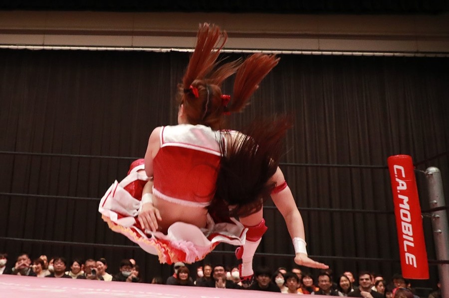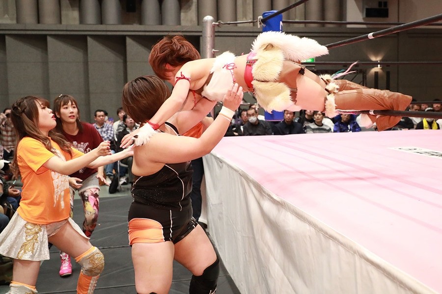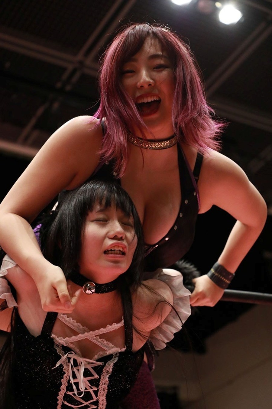 まなせはて四つを要求も届かないはるな。ボディに一発入れて組み、手首を取っていく。グラウンドではまなせ優勢、ショルダーアタックにも微動だにせず、自分が倒すと「かわいい耳ついてんじゃん」と言いつつヘアーポイップ。コーナーでは顔面踏みつけ。さらにロープに磔にして蹴りを一閃。ボディスラムは高角度。ヘッドロックからグラウンドで絞め上げていくまなせ。これははるながロープエスケープ。すると腰を踏みつけていくまなせ。はるなはエルボーを連打、まなせはあえて受けると強烈な一発をお返し。走り込んでのヤシの実割りからランニングネックブリーカーを決めたはるな。まなせはサッカーボールキック。はるなは首固めもカウント2。まなせは串刺しビッグブーツからネックスクリュー・ホールドで3カウントを奪取してみせた。