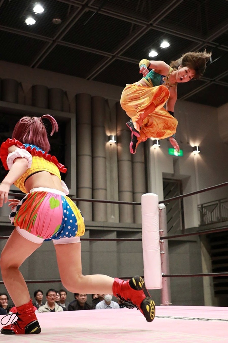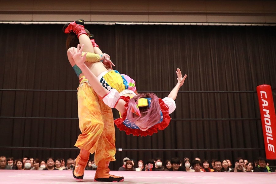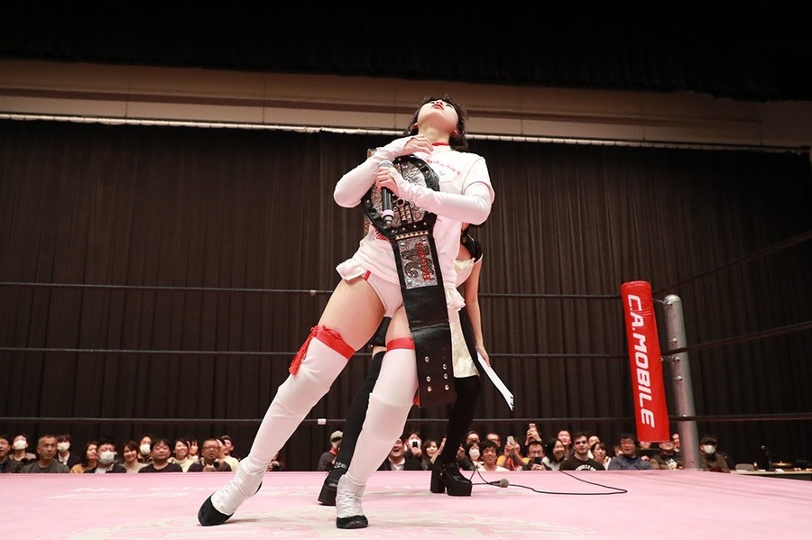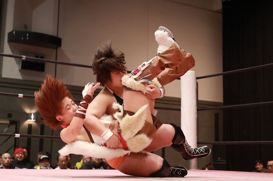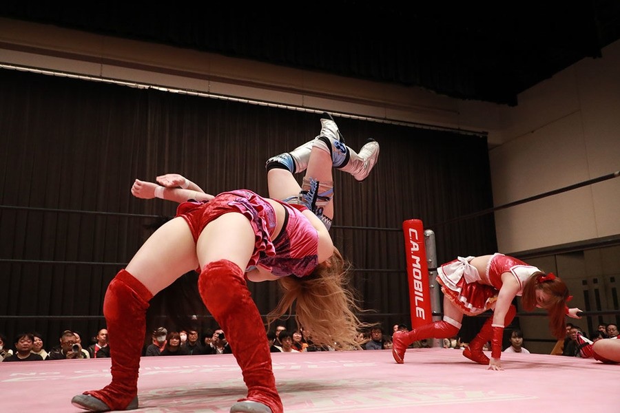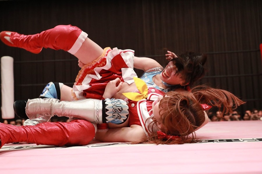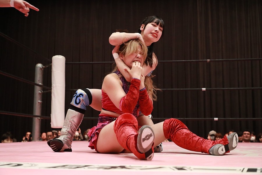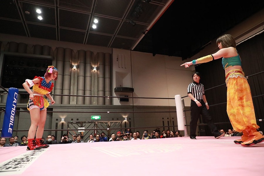 まなせはて四つを要求も届かないはるな。ボディに一発入れて組み、手首を取っていく。グラウンドではまなせ優勢、ショルダーアタックにも微動だにせず、自分が倒すと「かわいい耳ついてんじゃん」と言いつつヘアーポイップ。コーナーでは顔面踏みつけ。さらにロープに磔にして蹴りを一閃。ボディスラムは高角度。ヘッドロックからグラウンドで絞め上げていくまなせ。これははるながロープエスケープ。すると腰を踏みつけていくまなせ。はるなはエルボーを連打、まなせはあえて受けると強烈な一発をお返し。走り込んでのヤシの実割りからランニングネックブリーカーを決めたはるな。まなせはサッカーボールキック。はるなは首固めもカウント2。まなせは串刺しビッグブーツからネックスクリュー・ホールドで3カウントを奪取してみせた。