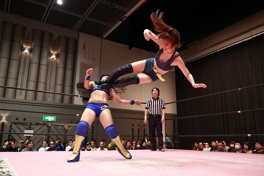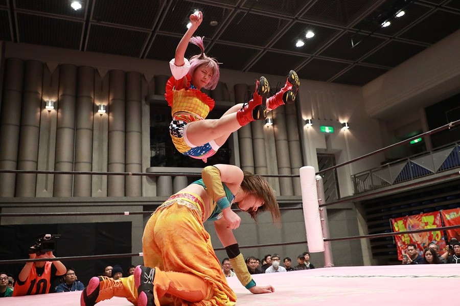 デビュー戦のぽむは走ってリングイン、試合前ながら笑顔を絶やさず。リストの取り合いから坂咲は拍手も握手に応じたぽむにガットショット。ぽむはヘッドシザースホイップを決めるが、坂崎はペースを譲らず。リボンを奪って自分がつける。ぽむはエルボー連打も坂崎が一発で倒しボディスラム。バックエルボーを返したぽむはフェイントを入れてスネに蹴りを一撃。スクールボーイ2発は坂崎が返す。そこからグラウンドでフェースロック。しかしミサイルキックはぽむがかわし、坂崎の体を踏み台にしてレッグドロップ。坂崎はカウンターでコンプリートショット。最後はスライディングラリアットで3カウント。