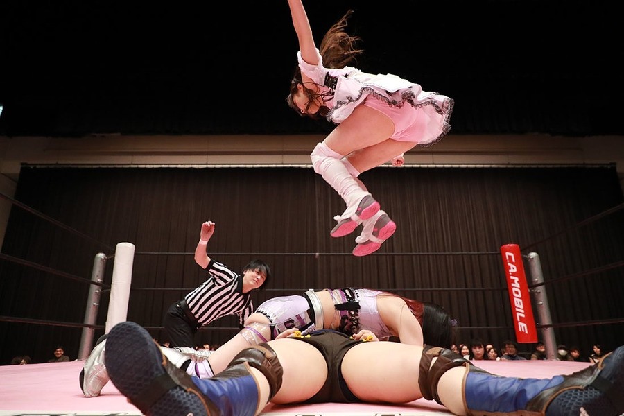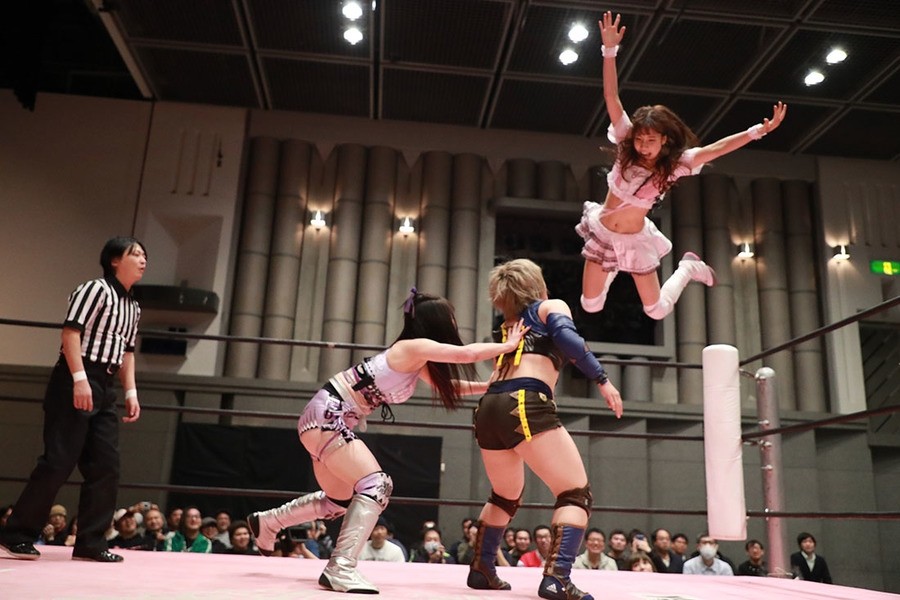 瑞希は警戒してかヒナノとは握手せず。ゴングが鳴ると3人同時の攻防。瑞希は2人の手首をまとめて固めていく。ここで泣き出すヒナノ。のどかを「かっこいい」とおだてて瑞希を攻めさせる。のどかはボディスラムからブーツ、しかしのどかをどけてヒナノがフォールへ。「違うんです、間違えちゃって」とヒナノ。「タックルが見たいです」というヒナノに応えてのどかがショルダータックル。2人でトレイン攻撃も見せるが、隙をついてのどかにスクールボーイ。さらに側転アームホイップ、ダイビングカンフーキック。死して今度は「弱ってるから一緒に」と瑞希を引き込んで連携。フォールにいったヒナノに「ざけんな!」と瑞希がフットスタンプ。また泣き出したヒナノを踏みつける瑞希。のどかは瑞希、ヒナノにタックル。ヒナノは場外にエスケープ。リング内の瑞希にのどかがスプラッシュも自爆に。ランニング・クロスボディーも切り返してフェースロック。ここでヒナノがリングイン、丸め込むがカウント2。瑞希が磔にして後ろからドロップキック。コーナーに登った瑞希だがクロスボディーはのどかを盾にするヒナノ。ヒナノが瑞希、のどかを同時に攻める場面もあったが、最後はフェースロックを決めてヒナノをギブアップさせた。