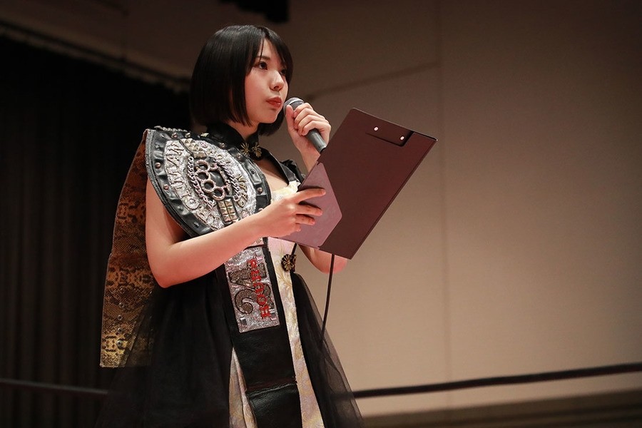 休憩明けは欠場中の辰巳リカが登場し、自身の入場曲である「恋と革命」を披露。しかし歌い終わり、「後半戦スタート!」のコールとともに難波リングアナが資料を留めているバインダーで襲撃。リカはダウンし、3カウント入って難波がアイアンマン王者に。「アイアンマンヘビーメタル急新王者は難波小百合となります」と難波リングアナは自らコールし、その後もベルトを肩にかけてセミファイナルの選手コールへ。