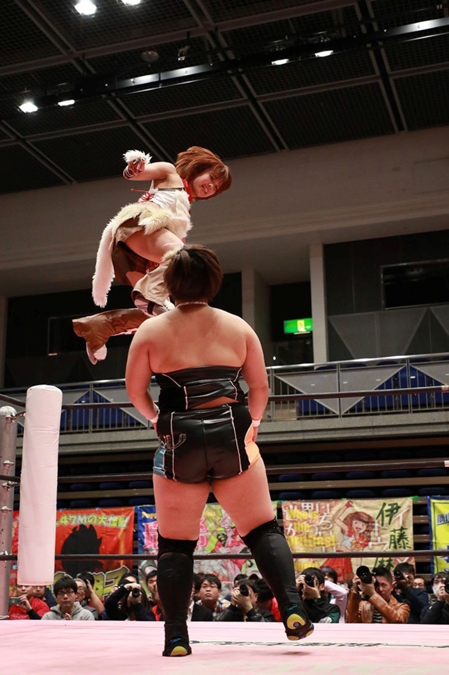 試合後、伊藤がマイク。「いや、山下実優に直接勝ったわけじゃないんだけどさ。先週、あんな屈辱的な負け方をして、自信がなくなってたんだよ実は。口では絶対勝ってやるって言ってたよ。言うのが仕事だから、それがレスラーだから! でもあんな屈辱的な負け方をして、自信がなくならないヤツなんて逆にいねえと思うよ。だって伊藤でさえ自信なくなったんだからよ! でもまあ、それはそれで、原点に戻してくれた山下実優に感謝を伝えたい。そして、どん底を見て這い上がってきた人間は強いんだとリング上で証明してやろうと思う!(ユキに)おまえもだぞ。へらへらしてるけど、この前タイトルマッチで負けてたろ。お前もどん底だよ。伊藤と同じ、お前もどん底だよ。伊藤と愛野ユキはどん底仲間だよ。(観客に)お前らも笑ってんじゃねえよ! このどん底仲間を見て笑ってるくらいどん底なんだろ。伊藤はこのどん底から這い上がってやるよ! おい、お前這い上がりたいか!(微妙な表情ながら頷くユキ) お前ら這い上がりたいか!(観客拍手)それでこそ東京女子プロレスのファンだよ。伊藤はまだまだ、イッテンヨンに向けて強くなるし、もっともっと面白いものを見せてやるから! お前ら全員ついてこい!」。そして雄叫びから締めのコール&レスポンス。「世界で二番目に可愛いのは? 愛野ユキ! そして世界一可愛いのは?」「伊藤ちゃん!」。