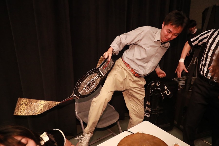 全試合終了後、本部席で物販などについての告知事項をアナウンスしていた難波リングアナ。そこに甲田哲也代表がバインダーで殴打し、スリーパー。チャンピオンが「無理無理!」とタップしてさらにアイアンマン王座移動。ベルトを強奪した甲田代表は、ブーイングの中、難波リングアナに蹴りを入れると控室へ逃走した。