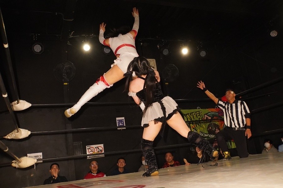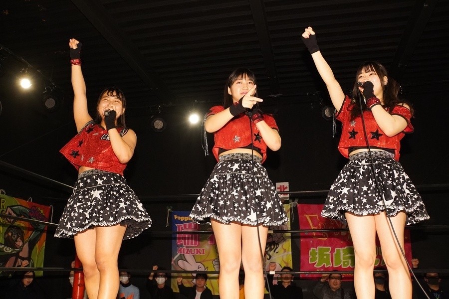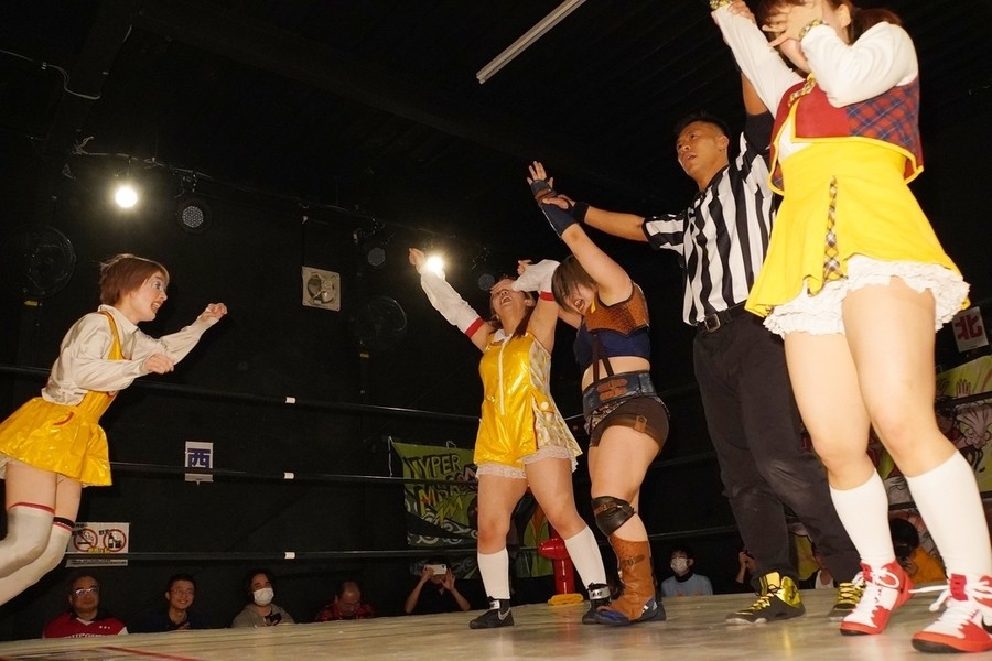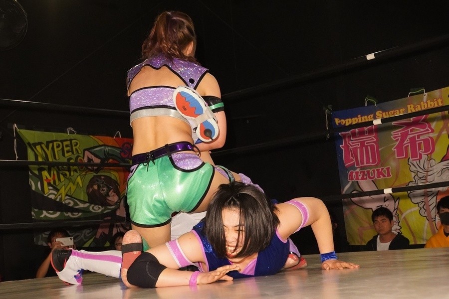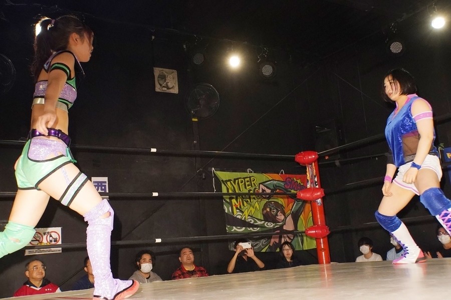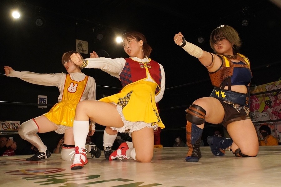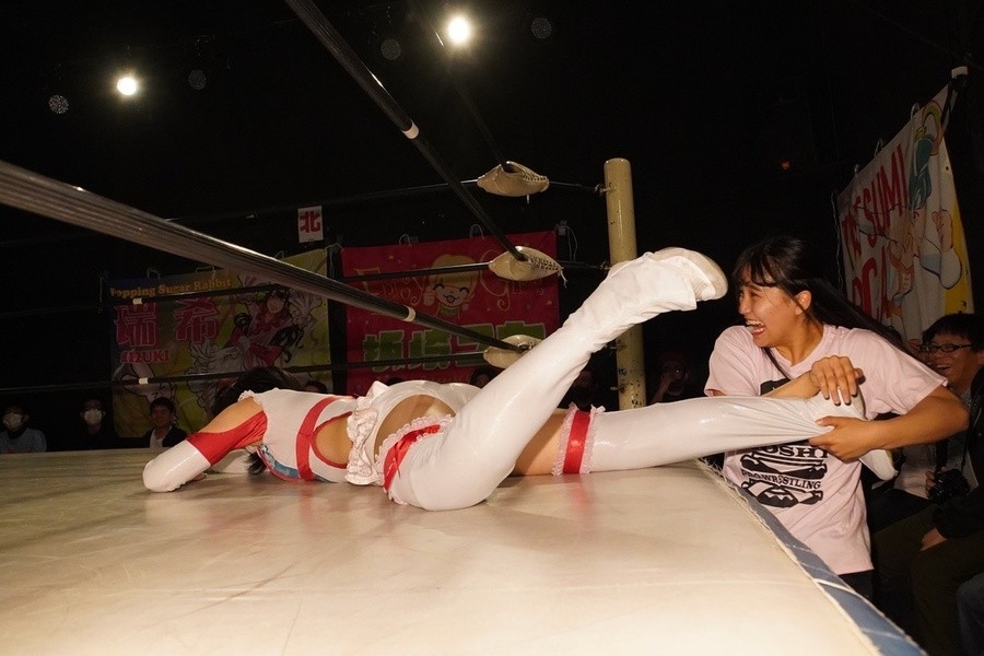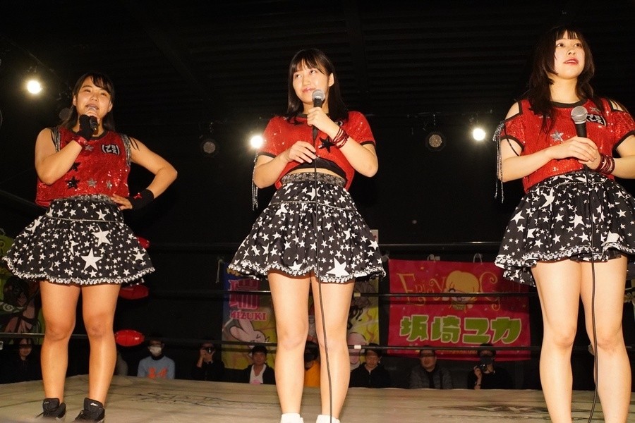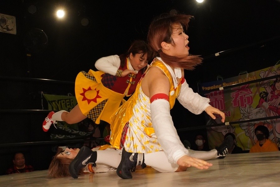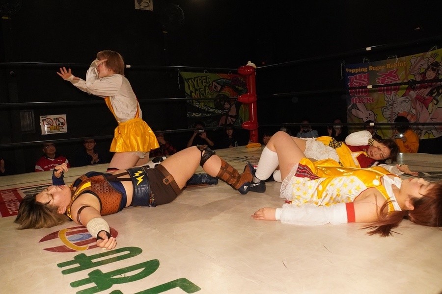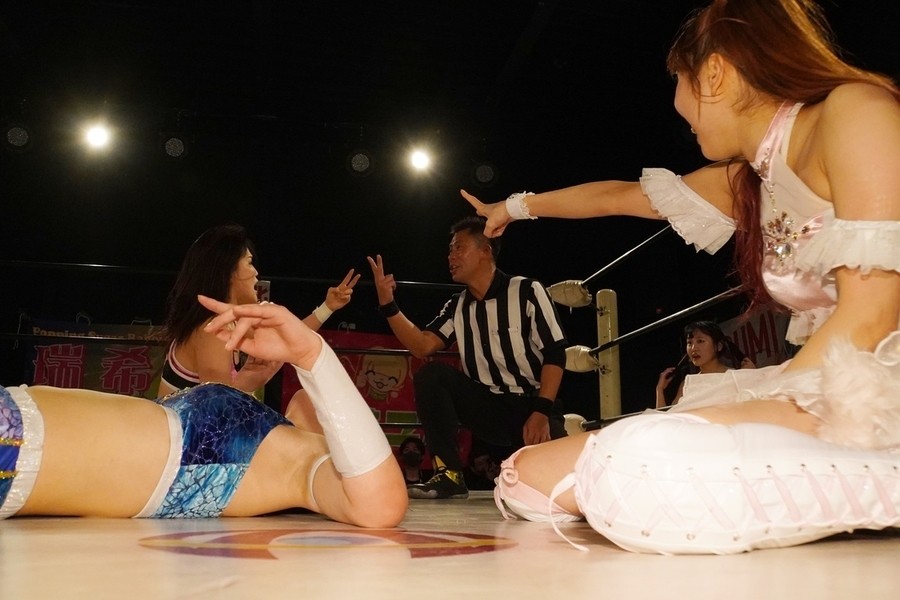 瑞希はアゴを強調して山下を挑発。試合が始まると、その瑞希に鈴芽が丸め込みを技を連発。2フォールカウントのため、瑞希も必死で返すと逆に瑞希がカニバサミで丸め込んで鈴芽から2カウント取って1本目を先取。2本目開始早々、山下がリングサイドから足をすくって瑞希と真弥を倒す。さらに山下は瑞希にサッカーボールキックからもチンロック。鈴芽が串刺し攻撃を狙うが、瑞希はドロップキックで迎撃。すかさず真弥がフライングメイヤーを連発。そして瑞希を呼び込んで合体技を狙うが、かわした鈴芽はドロップキック。タッチを受けた山下は真弥にストマックバスターから蹴りを叩き込んで2カウント取る。これで1-1となり3本目に。瑞希がドロップキック。山下はケブラドーラ・コンヒーロからラリアットを返すが、瑞希は山下の腕を掴んでグルグルと振り回す。山下も瑞希を振り回し、お互いに目を回してダウン。続いて鈴芽が真弥にスリーパーから回転エビ固め。カウント1で瑞希がカットするが、山下が瑞希を蹴り飛ばす。さらに山下が瑞希を羽交い締めにすると、鈴芽がダイビング・クロスボディー。瑞希がかわして山下に誤爆させると、今度は瑞希が山下を羽交い締め。そこに真弥が襲いかかるが、山下は蹴りで迎撃。ならばと瑞希がカサドーラで丸め込むと、フットスタンプを投下。すかさず真弥がカバーすると、山下は3カウントと勘違いしてカウント2で肩を上げるが、2フォールカウントルールのため真弥が勝利。