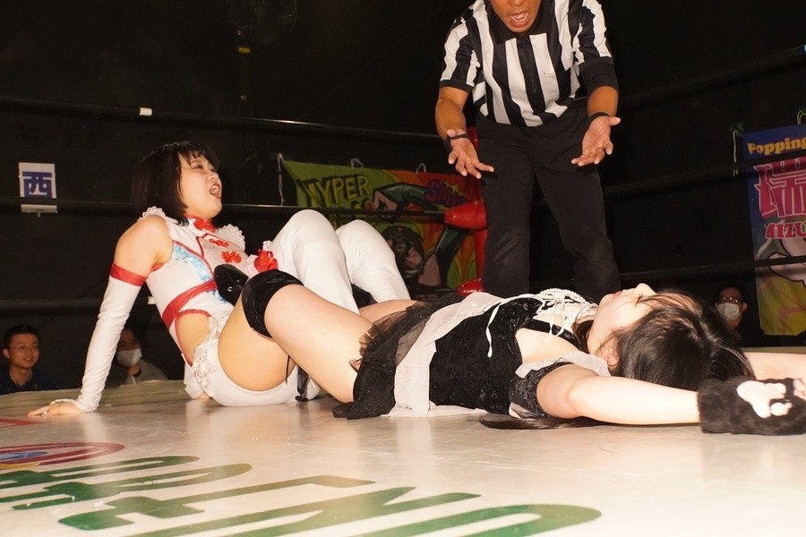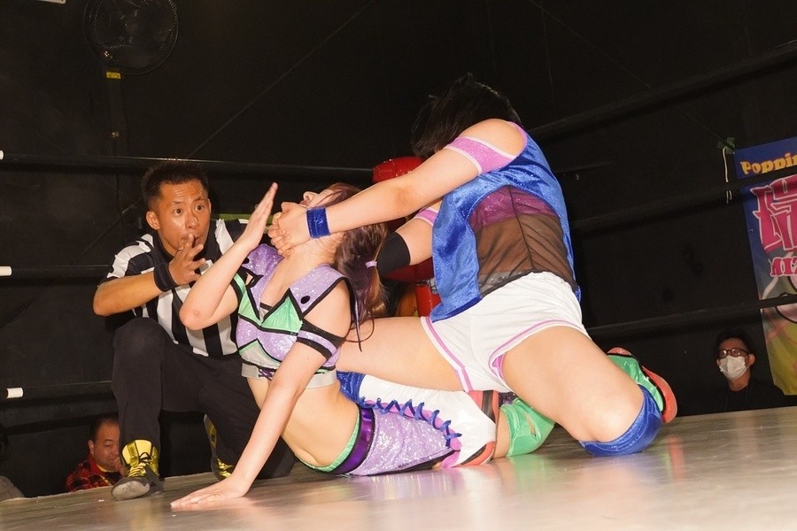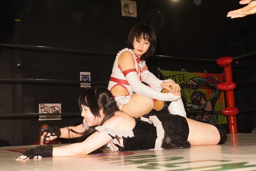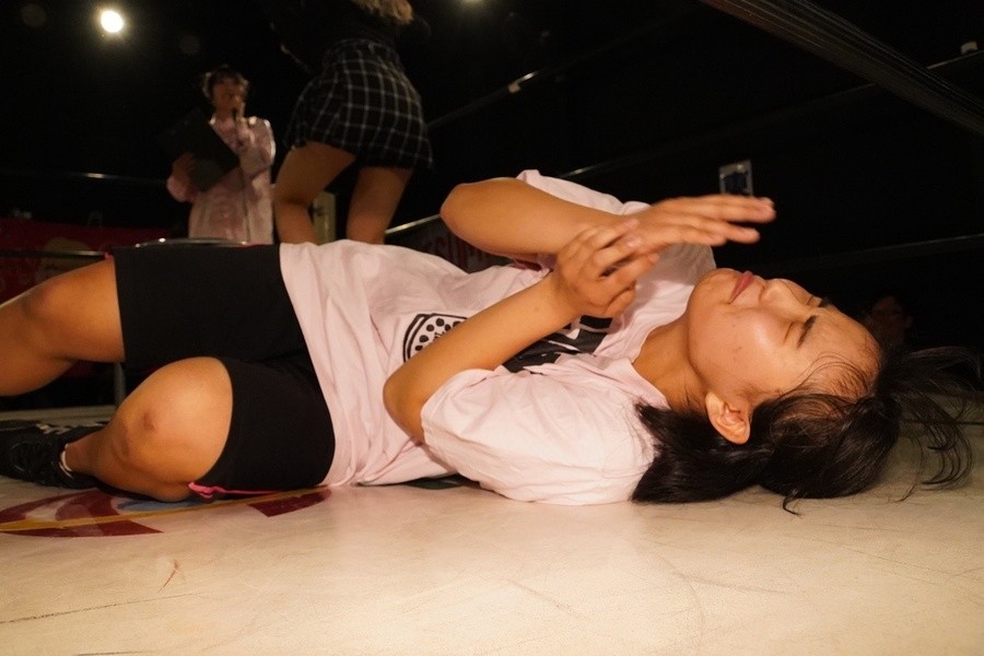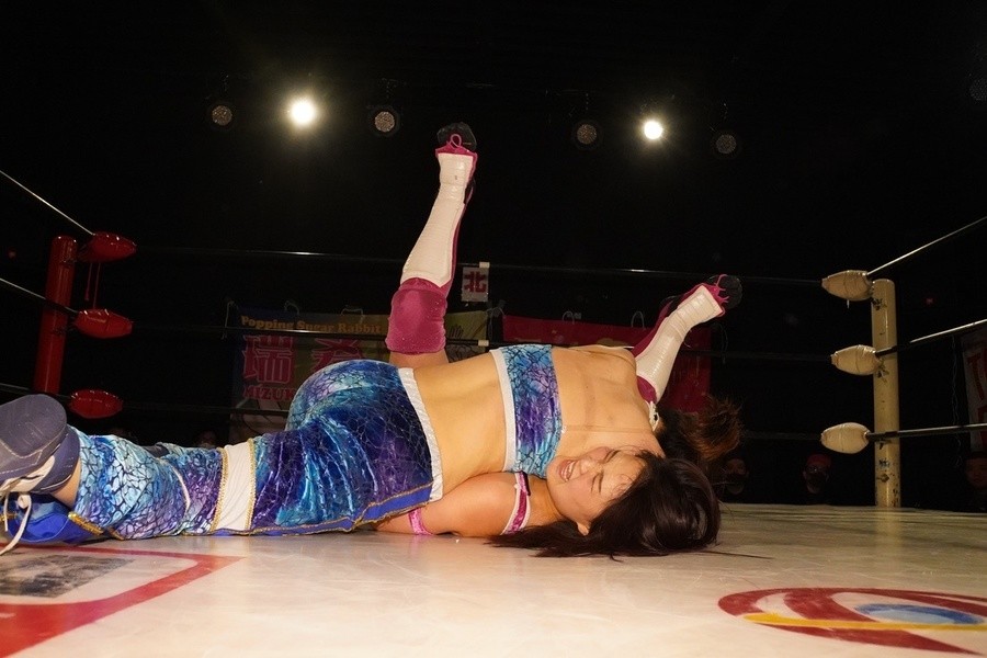 エルボーで向かって行く汐凜だが、ボディスラムで投げさせない魅星は逆にボディスラムを連発。串刺しエルボーからラリアットを狙うが、かわした汐凜はバックエルボーから串刺しエルボー。スクープスラムで叩き付けた汐凜は逆片エビ固めで追い込む。ロープに逃れた魅星はその場跳びドロップキック。串刺しラリアットからショルダータックルでなぎ倒すと、片ヒザを汐凜の背中に押し当てながらのキャメルクラッチに捉える。そこから一気に反りあげて、汐凜からギブアップを奪った。