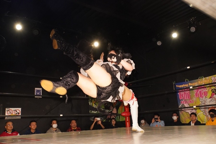 いきなり「前このFC興行で猫と3vs1で試合したんんですけど、その時は負けてしまって。でも今日は1vs1なんですよ。猫が勝てる可能性は1%にも満たないと思うので」と言い出したリカは、ハンデとして観客は全員はるなに声援をしてほしいと言い出す。余裕の笑みを浮かべるリカだが、観客の声援は「猫」一色。リカはそれでもヘッドロックからはるなを踏み付ける。セコンドのアプガプロレスもはるなに激を飛ばす中、リカはブーイングを浴びながら「あー、よっしゃいくぞー!」からのエルボードロップ。さらにはるなの尻尾を引っ張る。はるなもランニング・ネックブリーカーから引っ掻き攻撃を返す。さすがのリカも場外にエスケープするが、セコンドのアプガプロレスがリカを攻撃。パートナーの未詩は場外でボディスラム。ランバージャック状態でリングに戻されたリカだが、ドラスクから足4の字固め。しかしレフェリーの目を盗んでらくが乱入して反転させる。大ピンチのリカだが、怒りのヒップアタックからミサイルヒップ。しかしカウント2でアプガプロレスの3人が乱入してカット。さらに未詩がリカの足をすくい、ヒカリがはるなにカラーバットを渡すと、はるなはバットを振り上げる。だが、リカがかわして未詩に誤爆。それでもらくがリカにブレーンチョップを落とすが、はるなのバット攻撃はまたもリカがかわしてらくに誤爆。動揺するはるなをリカが首固めで丸め込んで3カウント。しかし勝ったリカには大ブーイングが飛んだ。