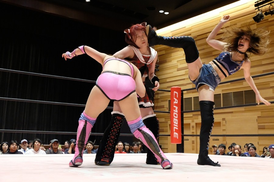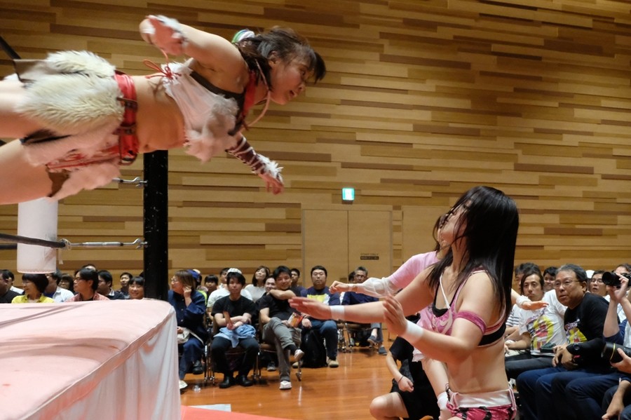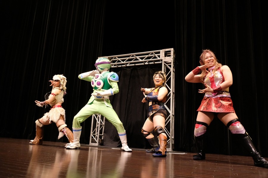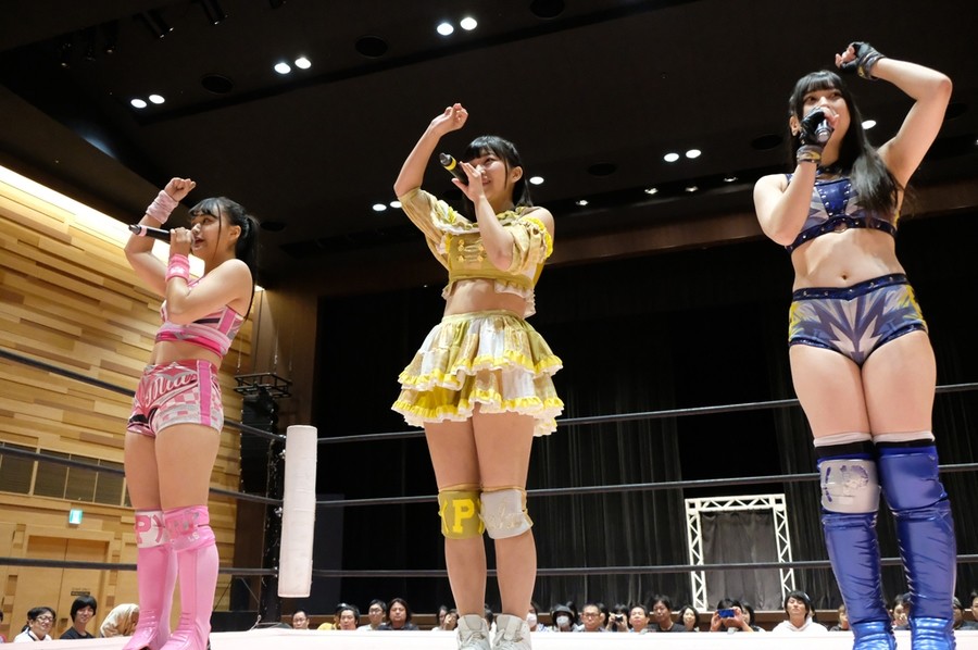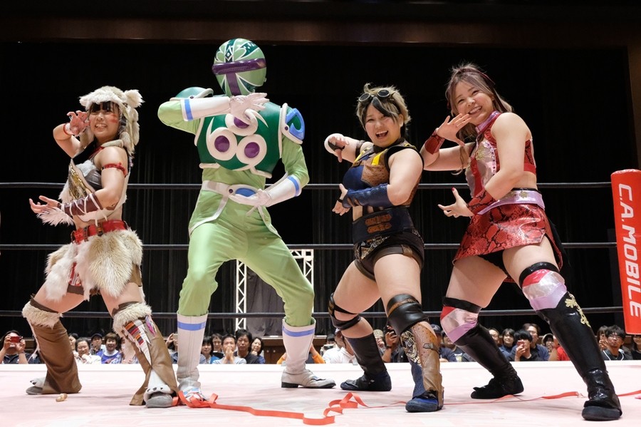 まずはJA戦士シャインが登場。そのあとに東女特撮部が入場して4人でポーズ。シャインがリングインし「会場の皆さん、こんにちは! 今日は東女特撮部を応援するために県北の津山から大都会・岡山にやってきました! この3人なら必ず力をあわせて頑張ります! 応援よろしくお願いします! 私は次の現場があるので失礼します! さよなら!」と挨拶。帰ろうとするシャインを特撮部が引き留めて4人で記念撮影。やはり次の現場が気になるようでシャインは引き揚げていった。東女特撮部の握手を山下組が拒否して奇襲し、試合スタート。場外戦からリングに戻るとリカが攻め込むものどかがショルダーアタックで逆転。替わったユキがショルダーアタックで続く。セントーンをかわしたリカが山下と交替。山下がスナップメイヤーからローキック。これはカウント2。山下のキャメルクラッチはロープに逃げたユキ。ヒカリがコーナーで踏み付け。ユキが自力で回避してショルダーアタックを放つもタッチは山下に阻まれる。ユキは介入したリカともどもドロップキックとブルドッキングヘッドロックの合体技を決めて中島とタッチ。中島が山下にミサイルキック。山下もラリアットで返すと、リカがヒップアタックで続く。コーナー2段目からのミサイルヒップはカウント2。中島はライダーキックで返して619。これはリカがブロックしてドラゴンスクリューから足4の字。コーナーに登ったリカを中島が追いかけて雪崩式フランケン。戦況はのどかvsヒカリに。激しいエルボーの打ち合い。ヒカリがドロップキック。さらに串刺しドロップキックを決めるとコブラツイスト狙い。のどかがかわしてWARスペシャル。ユキが山下をフルネルソン、中島がリカを羽根折り固めでアシスト。なんとか抜け出した山下とリカがのどかに襲い掛かる。ヒカリがミサイルキックからカバーもカウント2。ハーフダウンののどかにコブラツイストものどかが踏ん張って抱え直してフォールアウェイスラム。ユキがカットに入ったリカにサイド・スープレックス。山下にはダブルのショルダーアタック。場外に出た山下に中島がトペ。ヒカリに爆れつブルドッグを完成させるとこれで3カウント。