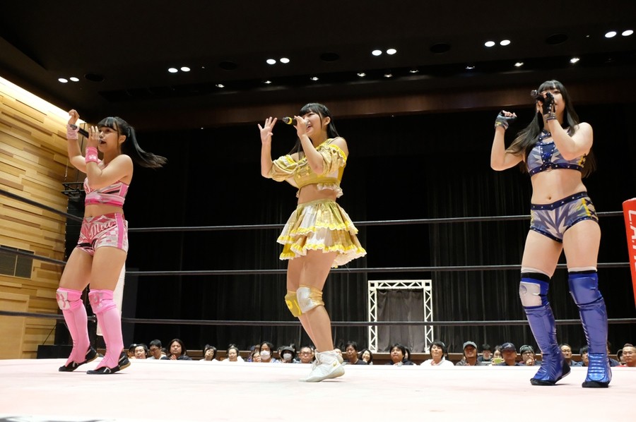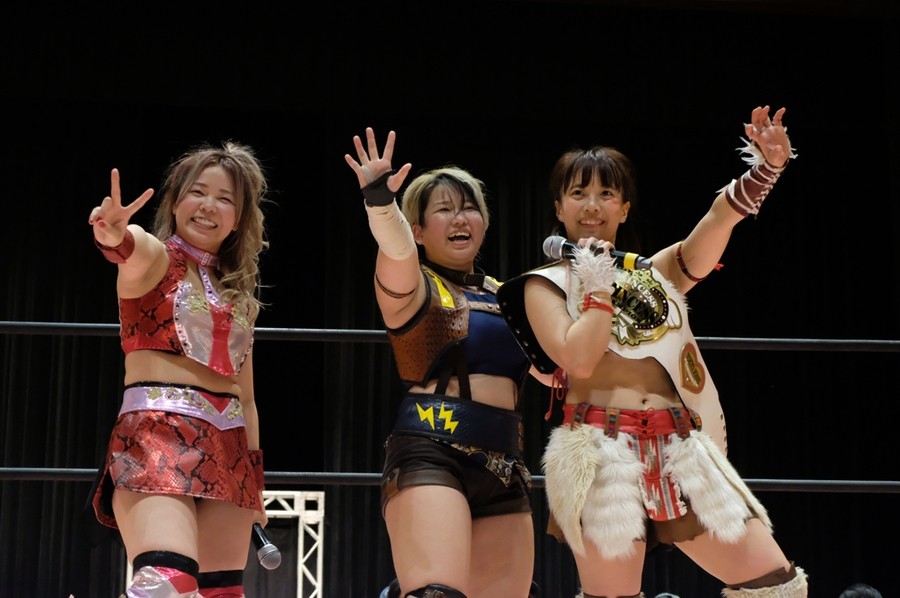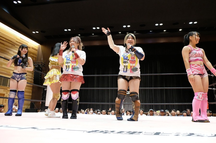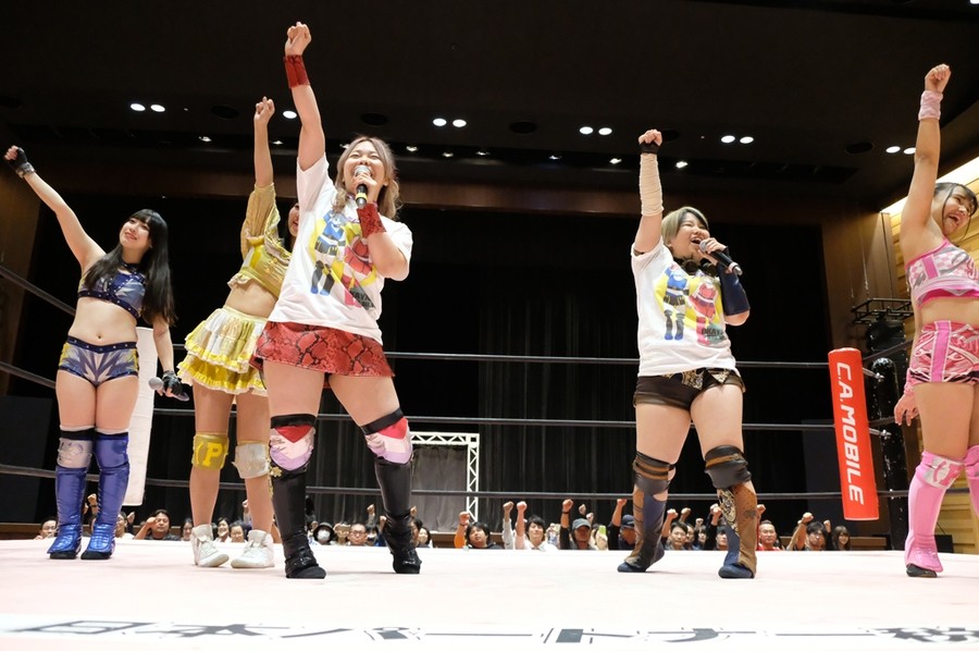 試合後、のどかがマイク。のどか「勝ったぞーい! 東京女子プロレス初の岡山大会、楽しんでいただけましたでしょうか?(場内拍手)ありがとうな。岡山大会のこの会場、今日本で一番盛り上がったと思います! 中島さん、岡山楽しかったですか?」中島「楽しい! こんなにたくさんのお客さんもいて、君たち頑張ったから偉い! お父さん、お母さんも来てるんでしょう?」姉妹「お、おぅ…」中島「なんか娘2人がプロレスやってたら心配も底知れないと思うから、この場を借りてお礼言っといたほうがいいんじゃないの」ユキ「泣いちゃうからやめてください」のどか「じゃあユキちゃん言いなよ」ユキ「今、私声ガサガサやのに。え~と…お父さん、お母さん、いつもたくさん心配かけてごめんなさい。大好きです。ありがとうございます」のどか「岡山大会ということで私たちがポスター貼りにいったり、チラシを置かせてもらいにご挨拶にいったりさせてもらいました。正直、私は岡山という街が、ほかの県から遊びにきなよと言うほど魅力があると思ってませんでした。岡山って何もないじゃん!って思ってたけど、この営業を通して岡山、いいところがいっぱいあるなあと、岡山、いい街だなあと改めて大好きになりました。今日は県外からたくさんの方が来てくれていると思いますが、是非岡山の美味しいものを食べていただいて、岡山を楽しんでください。私は今日どうしても言いたいことがあります。2020年の10月4日、2回目の岡山大会が決まりましたー! やったー! 第1回、皆さんが集まってくれたおかげですよ」最後は「爆れつ!」と観客の皆さんと拳を突き上げて締め。