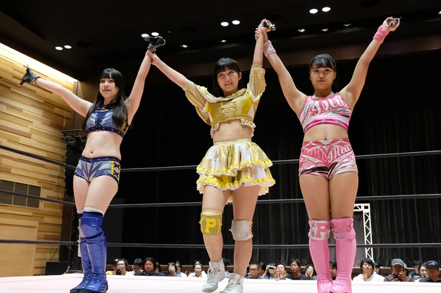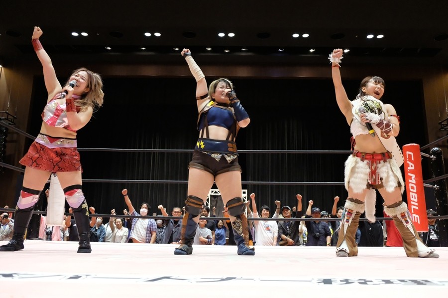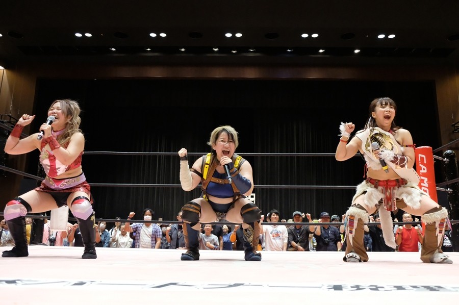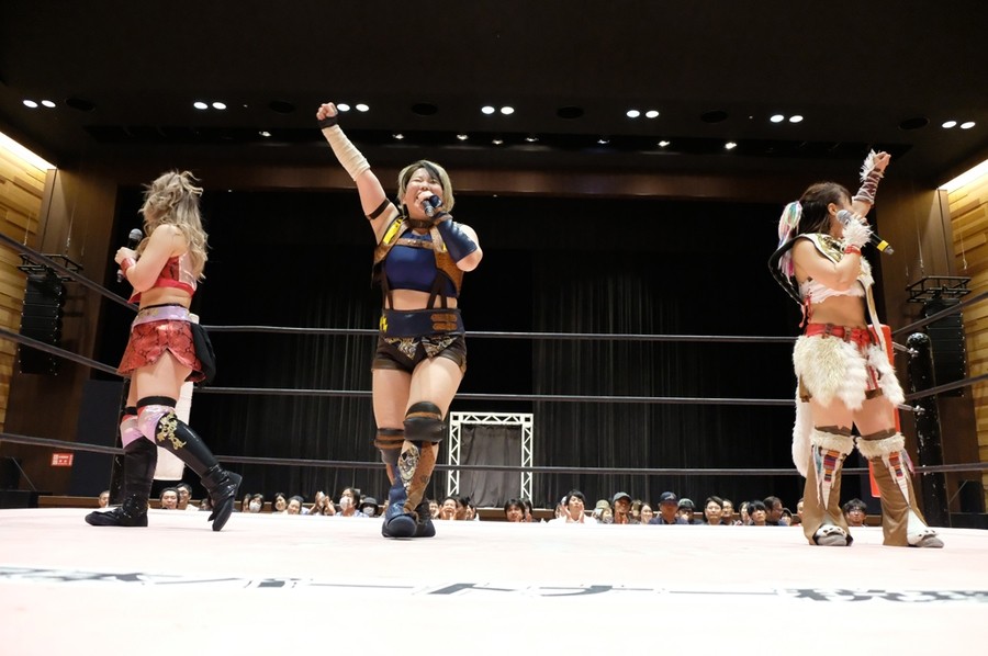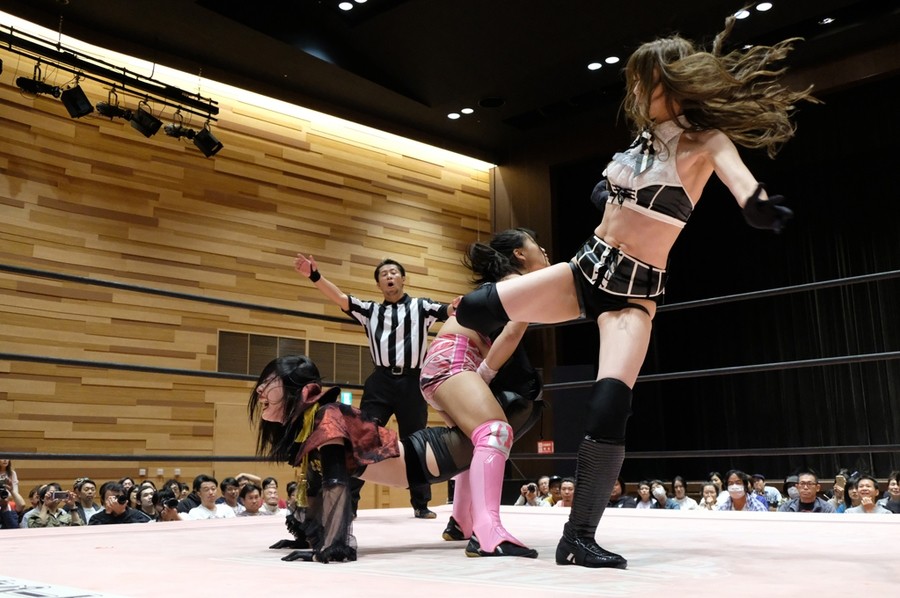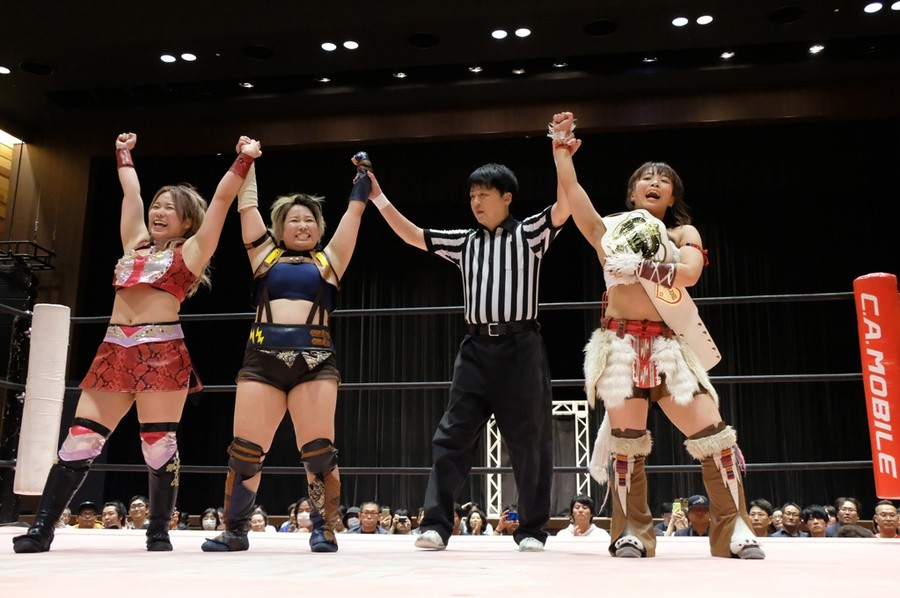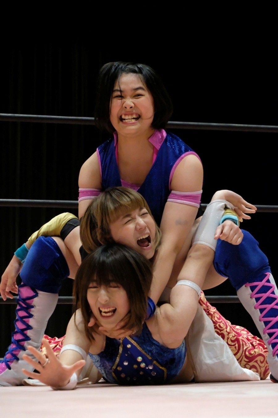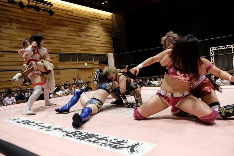 白川とぽむの先発でスタート。上福vs伊藤では上福のサミングを伊藤がかわしていく。頭脳でドヤる伊藤に上福がサミングからコーナーにぶつけるも、伊藤が石頭をアピールして上福に頭突き。ぽむがハンマーパンチ連打で続く。ローンバトルを強いられた上福だったが、ぽむにビッグブーツを見舞って白川とタッチ。白川がクロスチョップ連打。テーズプレスはカウント2。さらに「チャンス~」からロメロスペシャル。逃れたぽむはカウンターのボディースラムを見舞って伊藤とタッチ。伊藤は串刺しのロケット頭突きから世界一かわいいナックル、倒れ込み式ヘッドバットはカウント2。伊藤が白川の腕を取ってDDT。逆エビ狙いは白川がかわしてバックブロー。戦況は上福vsぽむ。ぽむがスネ蹴り。カウント2で返されると人工衛星ヘッドシザース狙いもかわされてしまう。上福はカウンターのビッグブーツからドロップキック。このカバーは伊藤がカット。伊藤を白川との連係で排除した上福はぽむのぽむ・ど・じゃすてぃすをかわすとフェイマサーで勝利。