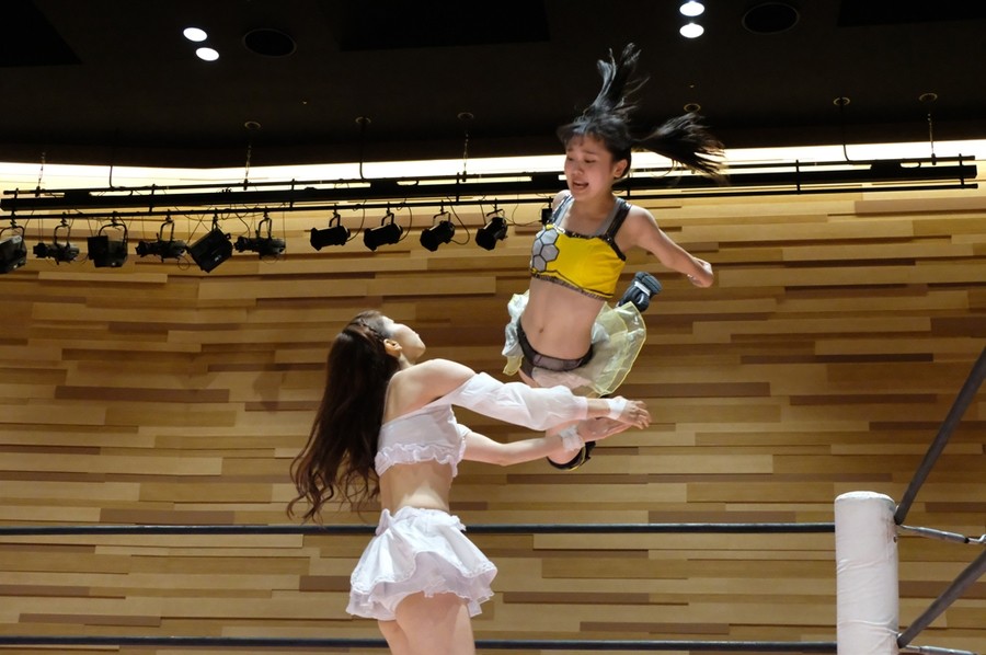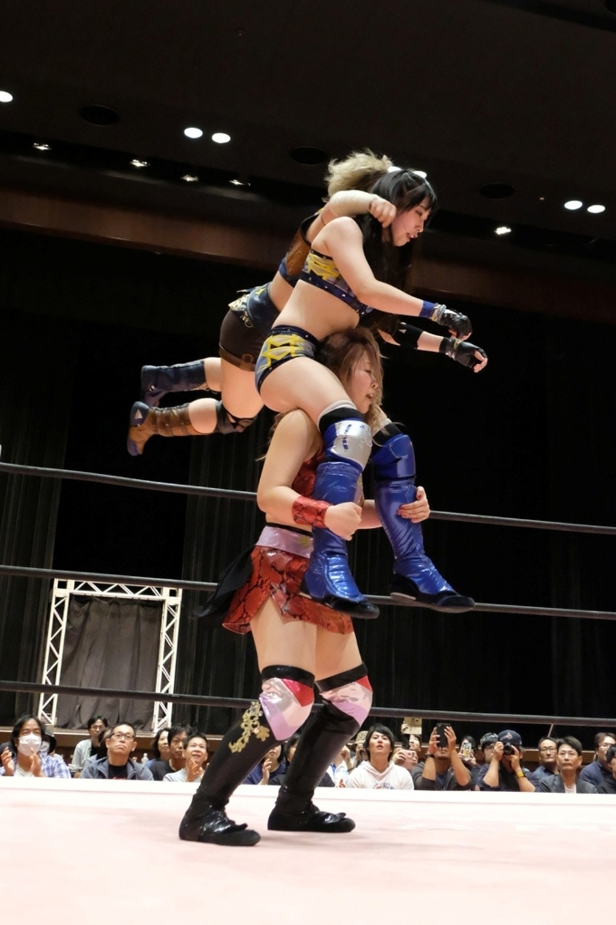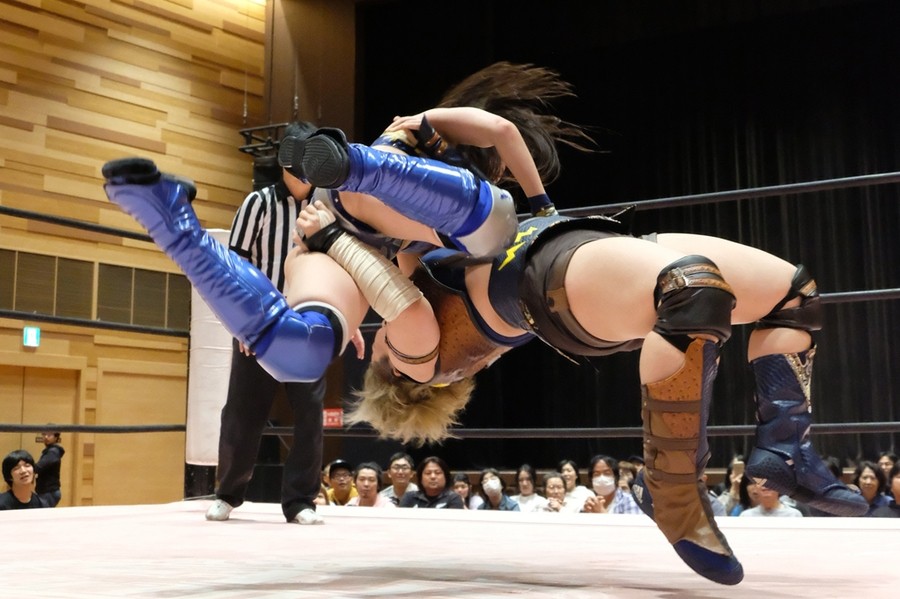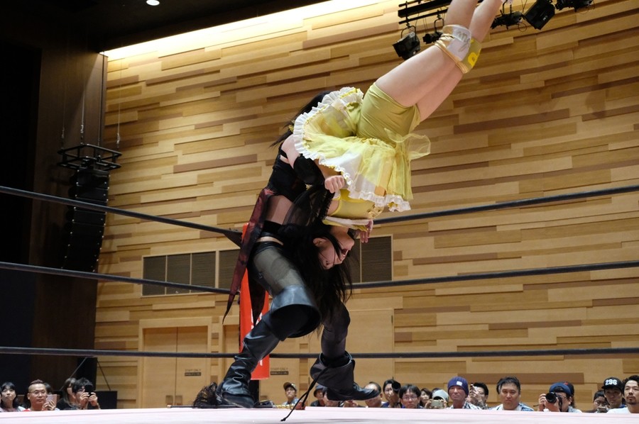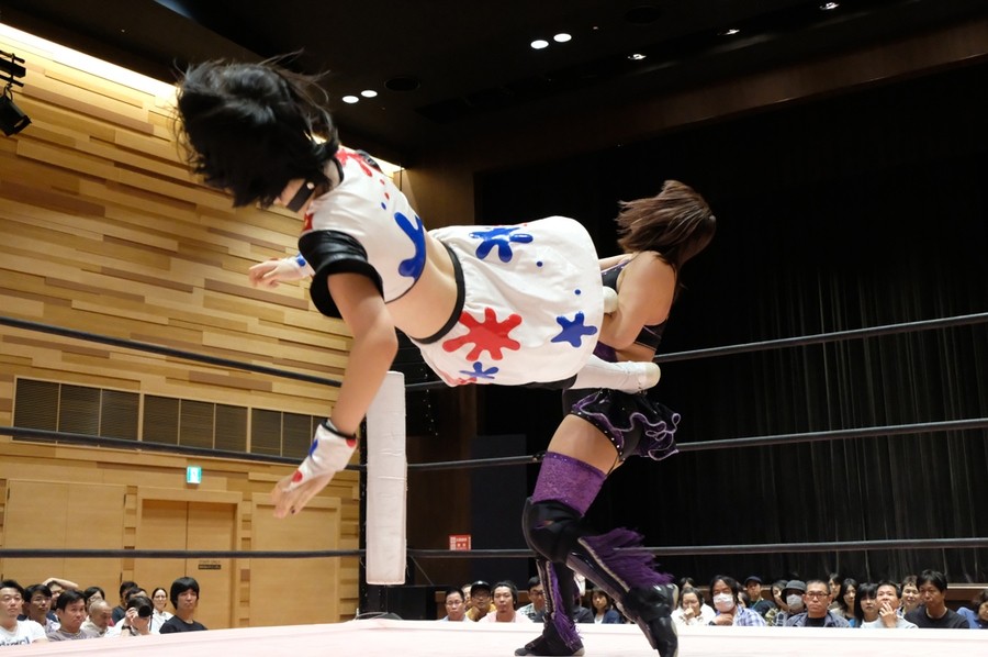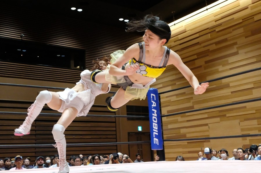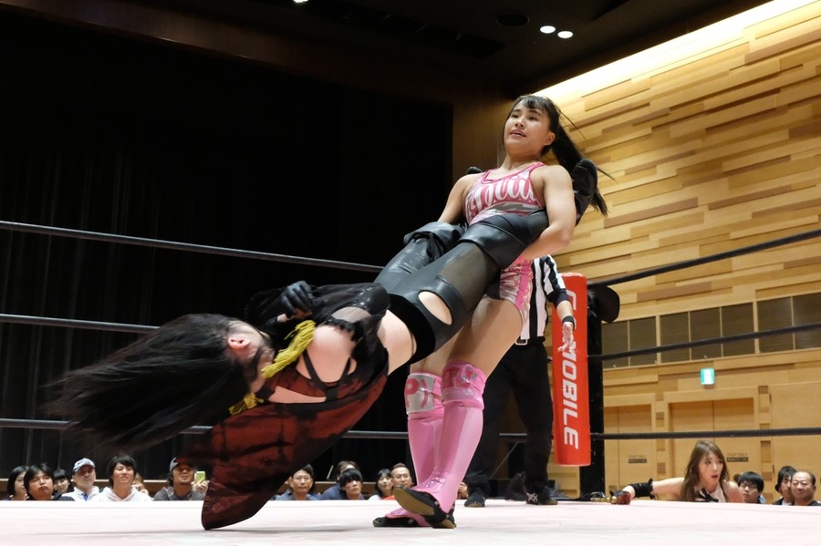 鈴芽がアームホイップからドロップキック。串刺しバックエルボーからカバーするも、カウント2でブリッジした瑞希がすぐにフットスタンプ。サーフボードに苦しむ鈴芽。キャメルクラッチを仕掛けるも、逆にキャメルクラッチを決められてしまう。なんとかロープに逃げた鈴芽はバックエルボーで動きを止めてドロップキックを放つ。ボディースラムで叩きつけるもカウント2。瑞希は鈴芽をセカンドロープに引っ掛けると背中にドロップキック。フェースロックは鈴芽が丸め込み、さらにバックスライドはカウント2。フェースクラッシャーからダイビング・ボディーアタックを浴びせるもカウント2。ロープに振られた瑞希はドロップキック一発で流れを変え、ダイビング・ボディーアタック。カウント2で返されるやフェースロックで勝利。