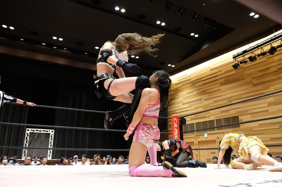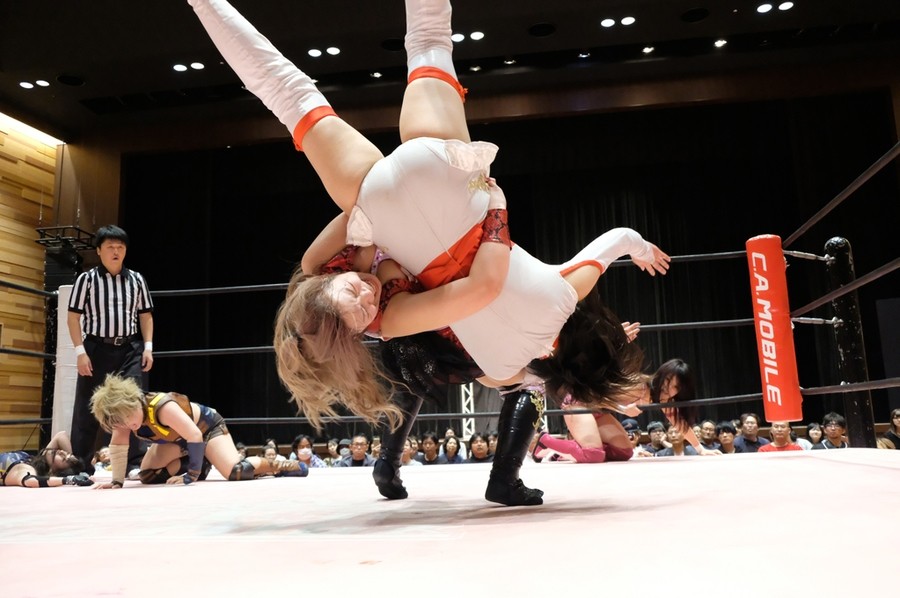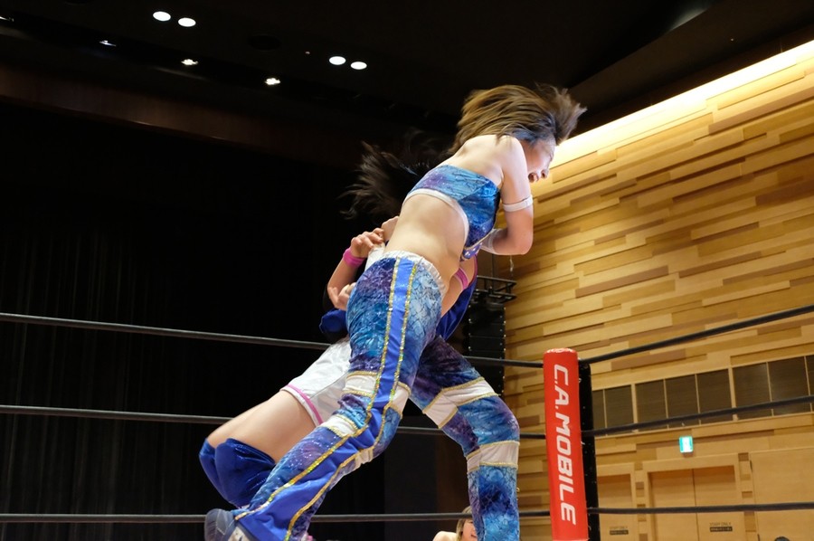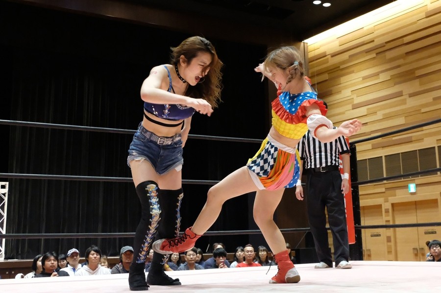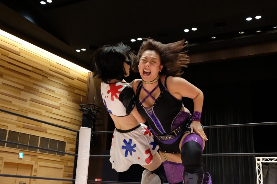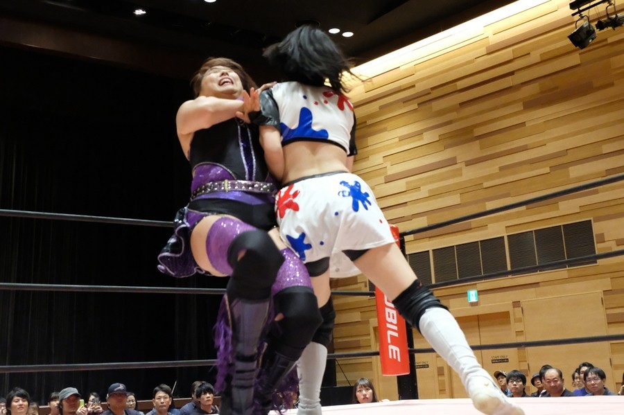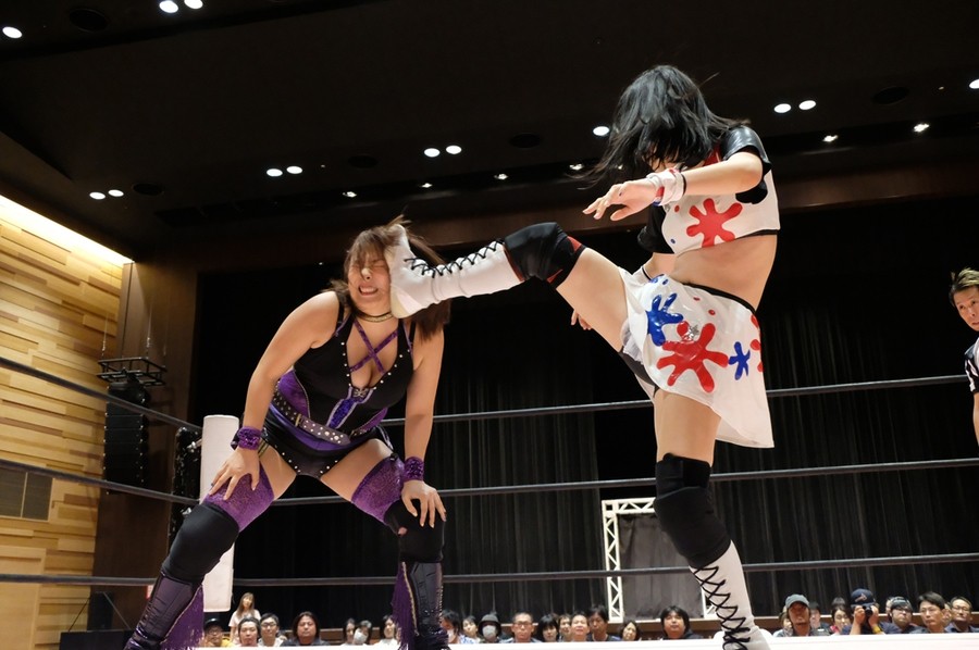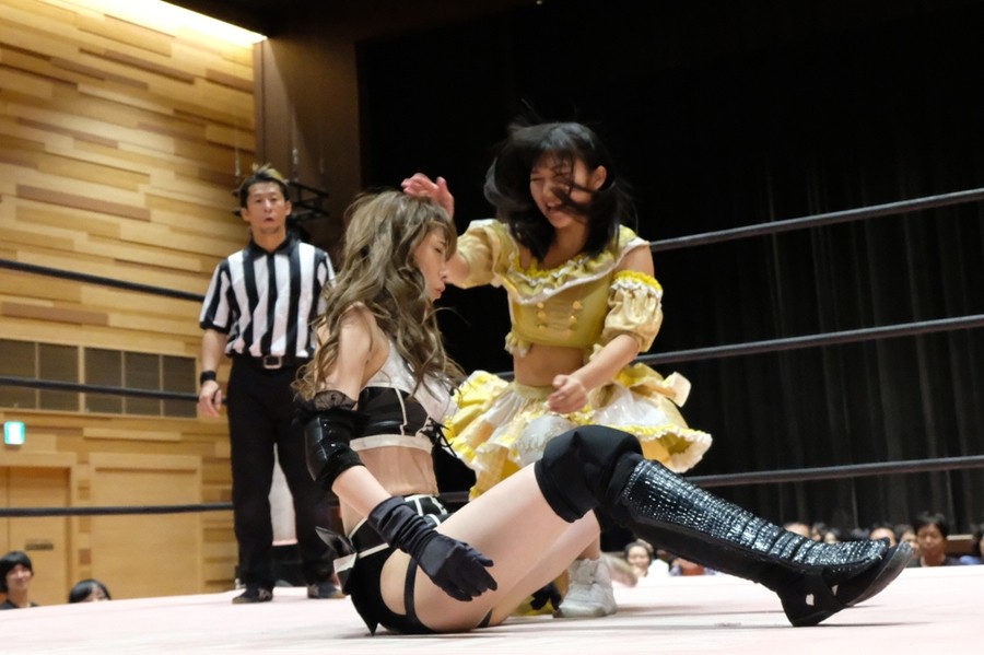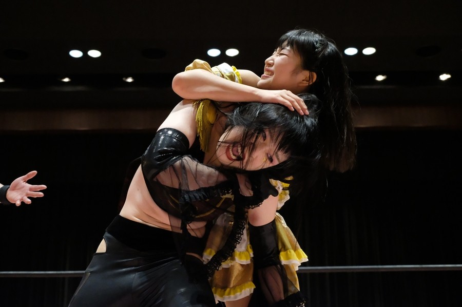 まなせがYUMIにショルダーアタックで攻勢。ヘアーホイップからコーナー踏み付け、ボディースラムと攻め立てる。苦しいYUMIはショルダーアタックでなんとかまなせを倒すことに成功。ヘッドロック、サーフボードで絞っていくと、ハーフダウンのまなせにドロップキック。このカバーはカウント2。ビッグブーツの打ち合いからフルネルソンの攻防。YUMIがドロップキックもカウント2。向かってきたYUMIにまなせがラリアット。鈴木ダイナミックでフォール勝ち。