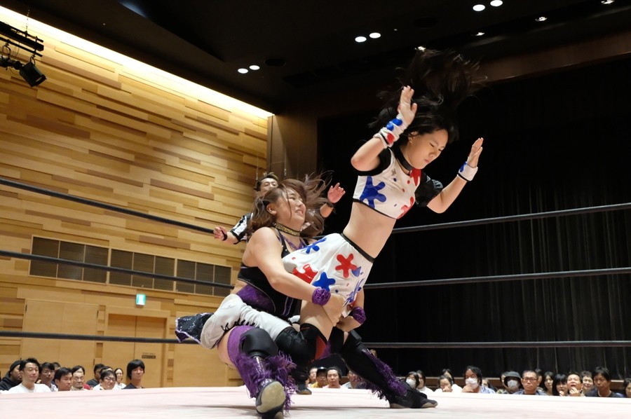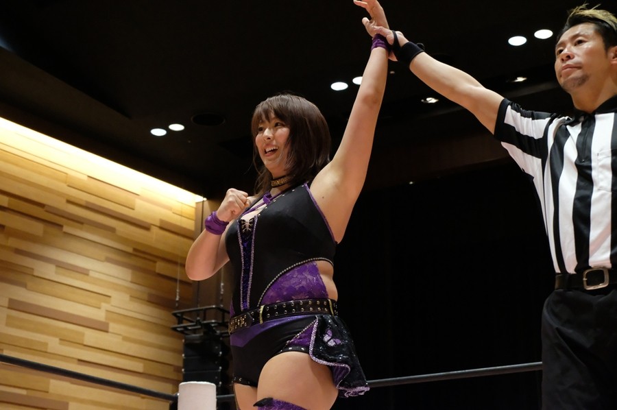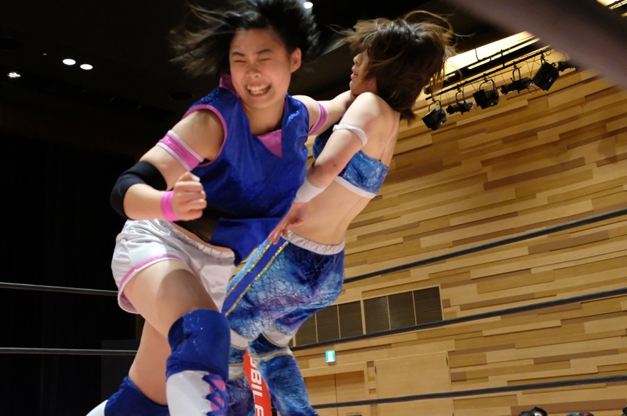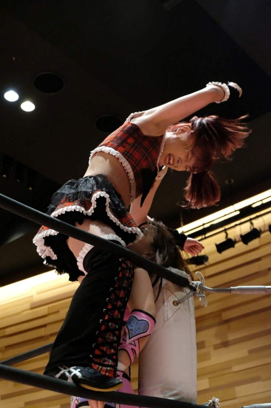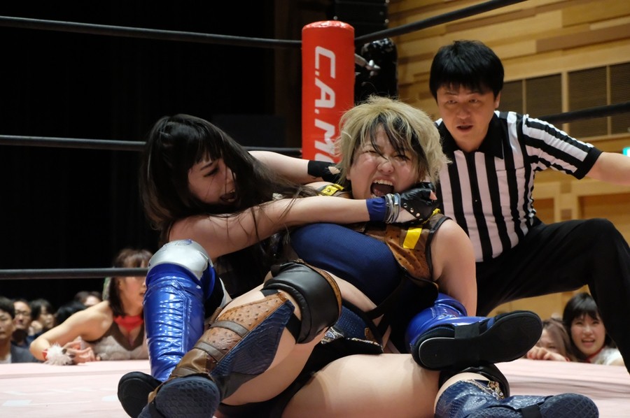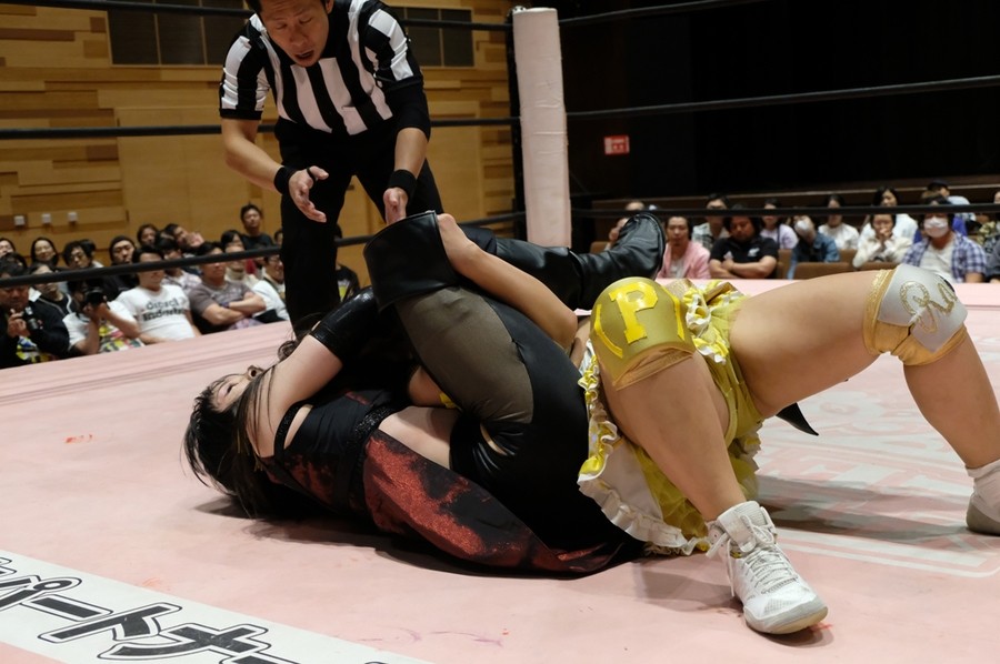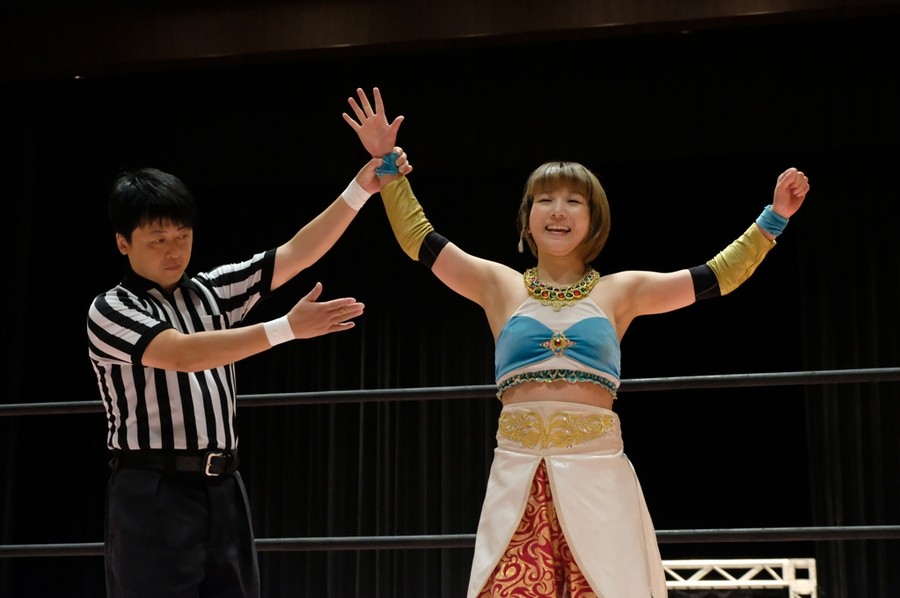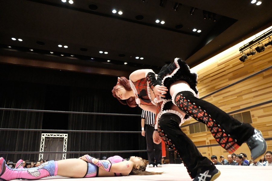 まなせがYUMIにショルダーアタックで攻勢。ヘアーホイップからコーナー踏み付け、ボディースラムと攻め立てる。苦しいYUMIはショルダーアタックでなんとかまなせを倒すことに成功。ヘッドロック、サーフボードで絞っていくと、ハーフダウンのまなせにドロップキック。このカバーはカウント2。ビッグブーツの打ち合いからフルネルソンの攻防。YUMIがドロップキックもカウント2。向かってきたYUMIにまなせがラリアット。鈴木ダイナミックでフォール勝ち。