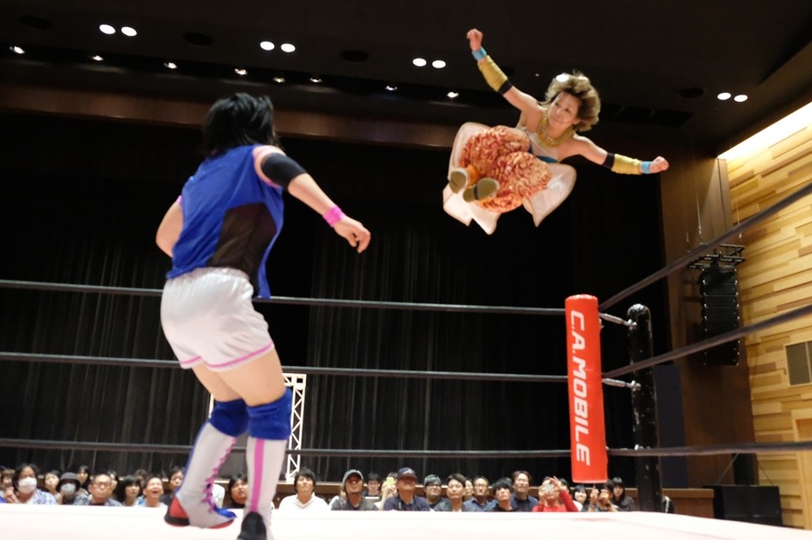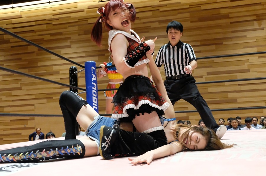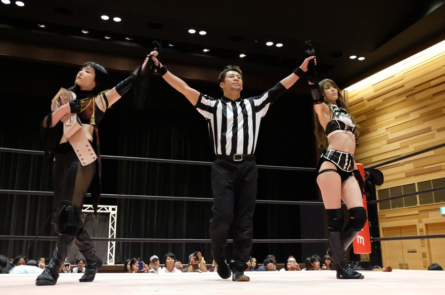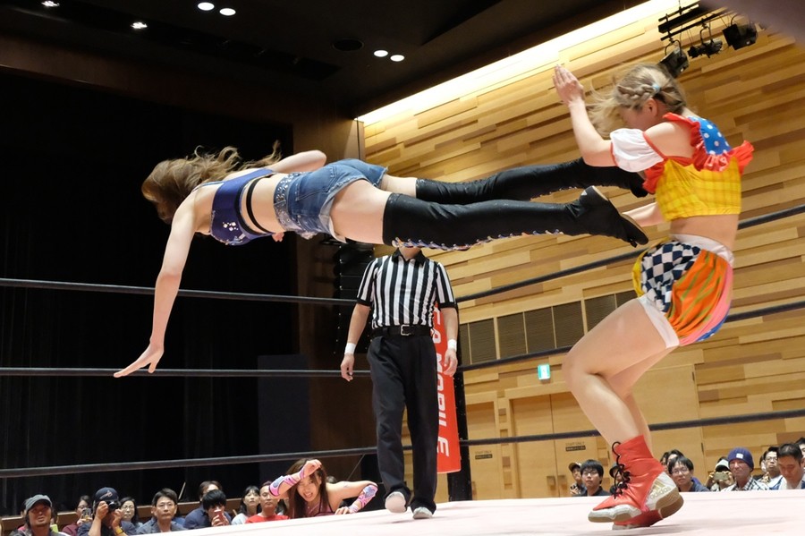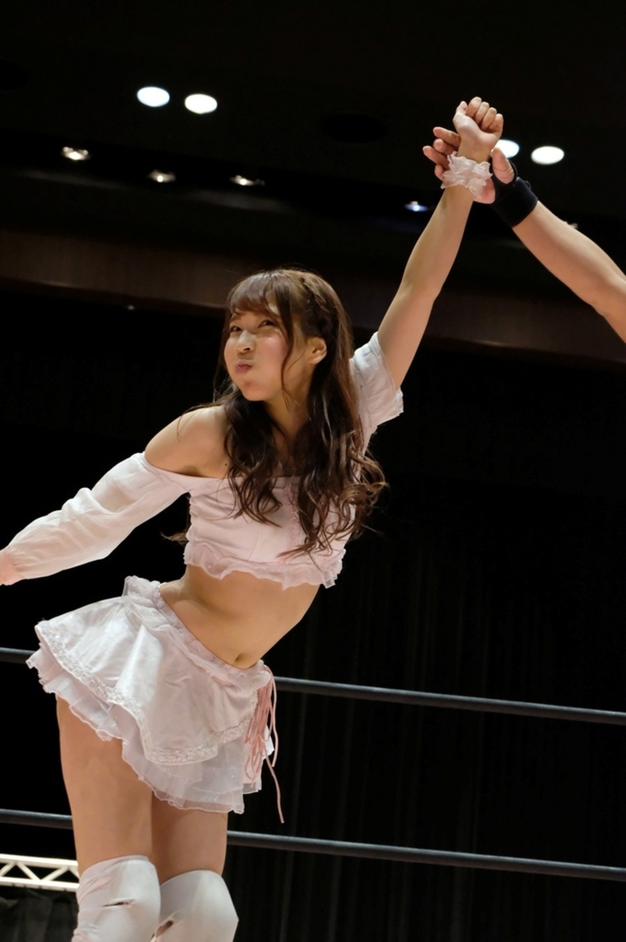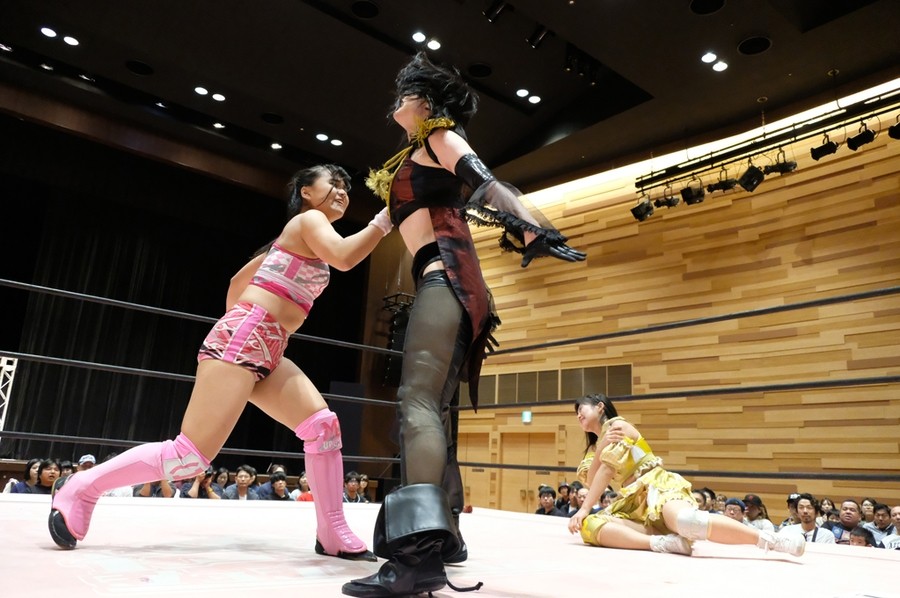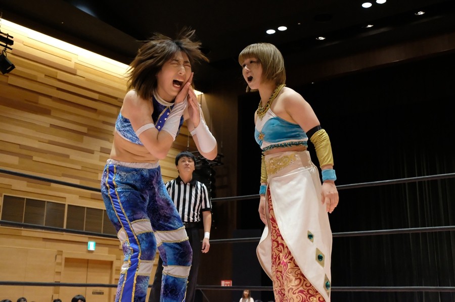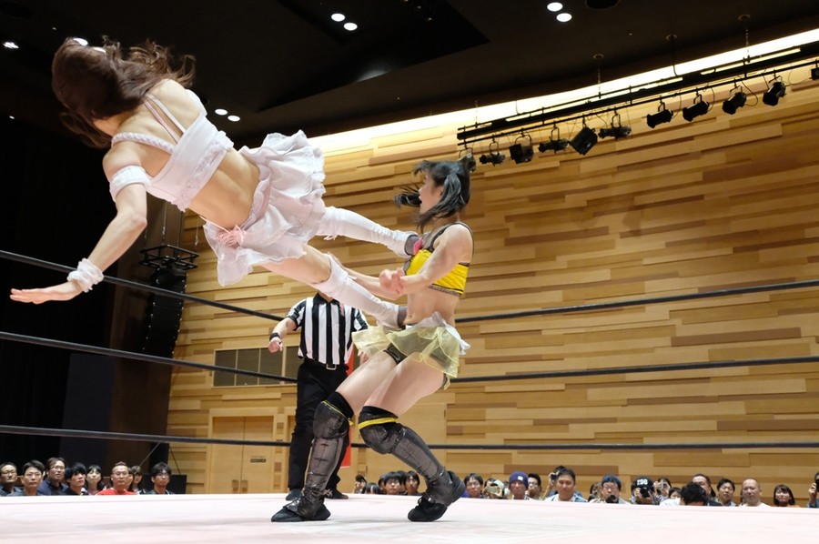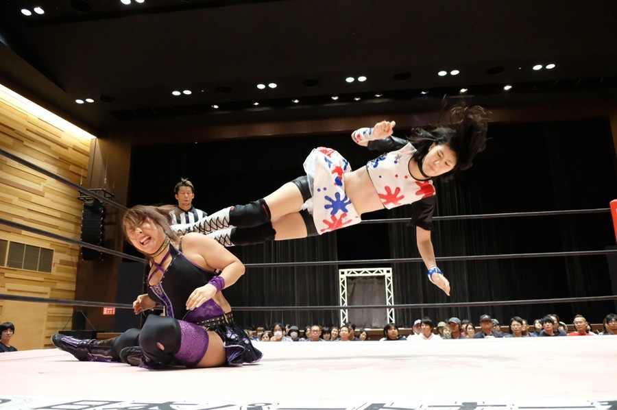 まなせがYUMIにショルダーアタックで攻勢。ヘアーホイップからコーナー踏み付け、ボディースラムと攻め立てる。苦しいYUMIはショルダーアタックでなんとかまなせを倒すことに成功。ヘッドロック、サーフボードで絞っていくと、ハーフダウンのまなせにドロップキック。このカバーはカウント2。ビッグブーツの打ち合いからフルネルソンの攻防。YUMIがドロップキックもカウント2。向かってきたYUMIにまなせがラリアット。鈴木ダイナミックでフォール勝ち。