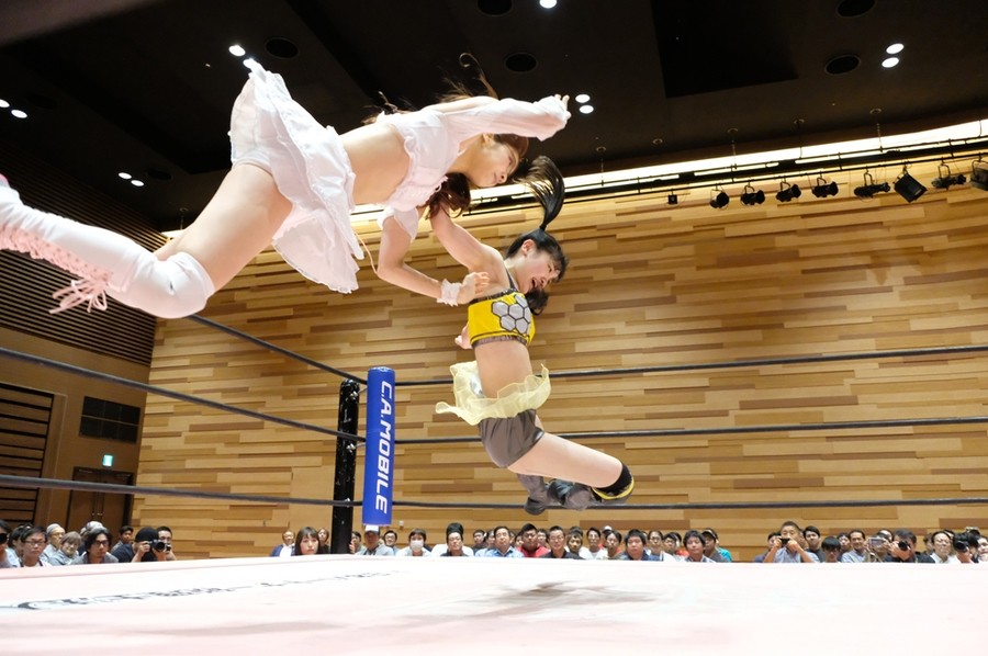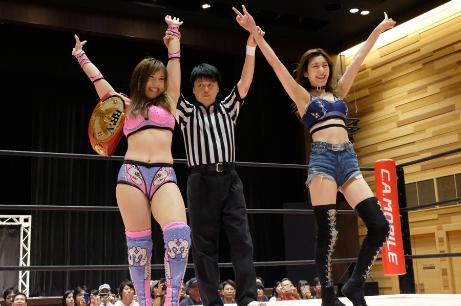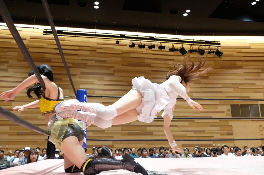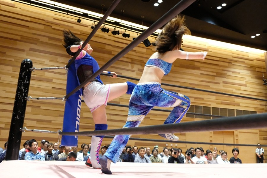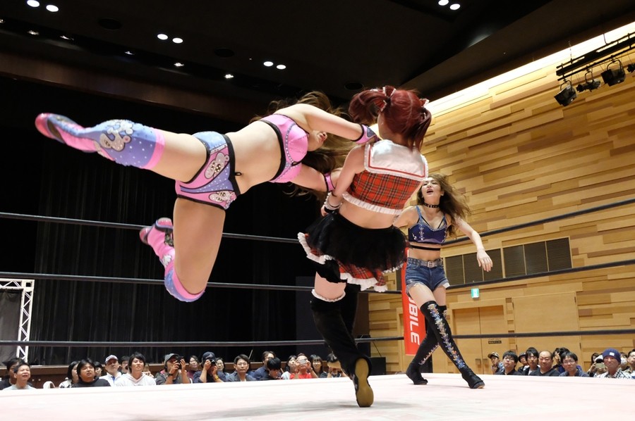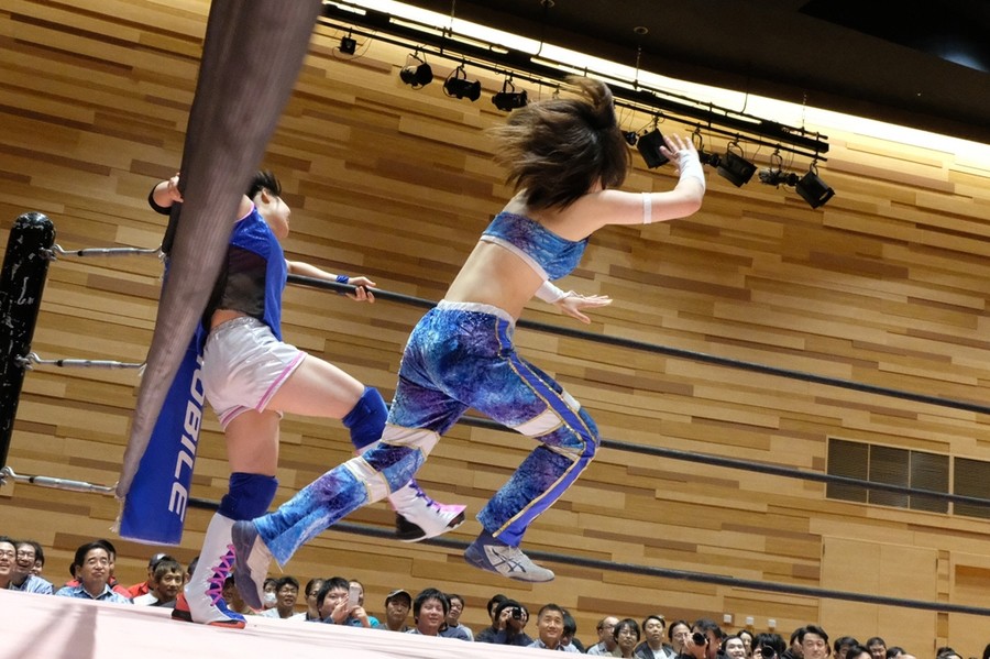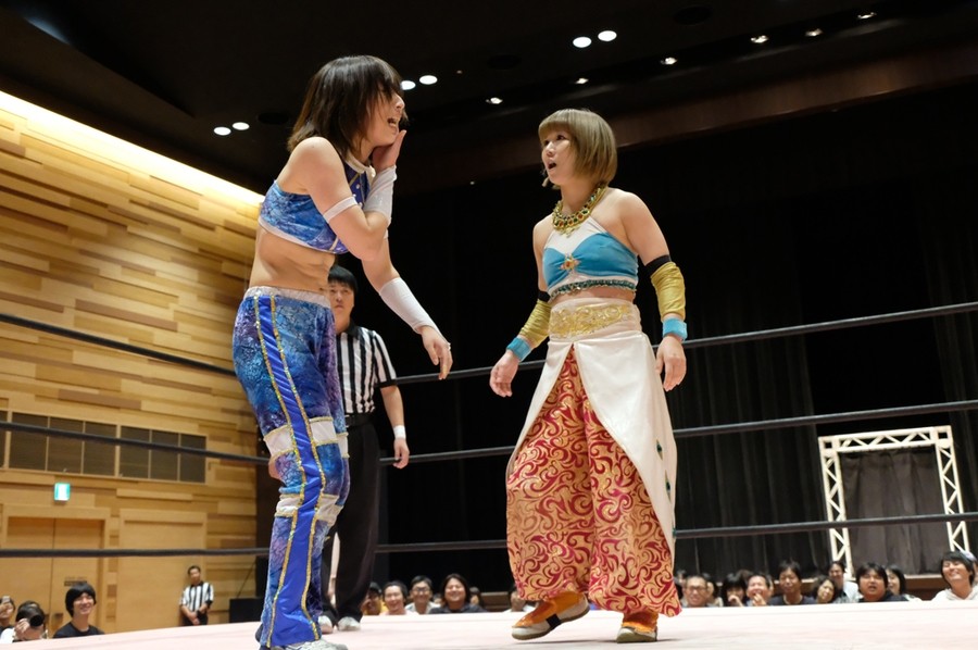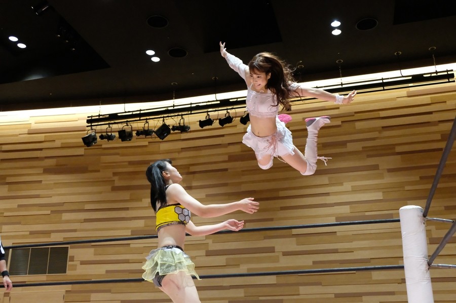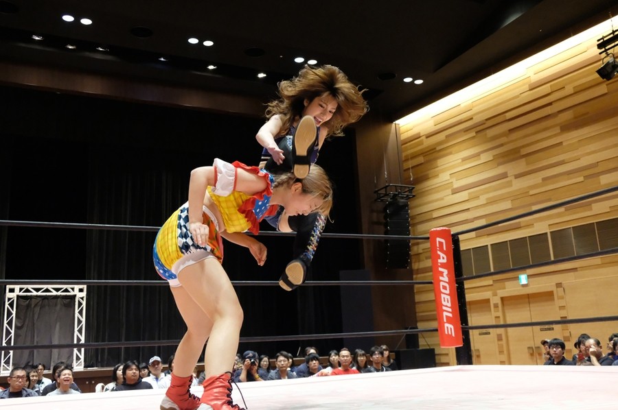 まなせがYUMIにショルダーアタックで攻勢。ヘアーホイップからコーナー踏み付け、ボディースラムと攻め立てる。苦しいYUMIはショルダーアタックでなんとかまなせを倒すことに成功。ヘッドロック、サーフボードで絞っていくと、ハーフダウンのまなせにドロップキック。このカバーはカウント2。ビッグブーツの打ち合いからフルネルソンの攻防。YUMIがドロップキックもカウント2。向かってきたYUMIにまなせがラリアット。鈴木ダイナミックでフォール勝ち。