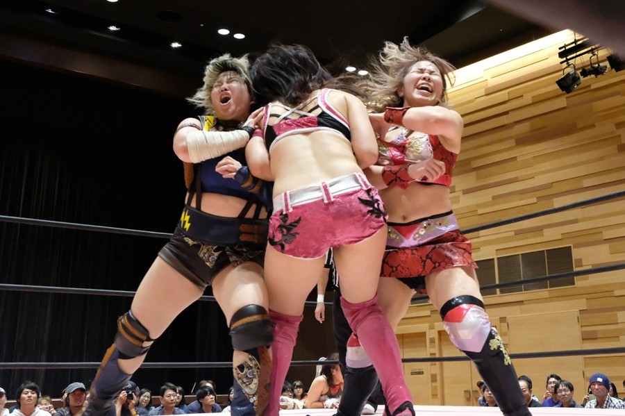 坂崎と真弥の連係を魅星が分断。2人をボディースラムで重ねてまとめてキャメルクラッチ。坂崎と真弥で魅星にストンピング。坂崎が真弥を串刺し攻撃で魅星に振るが何度も顔面フロントハイキックで阻止され、そのたびに坂崎にビンタされる。そんな真弥を排除した坂崎は魅星にダイヤル固め。魅星の足を極める坂崎に真弥がストンピング。ボディースラムから逆エビ固めは魅星がカット。魅星は坂崎をリング外に追いやると真弥にボディースラム。坂崎と真弥でバックの取り合い。そこに魅星が加わっていく。コーナーに2人を潰した魅星が坂崎にドロップキック。真弥と魅星がエルボーの打ち合い。真弥はショルダーアタックで倒すと魅星はラリアットでやり返し、坂崎がミサイルキックを魅星に突き刺す。坂崎は真弥にブレーンバスターからスライディング・ラリアットを放って勝利した。