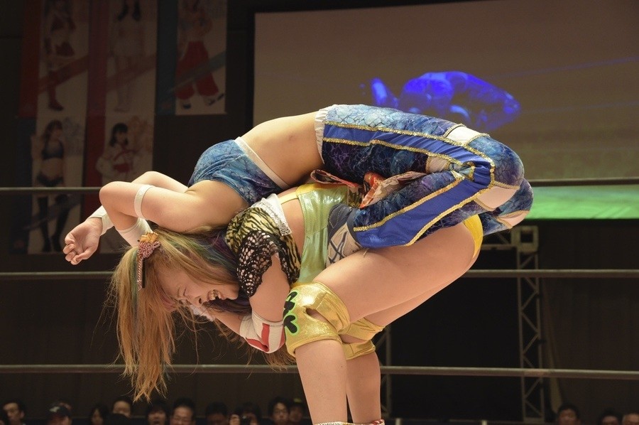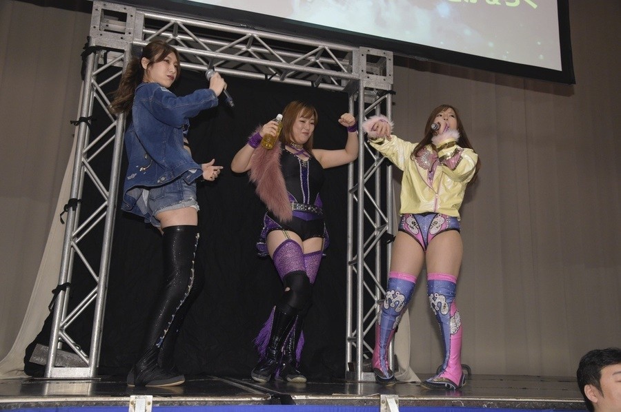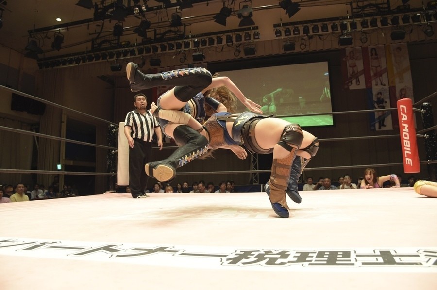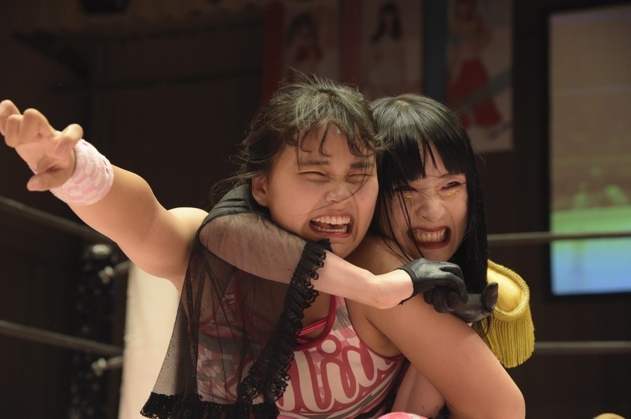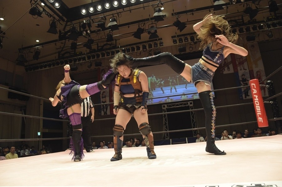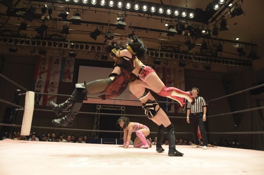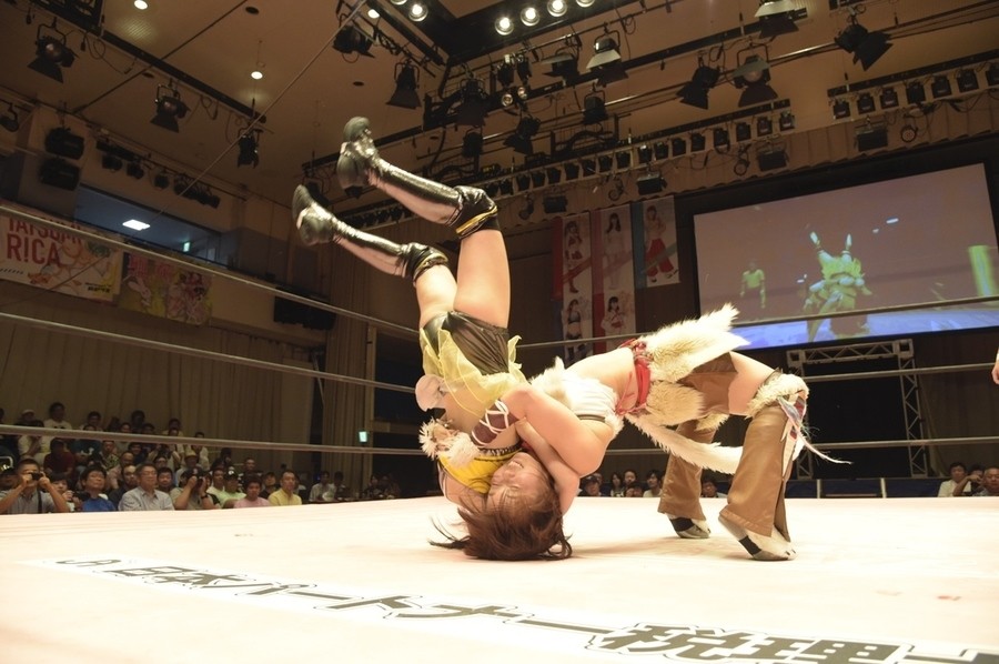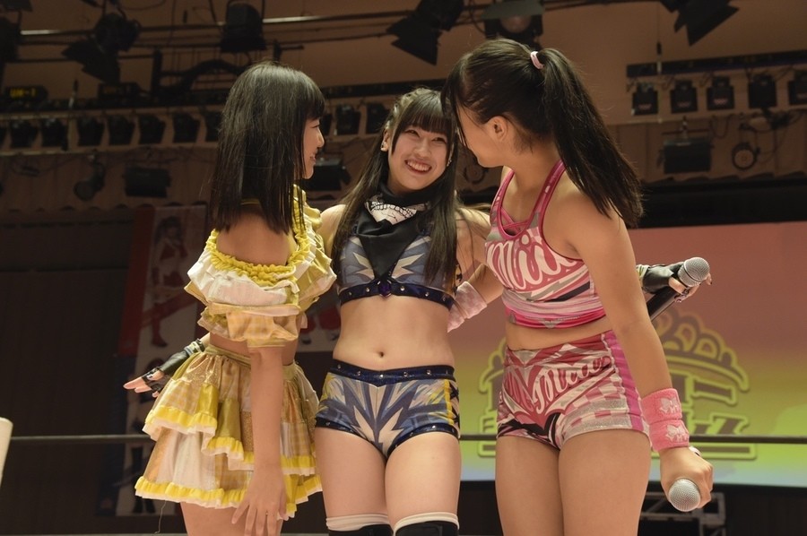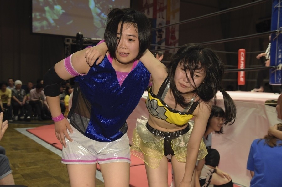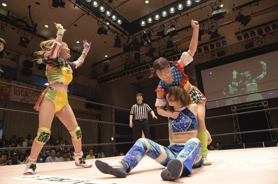 ネックシザースに捉えられたうなぎは倒立=シンクロポーズで脱出しポージング。ぽむも入ってわっしょいわっしょい。リズムに合わせて真弥にぽむがパンチ。ラフォーレ原宿も決まる。YUMIはコーナーにぽむを打ち付けると対角線で勢いをつけヒップトス。真弥はコーナーへバックエルボー。ボディスラムも成功。YUMIにチェンジしてバックエルボー、スリーパー。カウンターでブーツも。そこから再度スリーパーへ。ブーツをかわしたぽむはロープに登ってアームホイップ。ここでうなぎにタッチ。YUMIとのタックルの打ち合いを制すと連続回転バックスピンキック。真弥の逆エビはうなぎが阻止し大ふへん固め。ここはYUMIがカット。真弥はうなぎにボディスラムから逆エビ。今度はぽむがカット。話さない真弥に雄叫びをあげてぶつかるぽむ。だがぽむ・ど・じゃすてぃすはかわされる。うなぎと真弥がエルボー打ち合い。真弥はスパインバスター。うなぎはボディスラムからギロチン。先に立ち上がったうなぎは大ふへん固めを決め、ここで真弥がギブアップ。