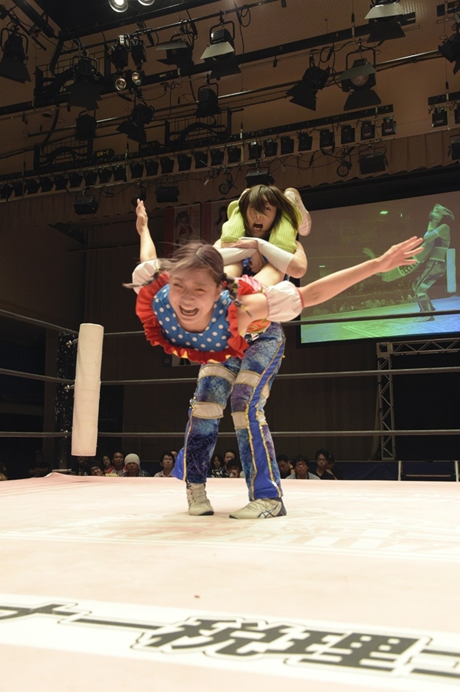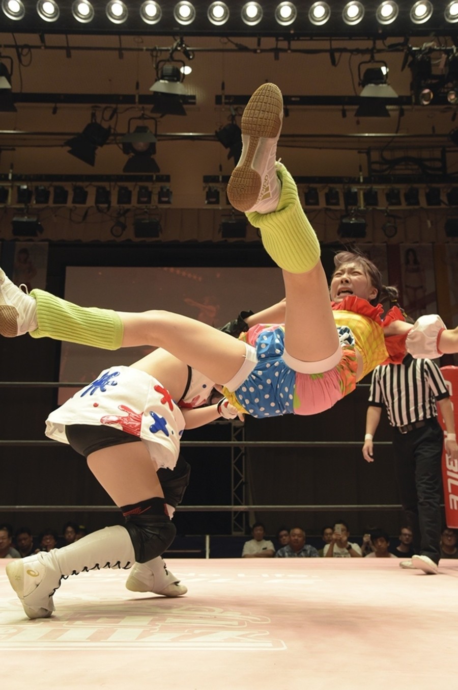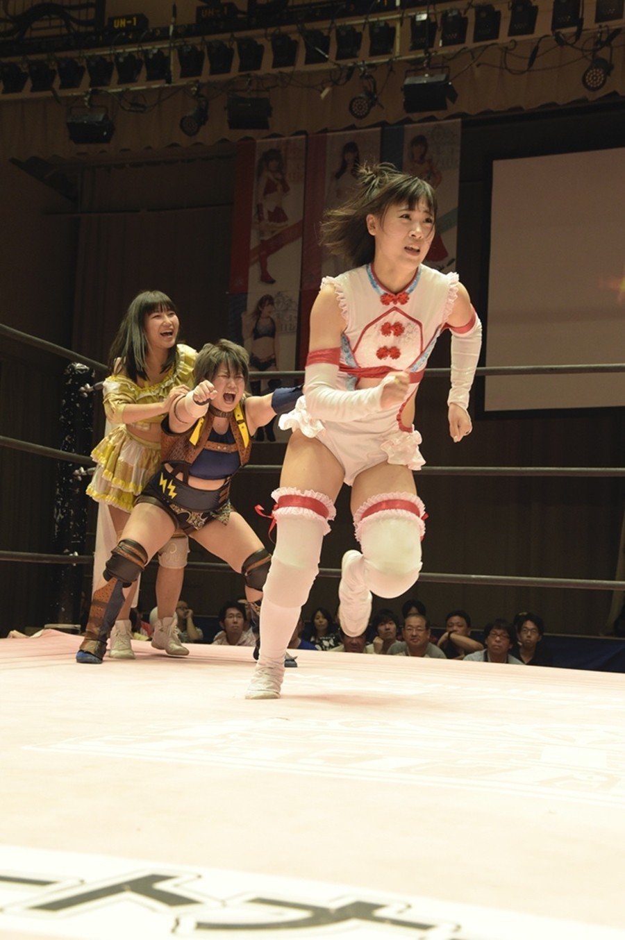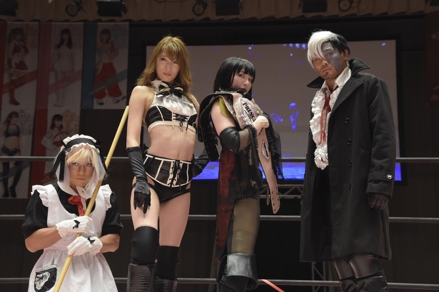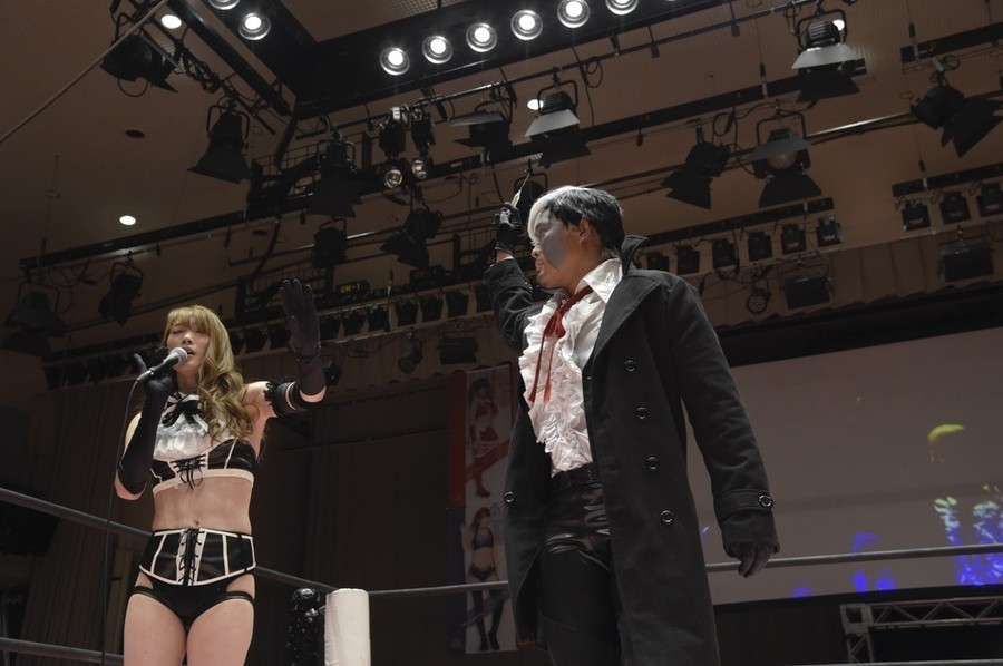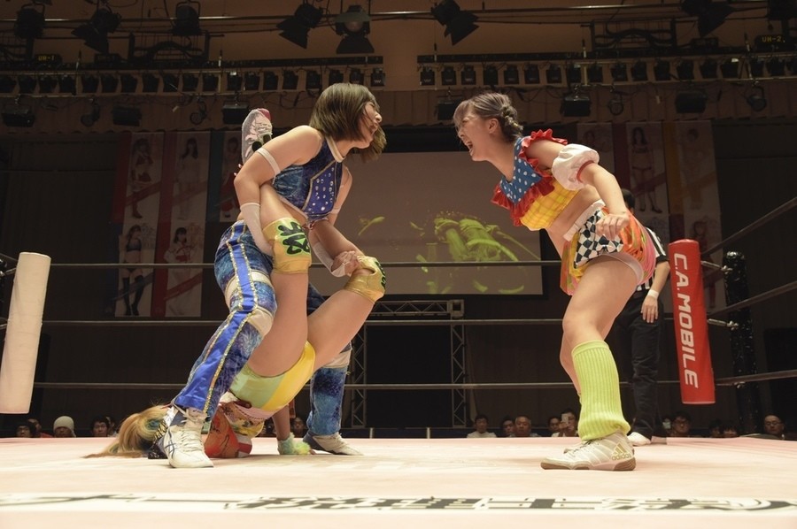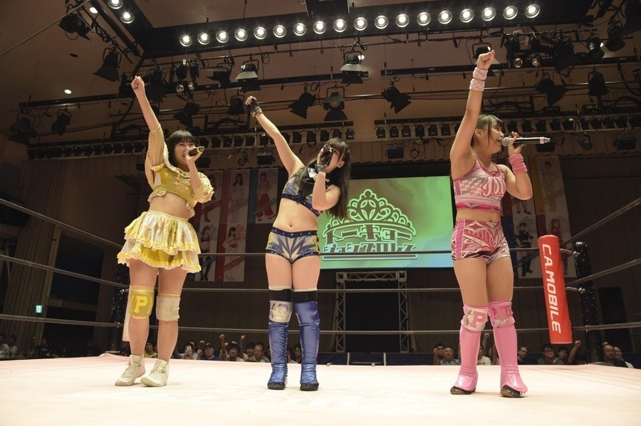 ネックシザースに捉えられたうなぎは倒立=シンクロポーズで脱出しポージング。ぽむも入ってわっしょいわっしょい。リズムに合わせて真弥にぽむがパンチ。ラフォーレ原宿も決まる。YUMIはコーナーにぽむを打ち付けると対角線で勢いをつけヒップトス。真弥はコーナーへバックエルボー。ボディスラムも成功。YUMIにチェンジしてバックエルボー、スリーパー。カウンターでブーツも。そこから再度スリーパーへ。ブーツをかわしたぽむはロープに登ってアームホイップ。ここでうなぎにタッチ。YUMIとのタックルの打ち合いを制すと連続回転バックスピンキック。真弥の逆エビはうなぎが阻止し大ふへん固め。ここはYUMIがカット。真弥はうなぎにボディスラムから逆エビ。今度はぽむがカット。話さない真弥に雄叫びをあげてぶつかるぽむ。だがぽむ・ど・じゃすてぃすはかわされる。うなぎと真弥がエルボー打ち合い。真弥はスパインバスター。うなぎはボディスラムからギロチン。先に立ち上がったうなぎは大ふへん固めを決め、ここで真弥がギブアップ。