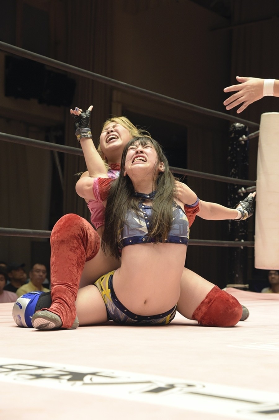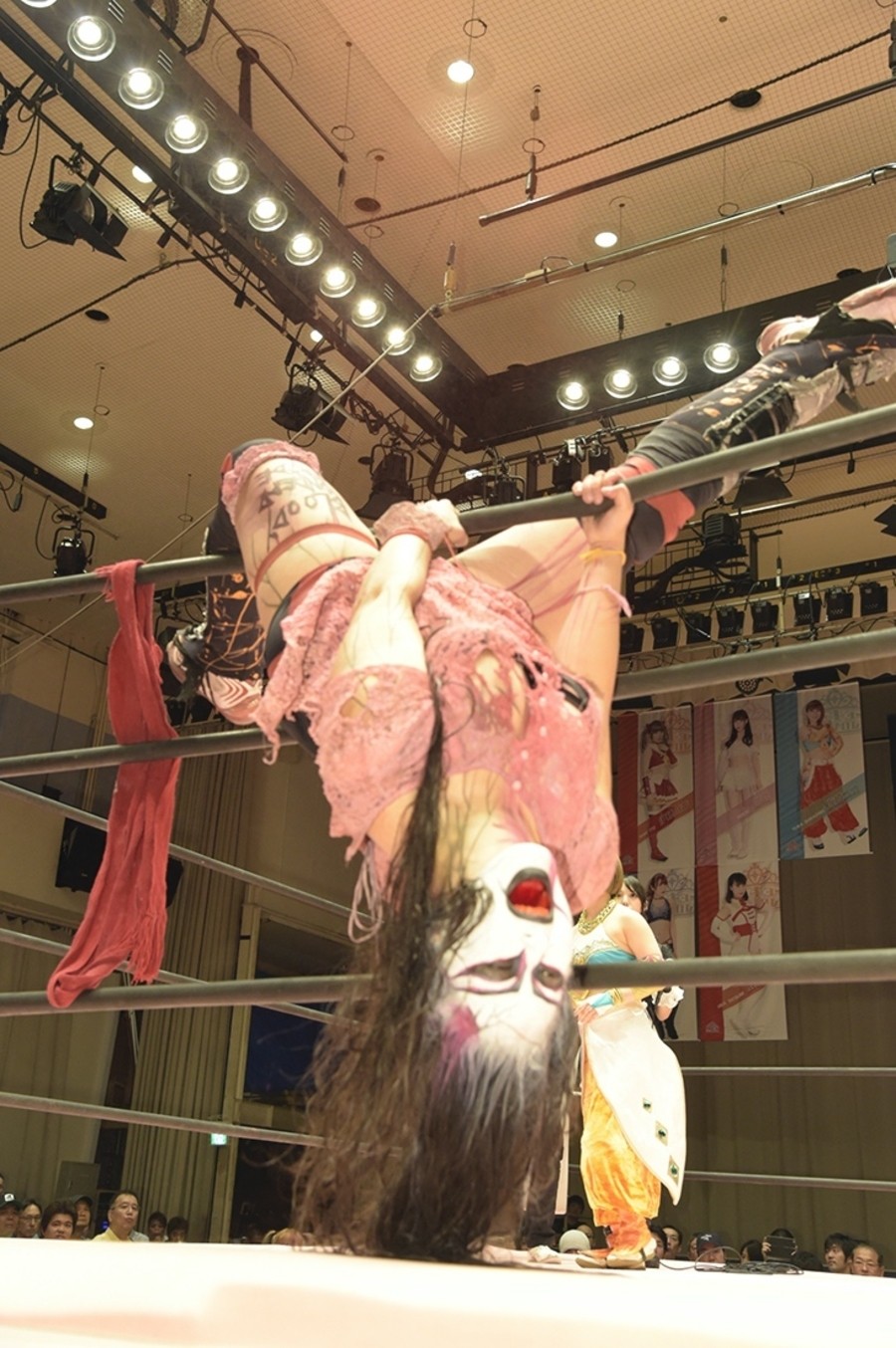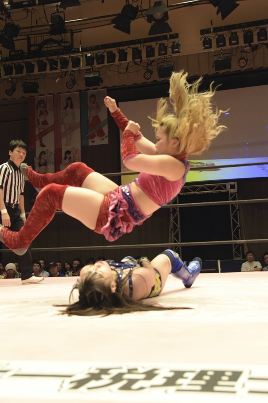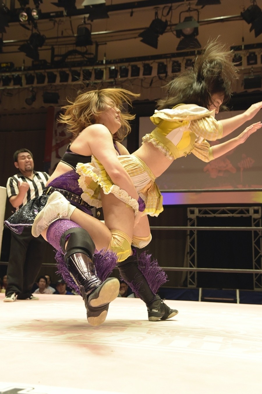 ネックシザースに捉えられたうなぎは倒立=シンクロポーズで脱出しポージング。ぽむも入ってわっしょいわっしょい。リズムに合わせて真弥にぽむがパンチ。ラフォーレ原宿も決まる。YUMIはコーナーにぽむを打ち付けると対角線で勢いをつけヒップトス。真弥はコーナーへバックエルボー。ボディスラムも成功。YUMIにチェンジしてバックエルボー、スリーパー。カウンターでブーツも。そこから再度スリーパーへ。ブーツをかわしたぽむはロープに登ってアームホイップ。ここでうなぎにタッチ。YUMIとのタックルの打ち合いを制すと連続回転バックスピンキック。真弥の逆エビはうなぎが阻止し大ふへん固め。ここはYUMIがカット。真弥はうなぎにボディスラムから逆エビ。今度はぽむがカット。話さない真弥に雄叫びをあげてぶつかるぽむ。だがぽむ・ど・じゃすてぃすはかわされる。うなぎと真弥がエルボー打ち合い。真弥はスパインバスター。うなぎはボディスラムからギロチン。先に立ち上がったうなぎは大ふへん固めを決め、ここで真弥がギブアップ。