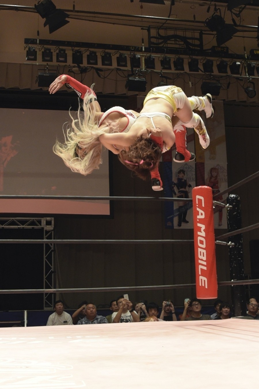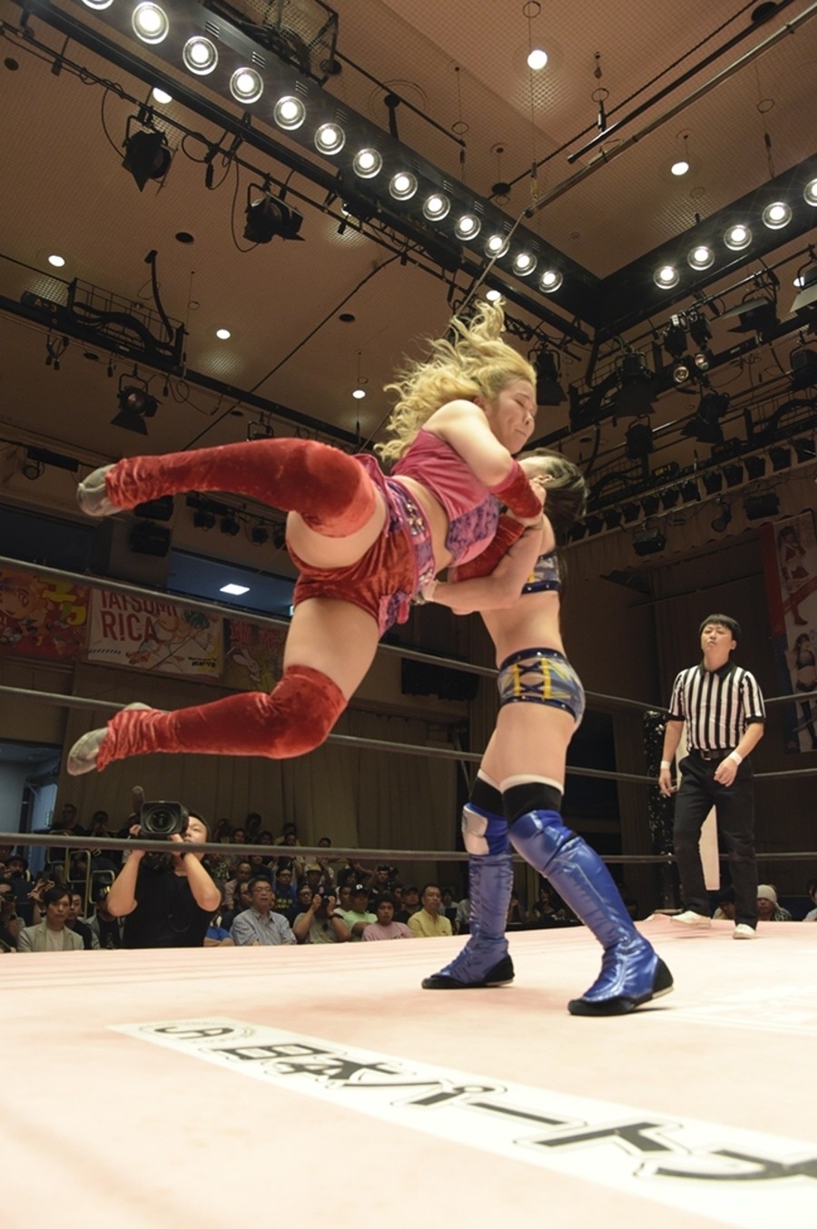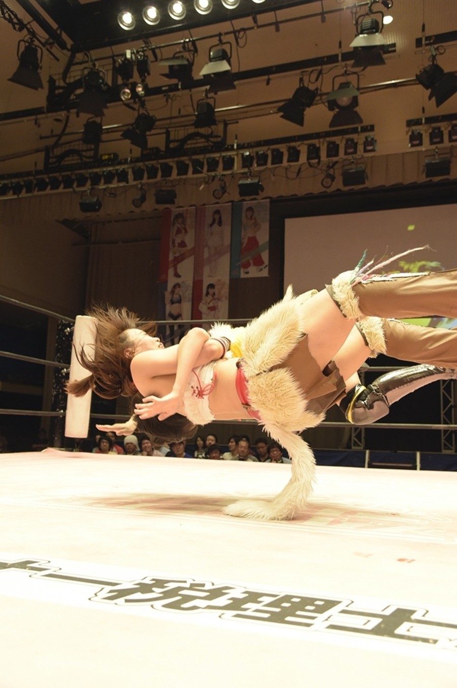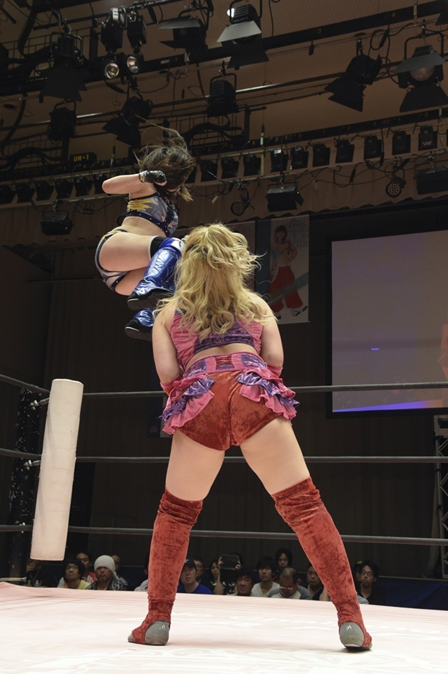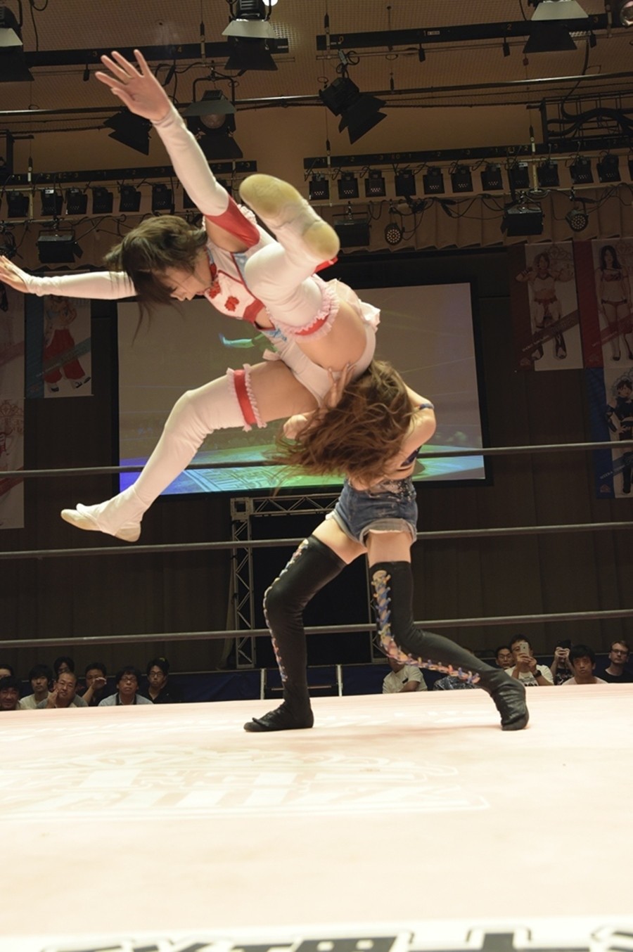 ネックシザースに捉えられたうなぎは倒立=シンクロポーズで脱出しポージング。ぽむも入ってわっしょいわっしょい。リズムに合わせて真弥にぽむがパンチ。ラフォーレ原宿も決まる。YUMIはコーナーにぽむを打ち付けると対角線で勢いをつけヒップトス。真弥はコーナーへバックエルボー。ボディスラムも成功。YUMIにチェンジしてバックエルボー、スリーパー。カウンターでブーツも。そこから再度スリーパーへ。ブーツをかわしたぽむはロープに登ってアームホイップ。ここでうなぎにタッチ。YUMIとのタックルの打ち合いを制すと連続回転バックスピンキック。真弥の逆エビはうなぎが阻止し大ふへん固め。ここはYUMIがカット。真弥はうなぎにボディスラムから逆エビ。今度はぽむがカット。話さない真弥に雄叫びをあげてぶつかるぽむ。だがぽむ・ど・じゃすてぃすはかわされる。うなぎと真弥がエルボー打ち合い。真弥はスパインバスター。うなぎはボディスラムからギロチン。先に立ち上がったうなぎは大ふへん固めを決め、ここで真弥がギブアップ。