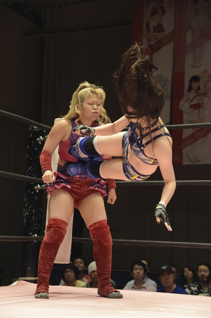 倒れこみ頭突き、フットスタンプはお互いかわしたが瑞希はドロップキックをヒット。コーナーで顔面を踏みつける。伊藤はコーナーでエルボーから世界一可愛いナックル。瑞希はあっさりかわす。さらにエプロンの伊藤をドロップキックで落とすがコーナーからのダイブは伊藤が阻止。伊藤は鉄柱攻撃からマイクを取り出しコードで鉄柱ごと締めつける。そしてマイクONで「世界一可愛いのは?」。リング内では倒れこみ頭突き。瑞希はフォールをブリッジで返しフットスタンプ。伊藤の頭突きをブロックするとロープにもたれた伊藤にドロップキック。コーナー2段目からダイビングフットスタンプ、最上段からクロスボディも。2発目は伊藤が阻止してコーナー上で頭突き。クロスボディをかわすと飛びついてDDT。逆エビは逃げる瑞希をリング中央に戻して攻め続ける。ロープに逃げた瑞希にダイビングヘッドバットを狙った伊藤だが自爆に。瑞希のフェースロックは伊藤が脱出して伊藤スペシャル。これも瑞希が切り返しフェースロック。長時間決まったが伊藤コールの中、ロープブレイク。瑞希のクロスボディに伊藤はカウンターの頭突き。ダブルダウンから倒れたままエルボー打ち合いへ。立ち上がってもエルボー合戦。立ち上がってくる伊藤に瑞希が何度もエルボーを叩き込む。それでも伊藤は雄叫びとともにエルボー。瑞希のエルボーを頭突きで迎撃してみせる。コーナーに登ろうとする瑞希の足を掴む伊藤。振り切った瑞希は最上段からダイビングフットスタンプ。しかしカバーに入れず。倒れた伊藤を瑞希は雄叫びをあげて引きずり上げる。中指を立てる伊藤だったが瑞希はキューティースペシャル。激闘を制し、瑞希が9.1大阪でのプリプリ王座挑戦へ勢いをつけた。