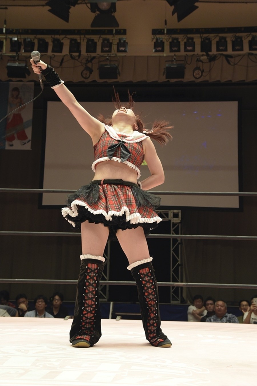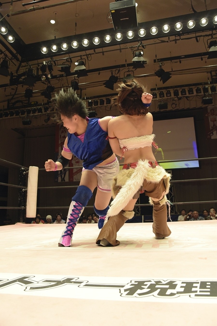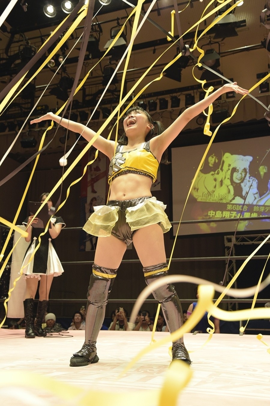 試合開始前、恒例の前説で難波小百合リングアナが諸注意と告知。続いてアップアップガールズ(プロレス)のミニライブ。「イェーイ!」と登場して、後楽園では初となる「負けたくない」披露。そして観客と「東京女子プロレス、スタート!」。