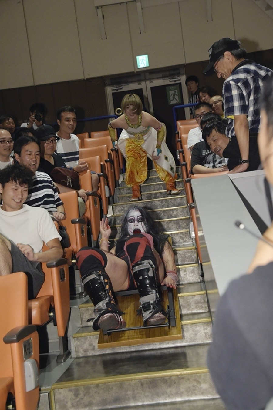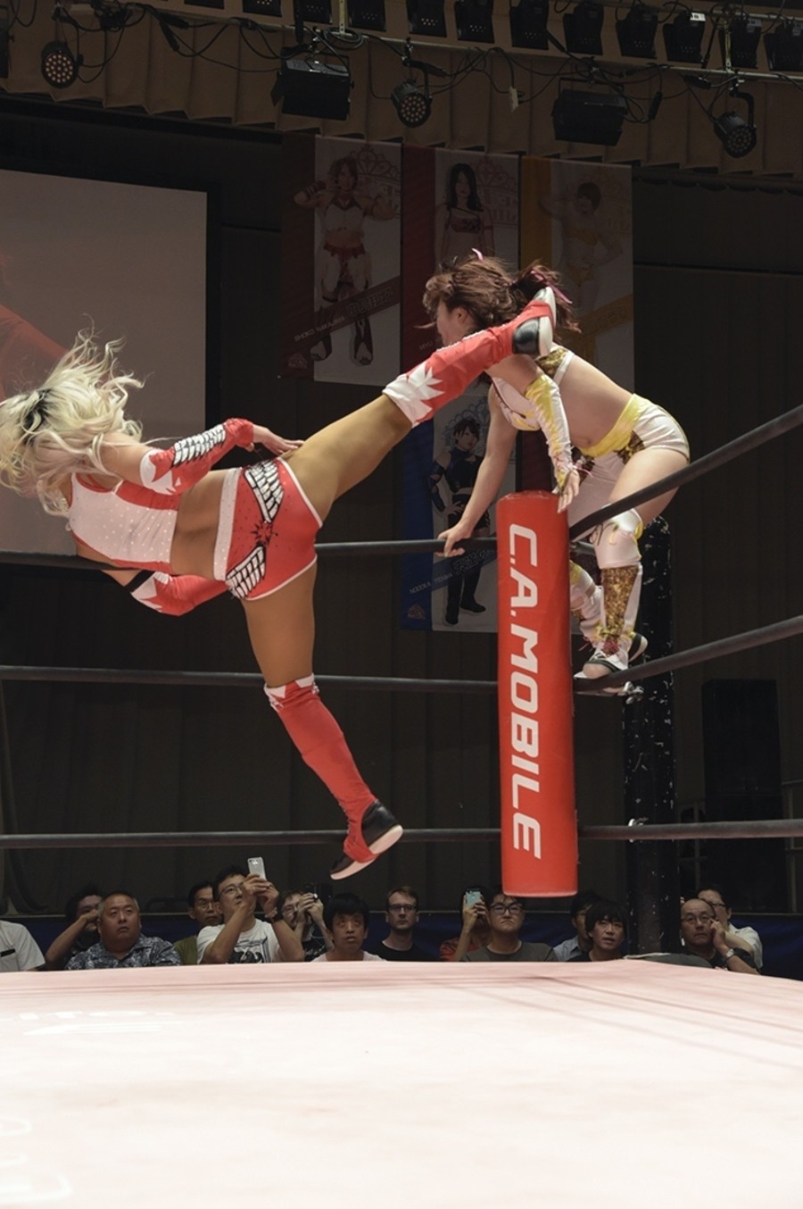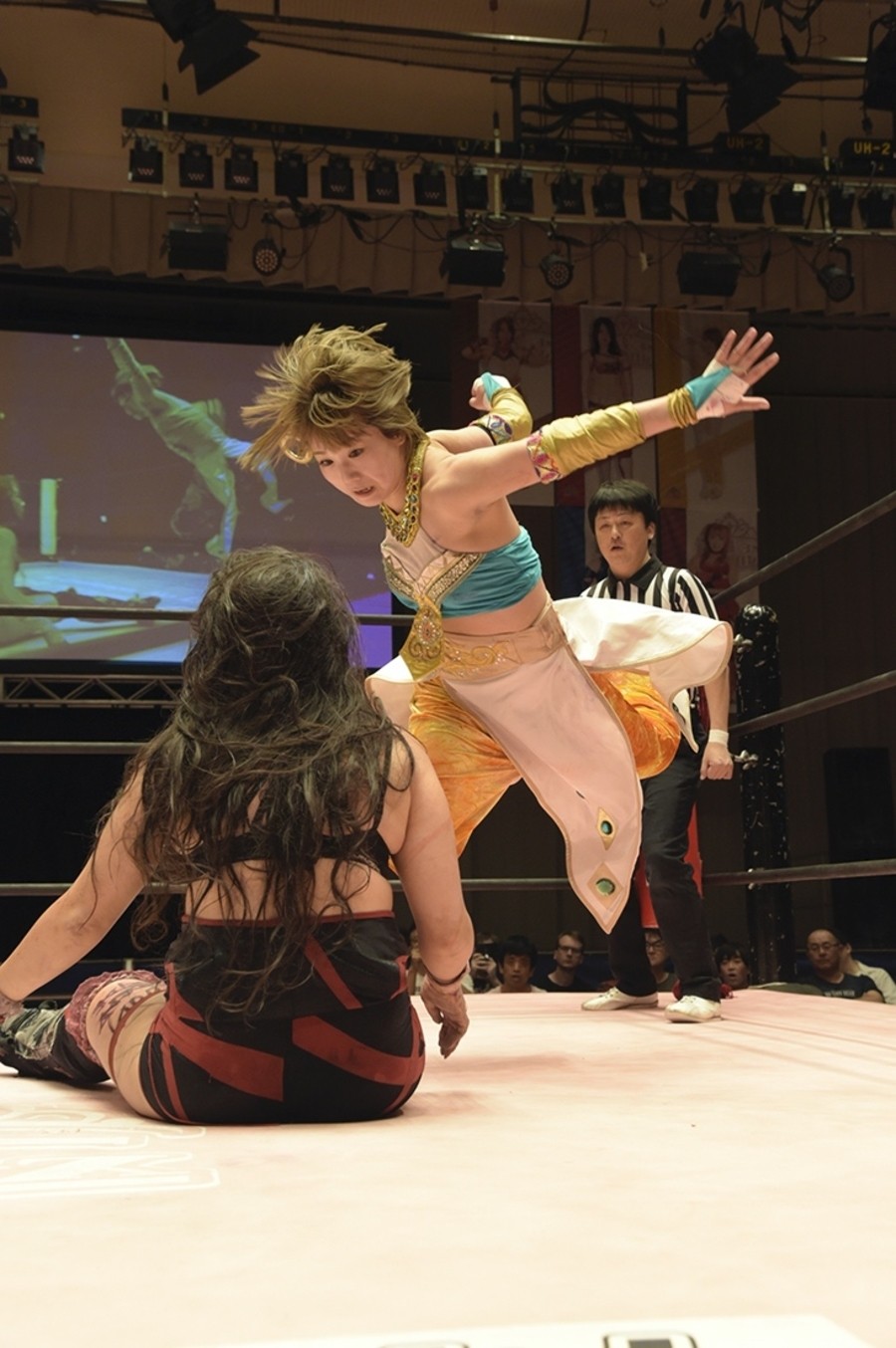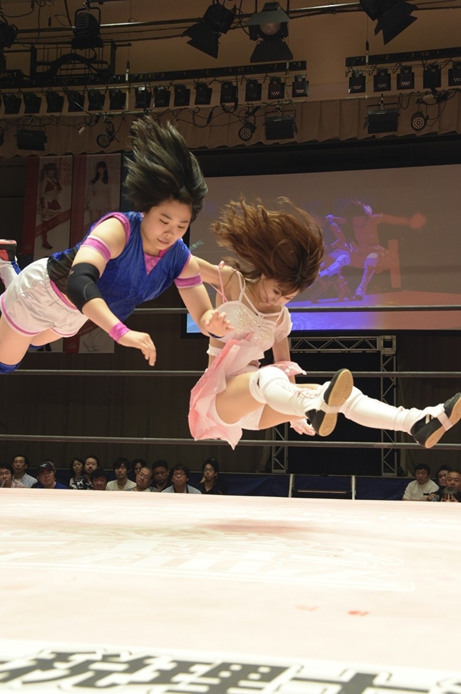 試合開始前、恒例の前説で難波小百合リングアナが諸注意と告知。続いてアップアップガールズ(プロレス)のミニライブ。「イェーイ!」と登場して、後楽園では初となる「負けたくない」披露。そして観客と「東京女子プロレス、スタート!」。