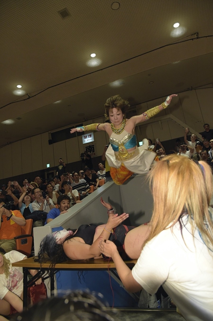 ヤンがリングインすると坂崎は思わず退避。リングサイドに付いた血の跡に早くも悲鳴をあげる坂崎。ゴングが鳴るとヤンが先制。場外にエスケープした坂崎は甲田代表の靴を奪って武器にしようとするがヤンに奪われる。ヤンはステージ上でブレーンバスター。ステージ下の坂崎にトペコンヒーロも。闘いは南側客席になだれ込み、そこで坂崎がテーブルを発見。テーブルにヤンを乗せて階段から滑り落とす。さらに観客入場口からテーブルクラッシュで魔法少女スプラッシュ。ようやくリングに戻ると片エビ固め。これはカウント2。ぶら下がり首4の字を決めた坂崎だがヤンはエプロンでサイドスラム。手袋をつけたヤンは坂崎を抱え上げてコーナーに投げつける。エアプレーンスピンから脱出した坂崎は虎ースキックからフィッシャーマンバスター、スライディングラリアット。ヤンのミストはコスチュームで防いだ坂崎。魔法少女キックを決める。マンディブルクローを狙うヤンに、坂崎は甲田代表の靴下を手に装着。ここでヤンのマンディブルクロー、坂崎の靴下が相次いで木曽レフェリーに誤爆しレフェリー失神。両者マンディブルクローが決まり、リング上は全員失神。ここで松井コールを受け松井レフェリーが登場。しかし選手の状態をチェックしたところ、靴下の匂いにやられてゴングを要請。裁定は「なんでもいい。ノーコンテストとかで」。
