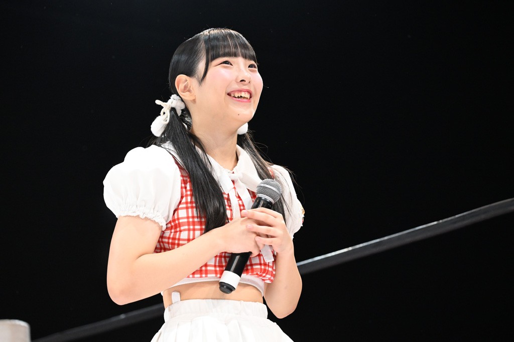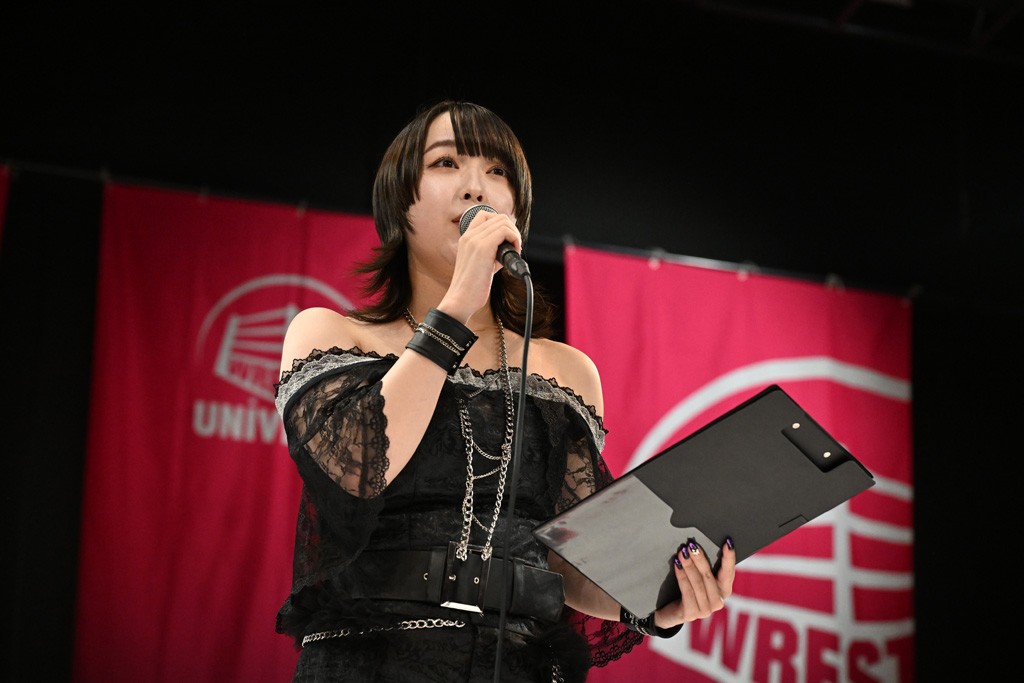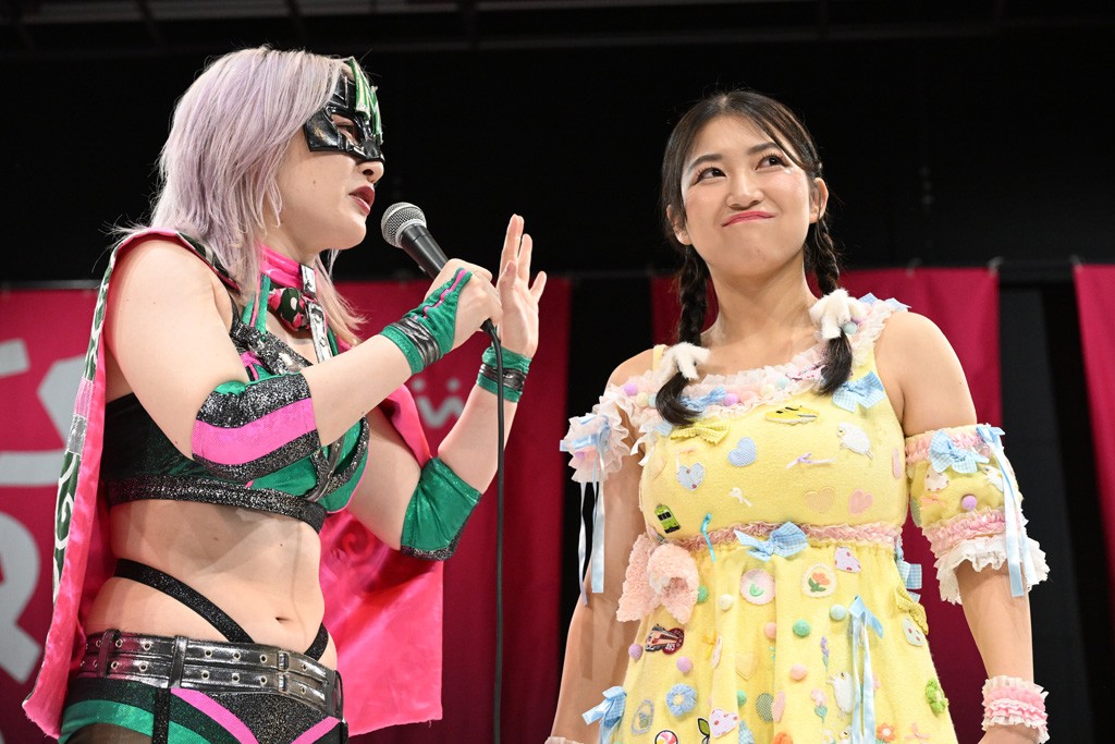 有栖 汐珠、ねくじぇねトーナメント優勝おめでとう。汐珠がずっとシングルしたいって言ってくれていたから、このトーナメント優勝して私を呼んでくれるかなってほんのちょっとだけ期待してて。そしたらまさか本当に優勝して。最初、本当に私が呼ばれているのか不安だったけど、ちゃんと呼ばれていたからビックリしたなっていう気持ちが大きいかったですね。でもこのトーナメント中の試合を見てて、今の高見汐珠と闘いたいなと思ったんですけど、今の高見汐珠だったら私、余裕で倒しちゃうから、もっと違う汐珠を見せて欲しい…っていうか私が引き出します。その上でこのベルトは守ります。ありがとうございました。