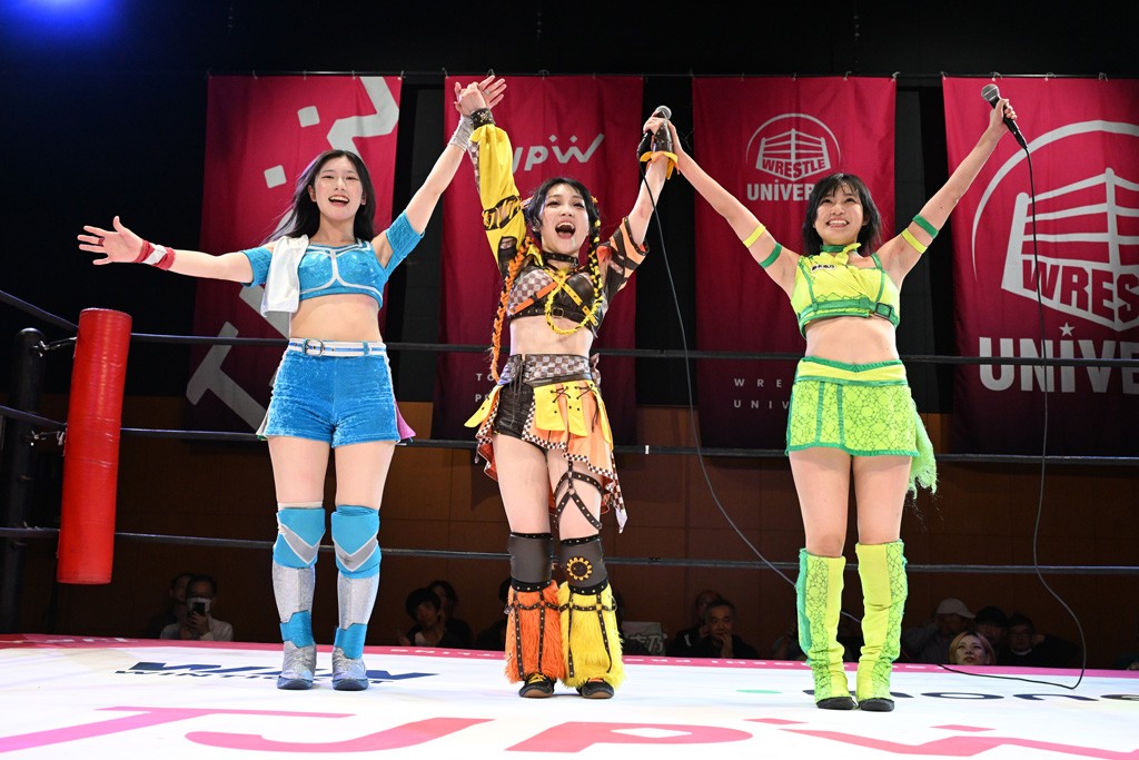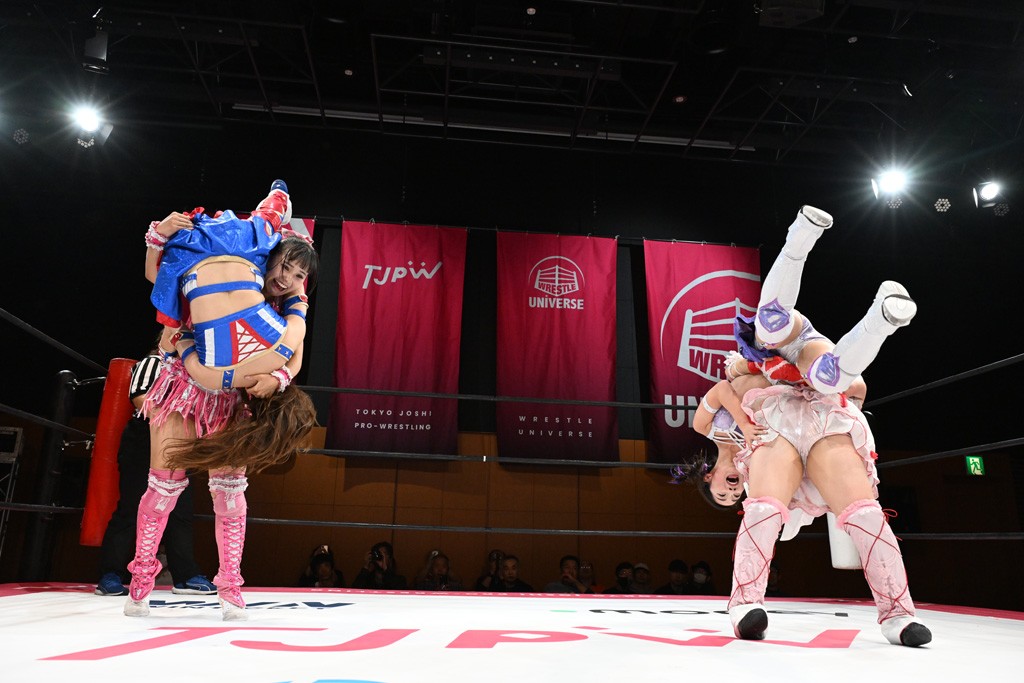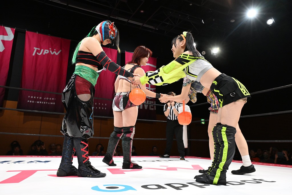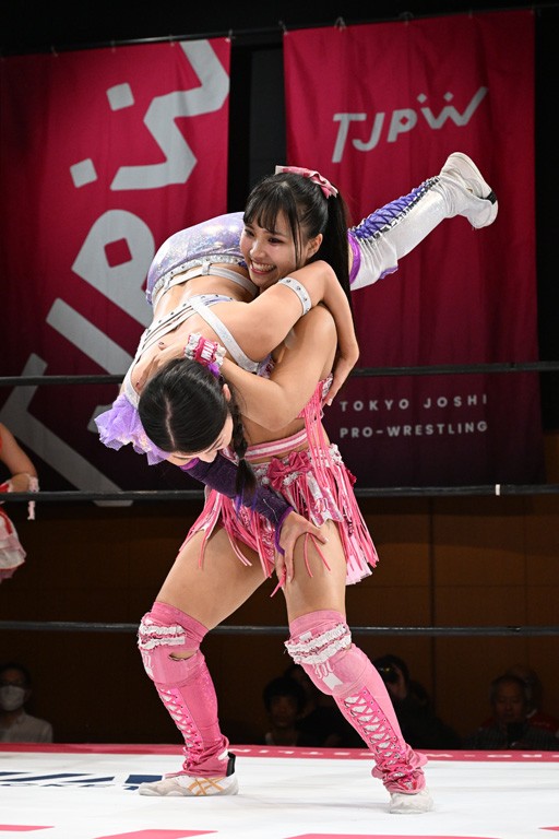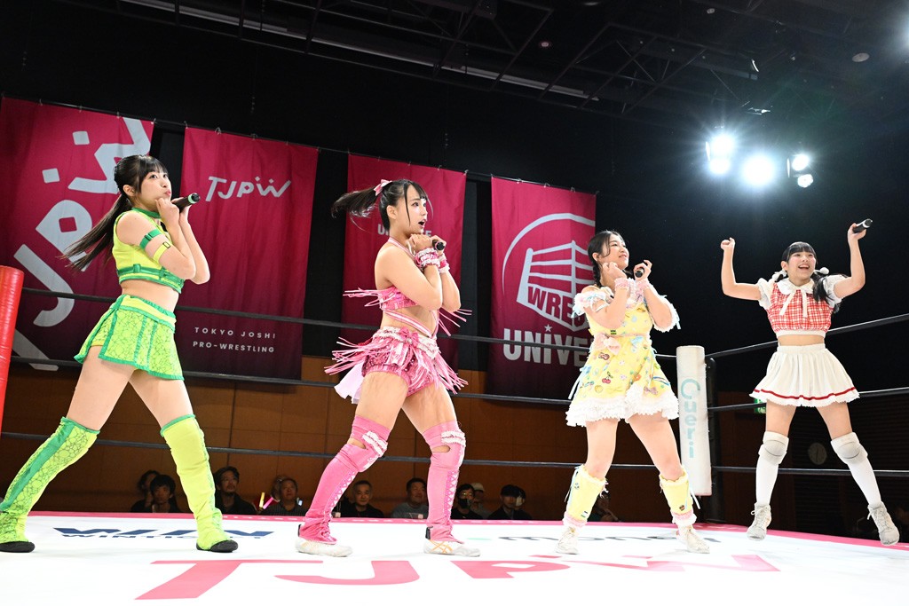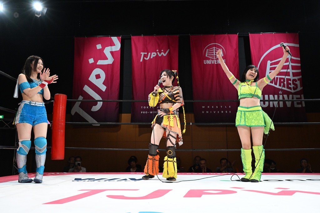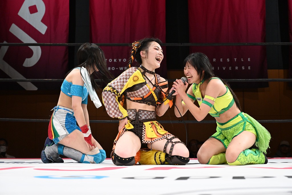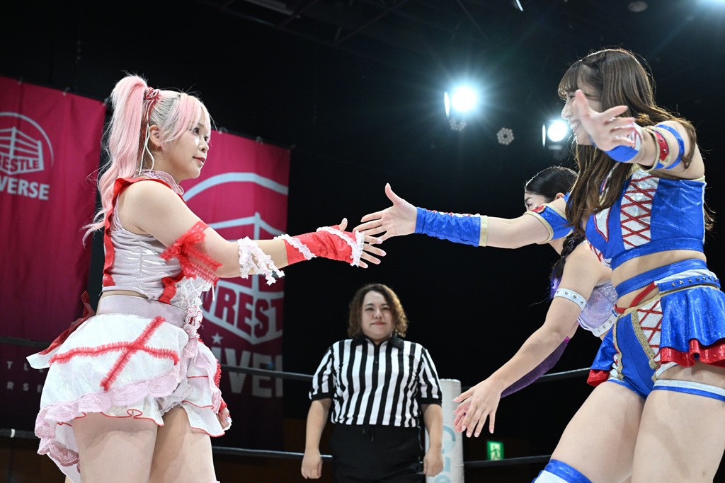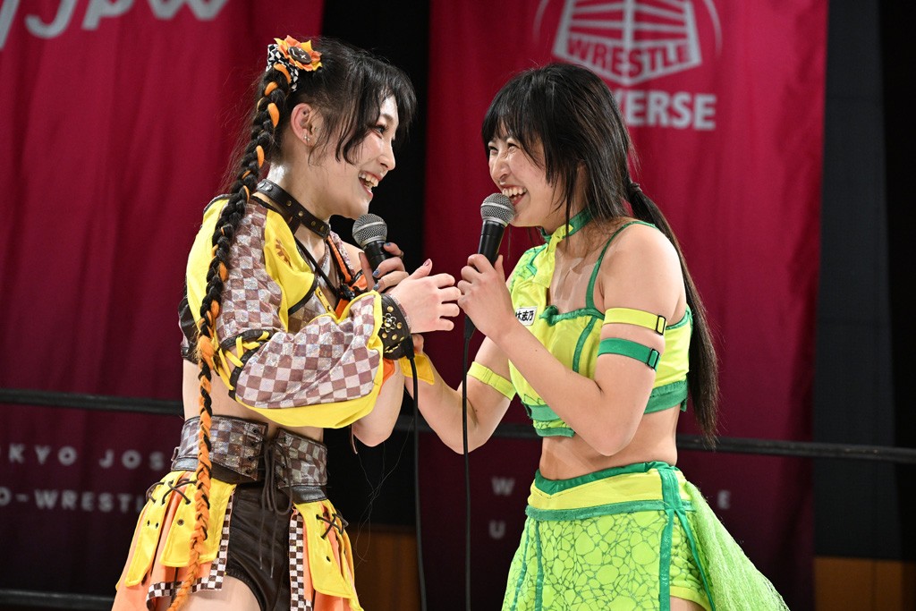 試合後にHIMAWARI&志乃はOber Eatsと至近距離で睨み合い、マイクを持つ。HIMAWARI「よーし! 前哨戦、勝ったぞー! 志乃さん、ただいま」志乃「おかえりー!」HIMAWARI「まずね、ちょっと志乃さんひとりで1回頑張ってたから…いや中国で見てたよ」志乃「ありがとう」HIMAWARI「マジで今日帰ってきたら絶対この前哨戦で勝ってね。このまま勝って勝って、ベルトまで取ろうじゃないの!」志乃「取る! 今日勝てて、挑戦(表明)したあの日からますます私は取れるって確信になってる。今日も含め。絶対に取ろう!HIMAWARI「いや、違う。取れる」志乃「もう取る!」HIMAWARI「取ろう! 頑張ろう!」志乃「頑張るぞー!」HIMAWARI「ハル、ありがとうね、今日は。マイクふたつあげる」ハル「23年組のなかで一番仲いいおふたりがベルト挑戦、私は一番応援してるから…絶対取るんですよね? じゃあ後楽園で見せてください」HIMAWARI「もちろん!」志乃「私たち…」HIMAWARI「あ、言っちゃう? いいよ」志乃「私たち…」HIMAWARI&志乃「せーの! Bumping gRitters(バンピング・グリッターズ)!」志乃「が、ベルトを取ってみせます! 頑張ります!」HIMAWARI「今日はありがとうございました!」