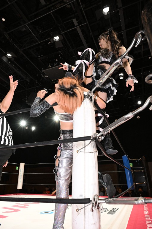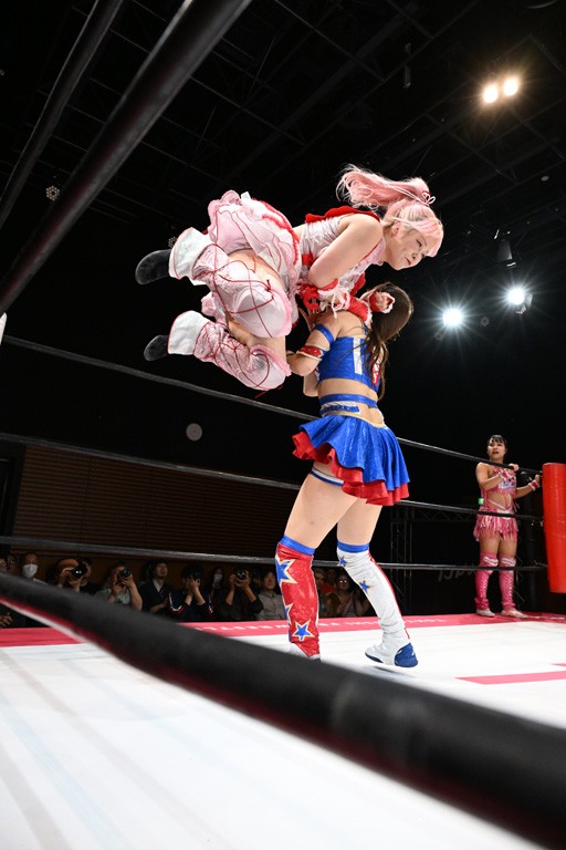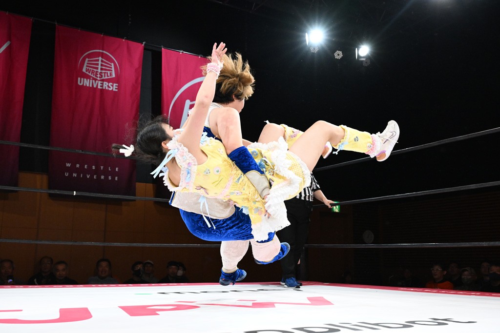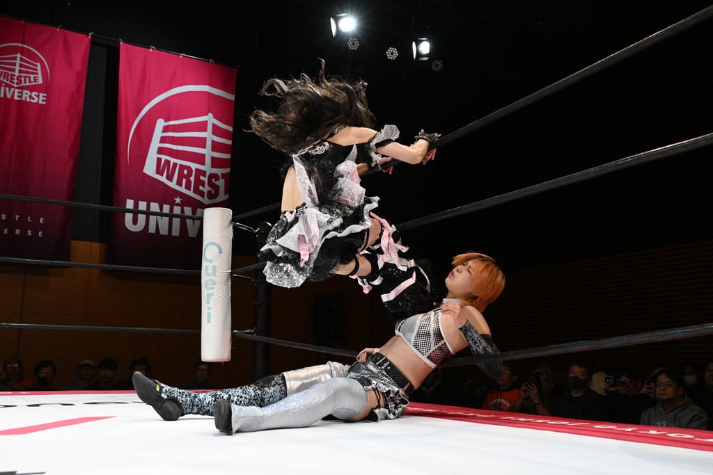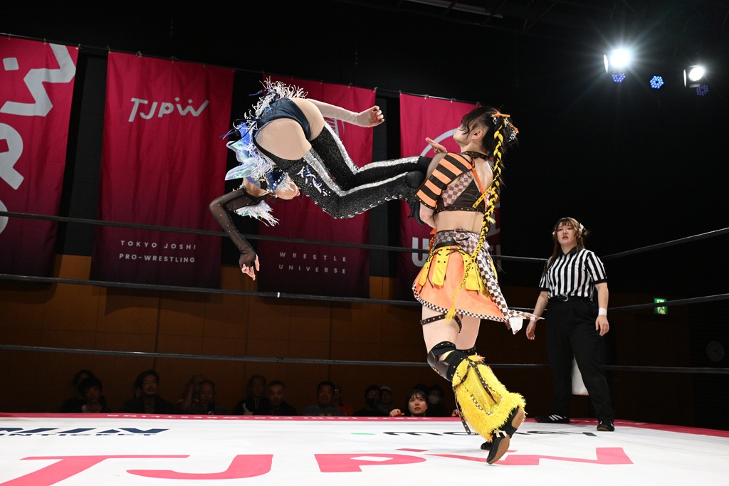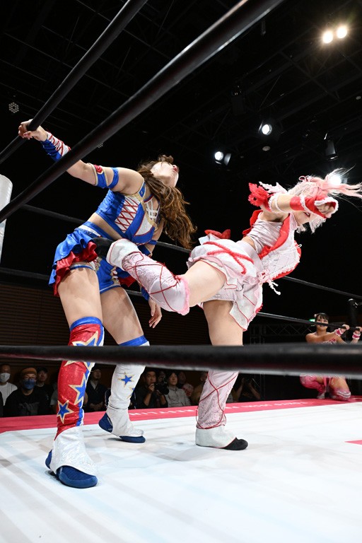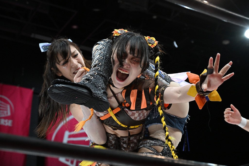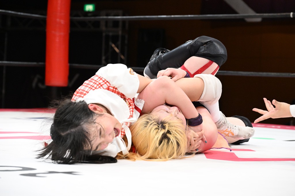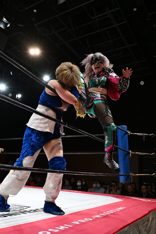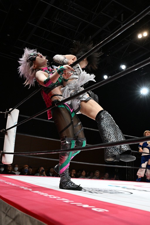 汐珠がエルボーからドロップキック。反転式ミサイルキックを繰り出すもカウント2。コアラクラッチ狙いを千花がかわしてボディースラム。ランニングエルボーからカバーもカウント2で決まらない。稲荷鳥居・改を仕掛けるも汐珠が足を掴んで拒否。ならばと千花は稲荷鳥居へ。これは汐珠がなんとかロープに逃げる。エルボーバットから稲荷鳥居・改を狙う千花。汐珠が吊られてしまうもこれをかわしてコアラクラッチで絞めあげて勝利を奪った。