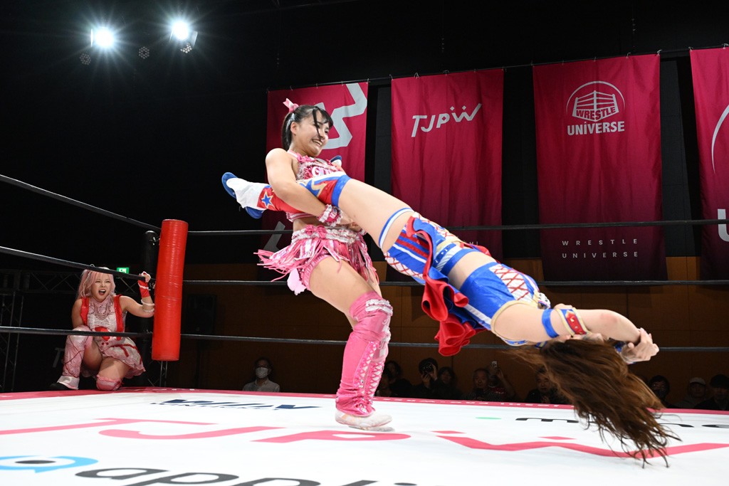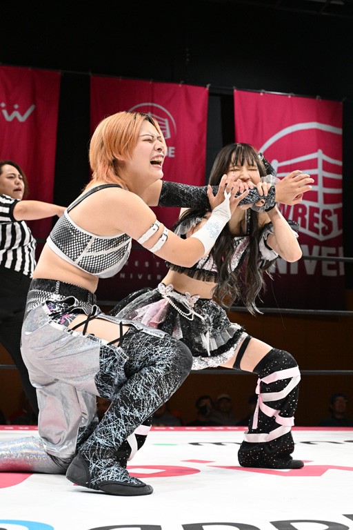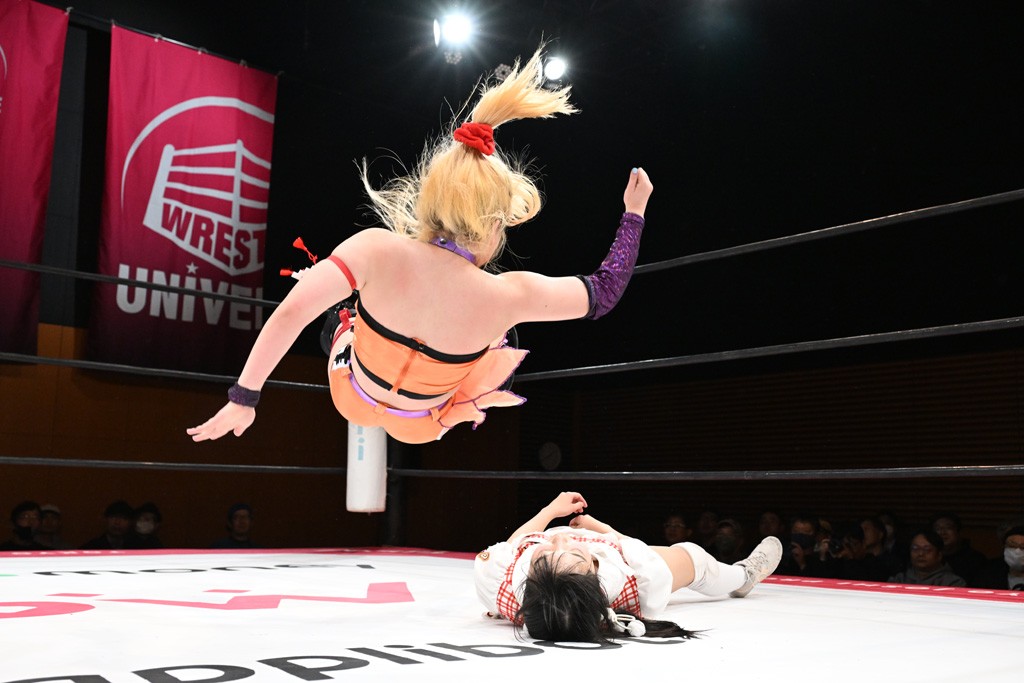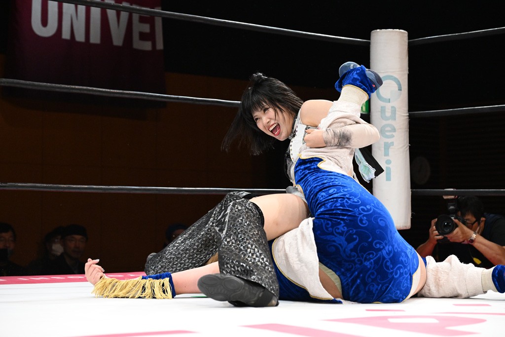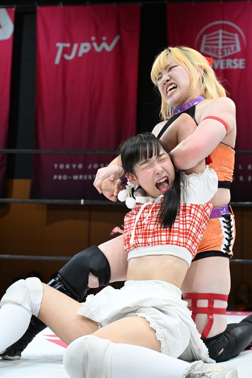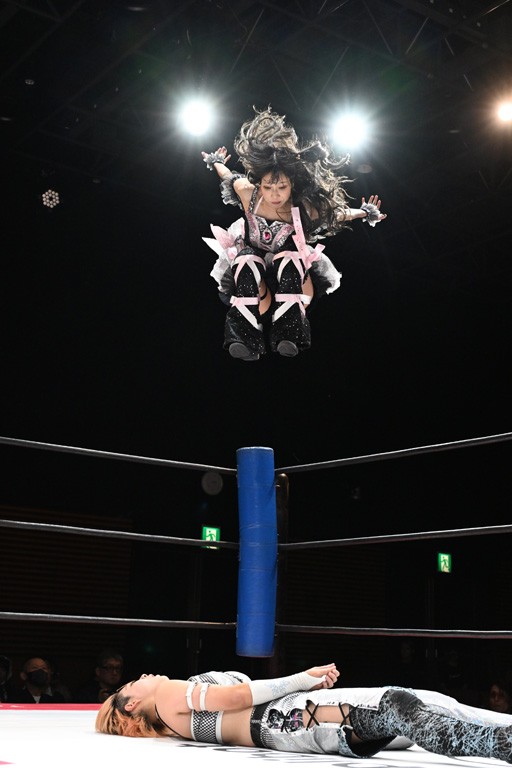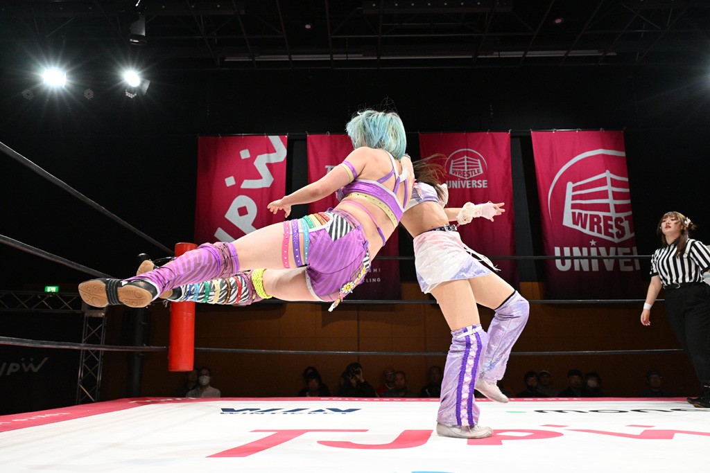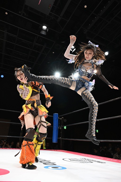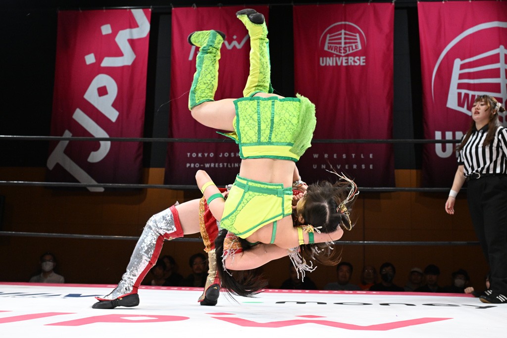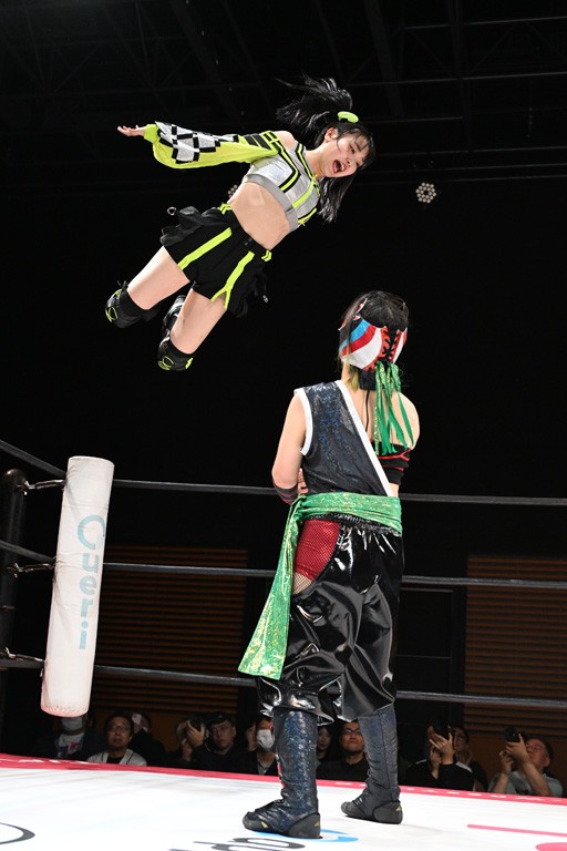 汐珠がエルボーからドロップキック。反転式ミサイルキックを繰り出すもカウント2。コアラクラッチ狙いを千花がかわしてボディースラム。ランニングエルボーからカバーもカウント2で決まらない。稲荷鳥居・改を仕掛けるも汐珠が足を掴んで拒否。ならばと千花は稲荷鳥居へ。これは汐珠がなんとかロープに逃げる。エルボーバットから稲荷鳥居・改を狙う千花。汐珠が吊られてしまうもこれをかわしてコアラクラッチで絞めあげて勝利を奪った。