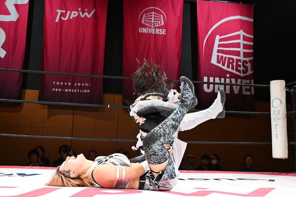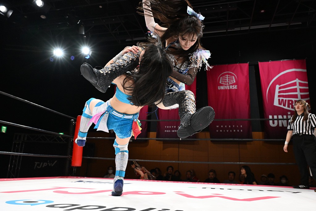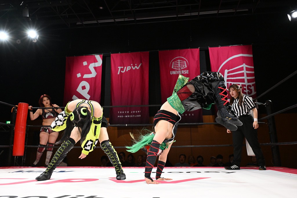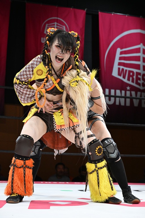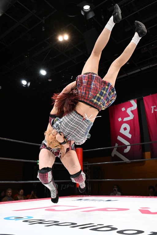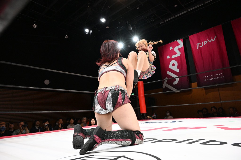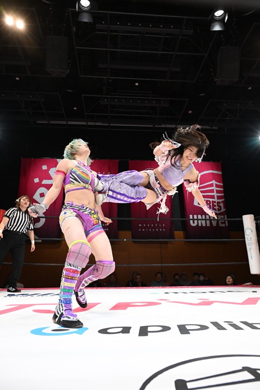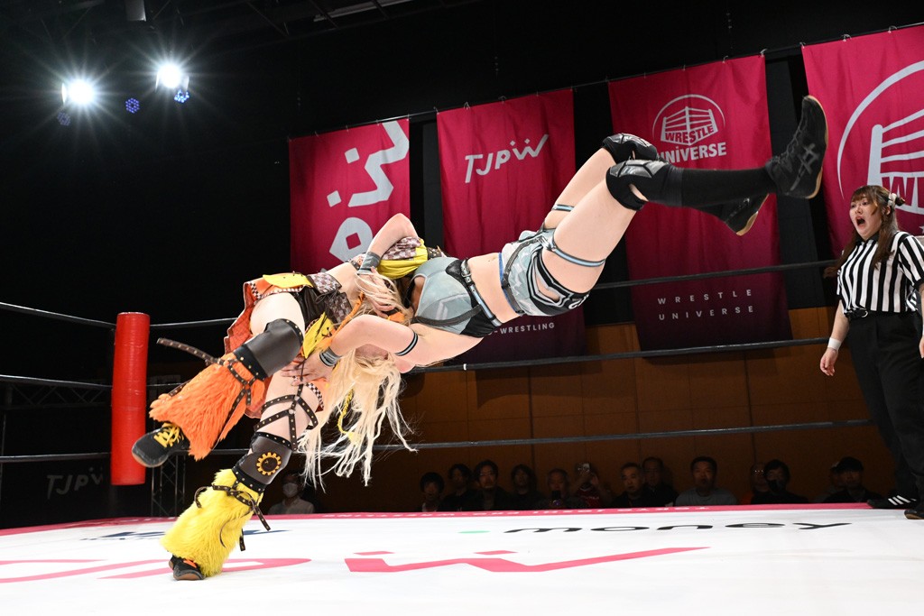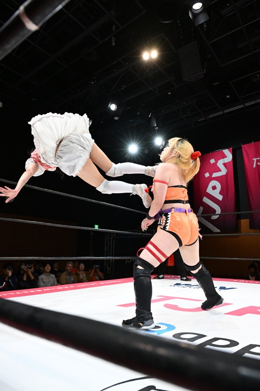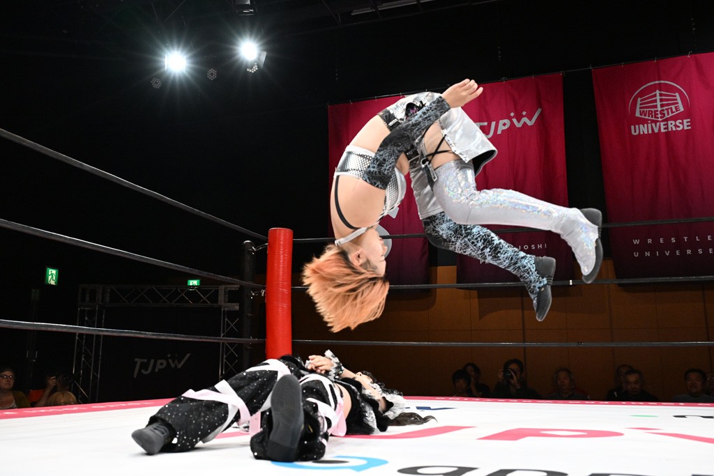汐珠がエルボーからドロップキック。反転式ミサイルキックを繰り出すもカウント2。コアラクラッチ狙いを千花がかわしてボディースラム。ランニングエルボーからカバーもカウント2で決まらない。稲荷鳥居・改を仕掛けるも汐珠が足を掴んで拒否。ならばと千花は稲荷鳥居へ。これは汐珠がなんとかロープに逃げる。エルボーバットから稲荷鳥居・改を狙う千花。汐珠が吊られてしまうもこれをかわしてコアラクラッチで絞めあげて勝利を奪った。