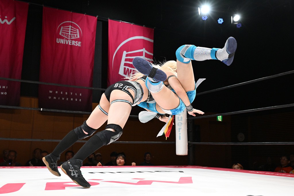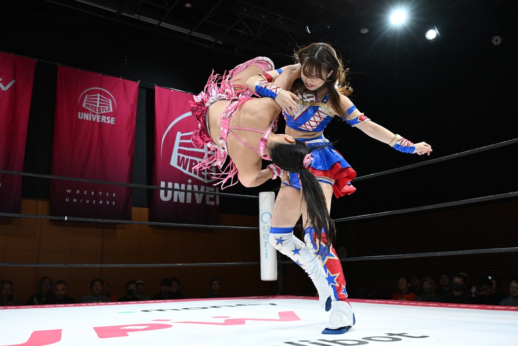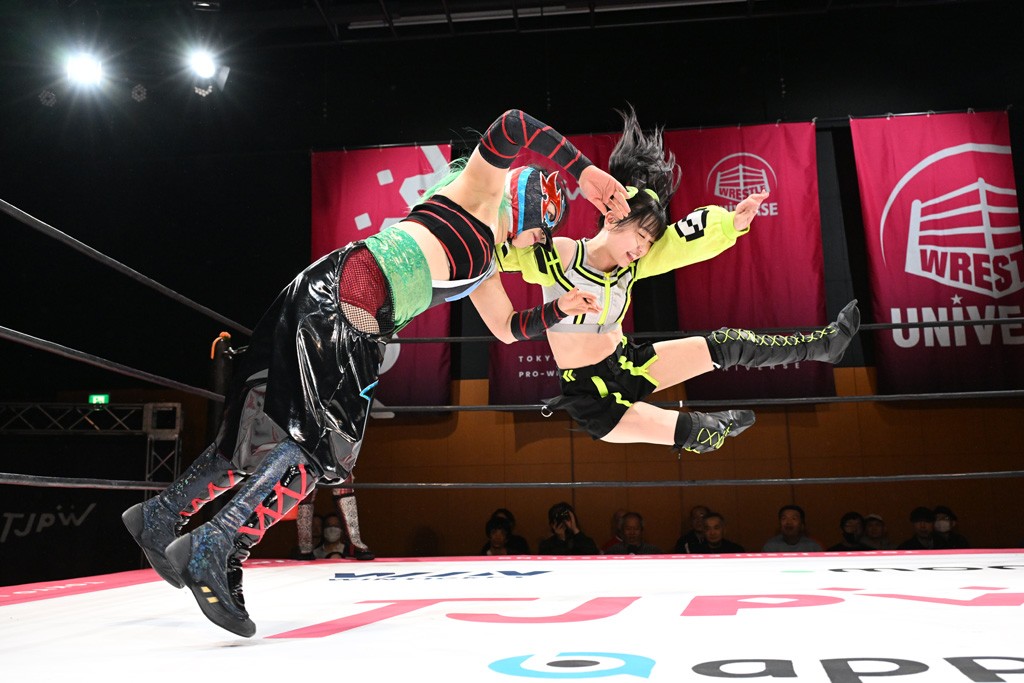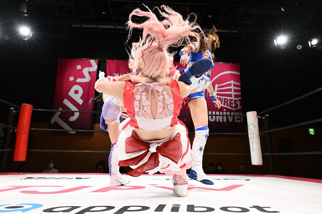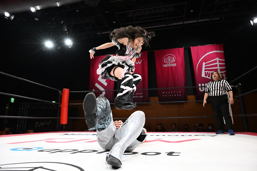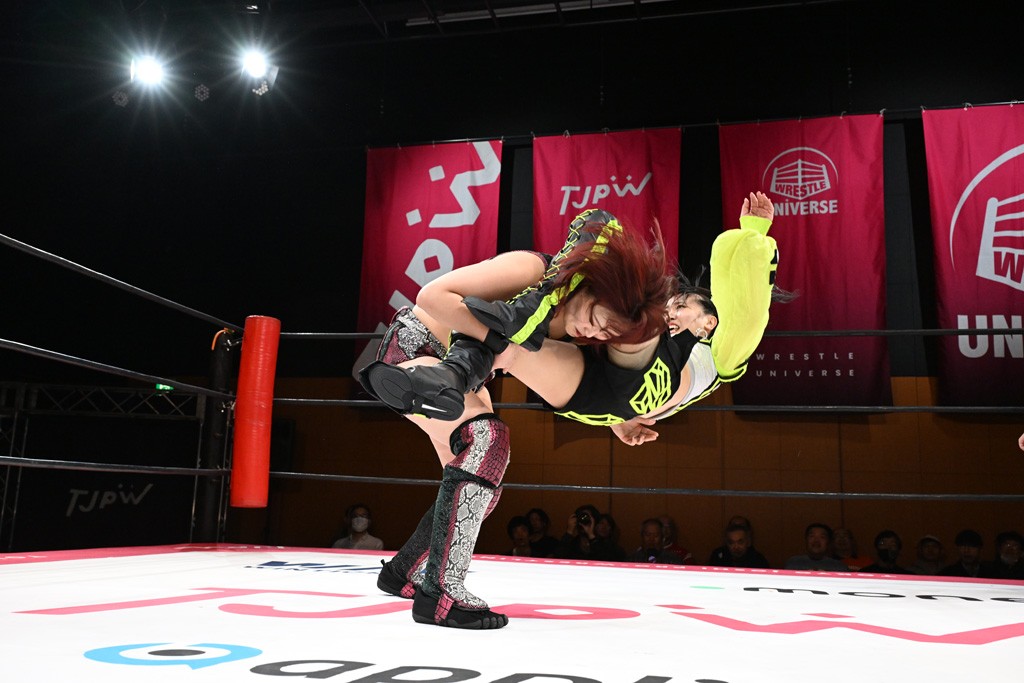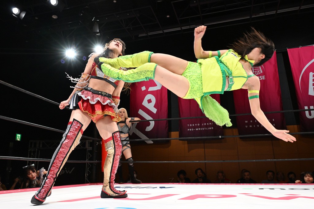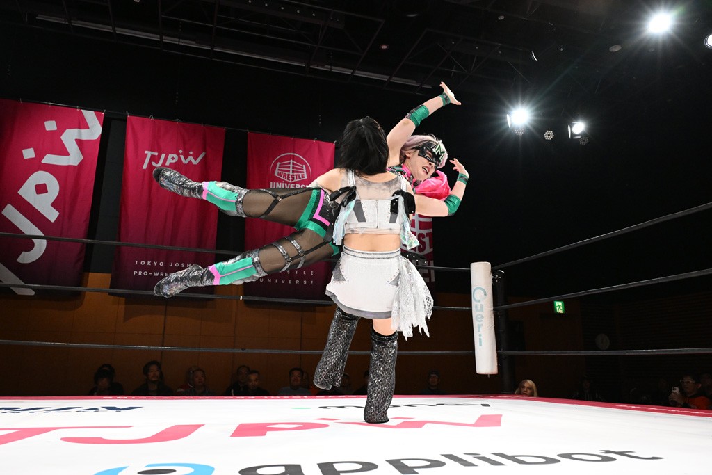 汐珠がエルボーからドロップキック。反転式ミサイルキックを繰り出すもカウント2。コアラクラッチ狙いを千花がかわしてボディースラム。ランニングエルボーからカバーもカウント2で決まらない。稲荷鳥居・改を仕掛けるも汐珠が足を掴んで拒否。ならばと千花は稲荷鳥居へ。これは汐珠がなんとかロープに逃げる。エルボーバットから稲荷鳥居・改を狙う千花。汐珠が吊られてしまうもこれをかわしてコアラクラッチで絞めあげて勝利を奪った。