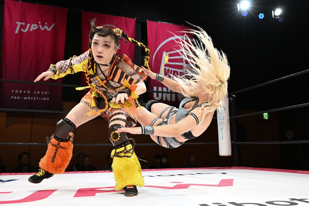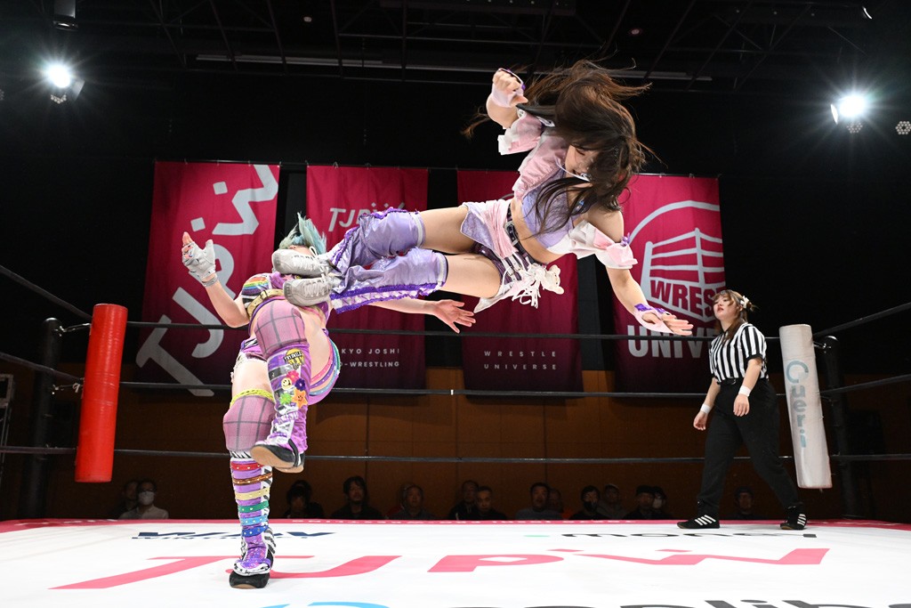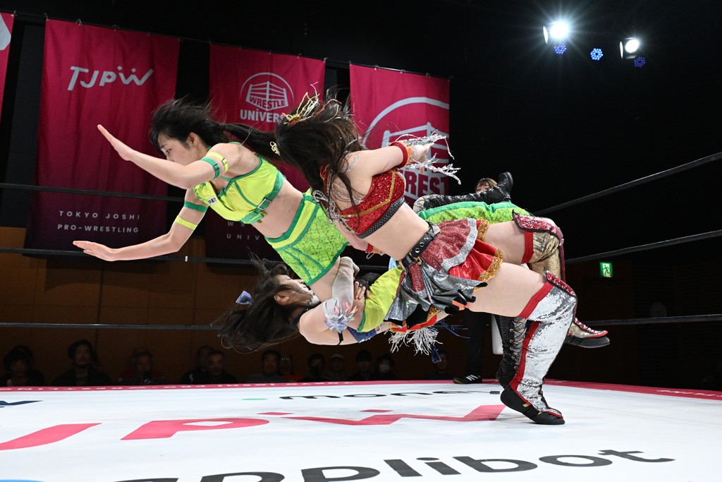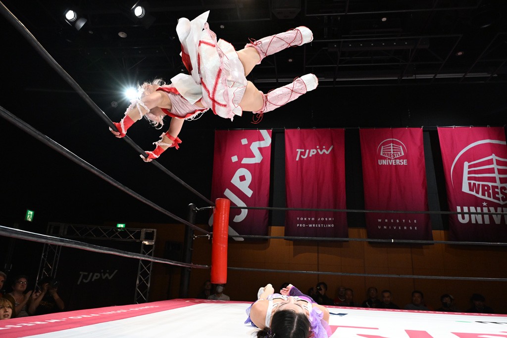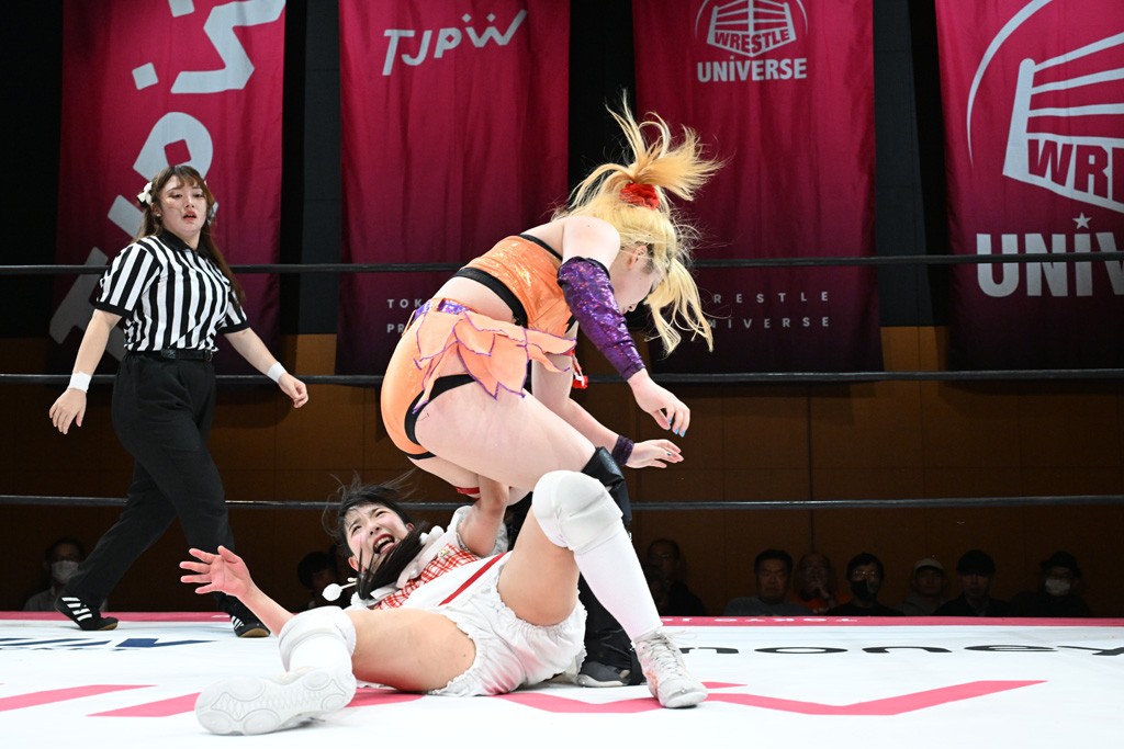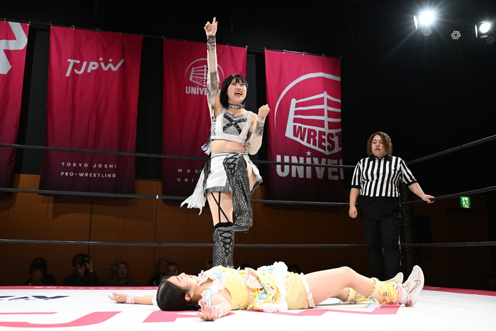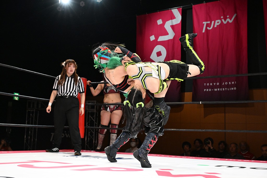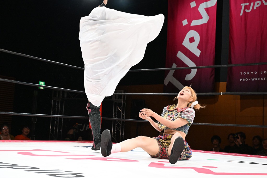汐珠がエルボーからドロップキック。反転式ミサイルキックを繰り出すもカウント2。コアラクラッチ狙いを千花がかわしてボディースラム。ランニングエルボーからカバーもカウント2で決まらない。稲荷鳥居・改を仕掛けるも汐珠が足を掴んで拒否。ならばと千花は稲荷鳥居へ。これは汐珠がなんとかロープに逃げる。エルボーバットから稲荷鳥居・改を狙う千花。汐珠が吊られてしまうもこれをかわしてコアラクラッチで絞めあげて勝利を奪った。