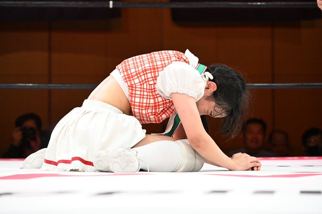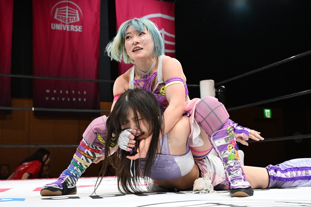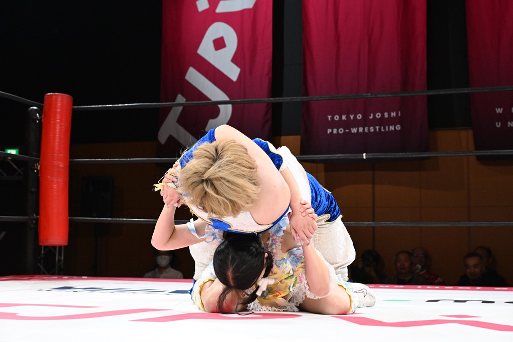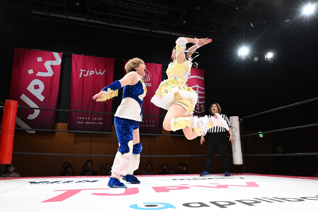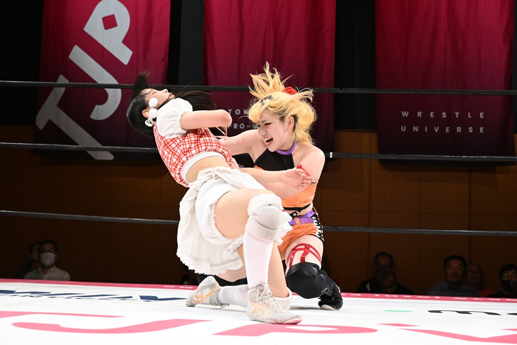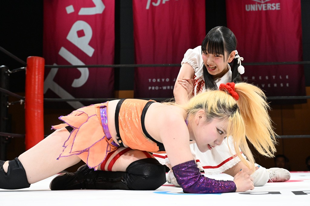 2敗したら脱落のダブルイリミネーション方式のため、汐珠が勝てば負けなしで文句なしの優勝。千花が勝てばお互い1敗ずつとなり、汐珠との再戦で優勝を決める。お互い握手から開始のゴング。汐珠がドロップキックで先制。ハンマーロックで腕を絞っていく汐珠。串刺し攻撃は千花が拒否してボディースラムからヘッドロック。さらにボディースラムからのカバーはカウント2。ボディースラム狙いを汐珠が丸め込みで切り返すとカウンターのドロップキック。バックエルボーからドロップキック、さらにコアラクラッチで勝負に出る汐珠。千花がなんとかロープに逃げる。反転式ミサイルキックは千花がかわしてショルダーアタック。千花がジョン・ウーからエルボードロップもカウント2。5分経過、今度は千花が稲荷鳥居で勝負に出る。抵抗する汐珠に千花が稲荷鳥居・改を仕掛けるも汐珠がかわして丸め込み。さらにカウンターのバックエルボーを決めると反転式ミサイルキックから振り子式ドロップキック。そして再度のコアラクラッチへ。振り解く千花がエルボーもカウント2。さらにエルボーを見舞って渾身のカバーで3カウント。再試合へ。