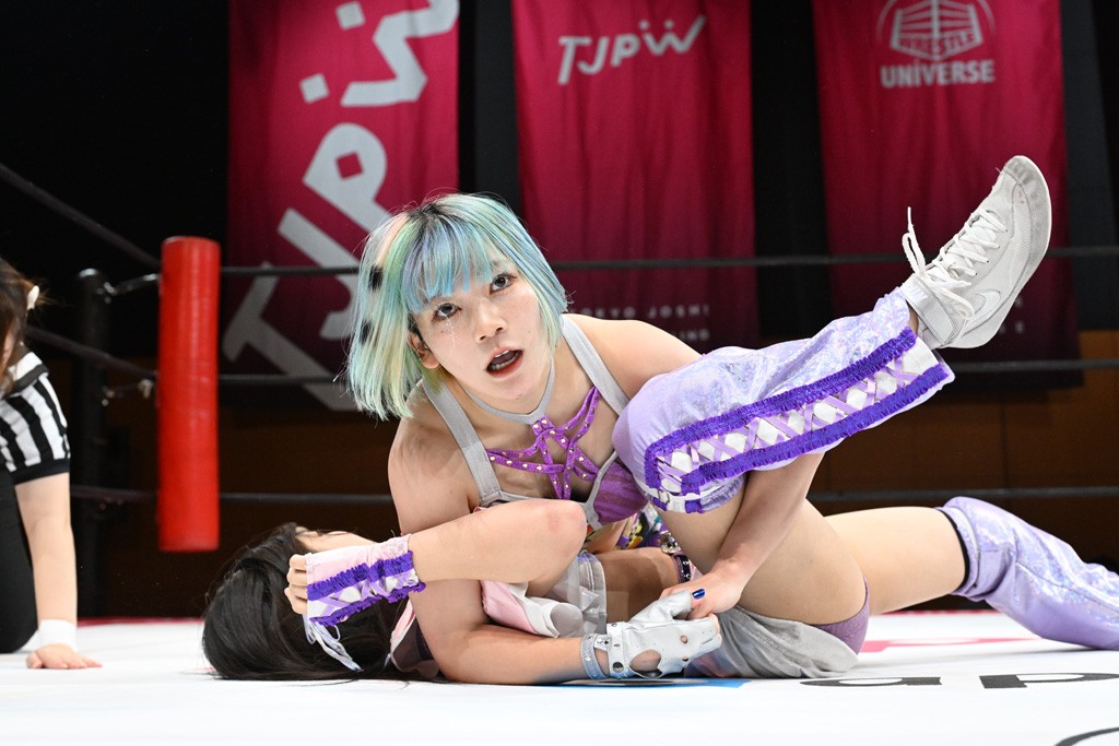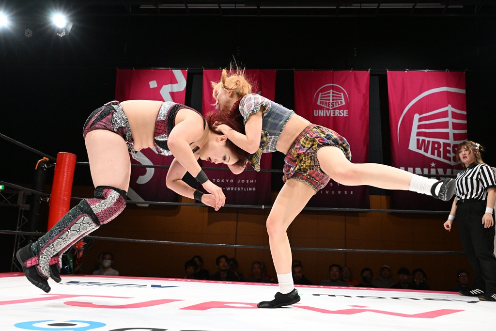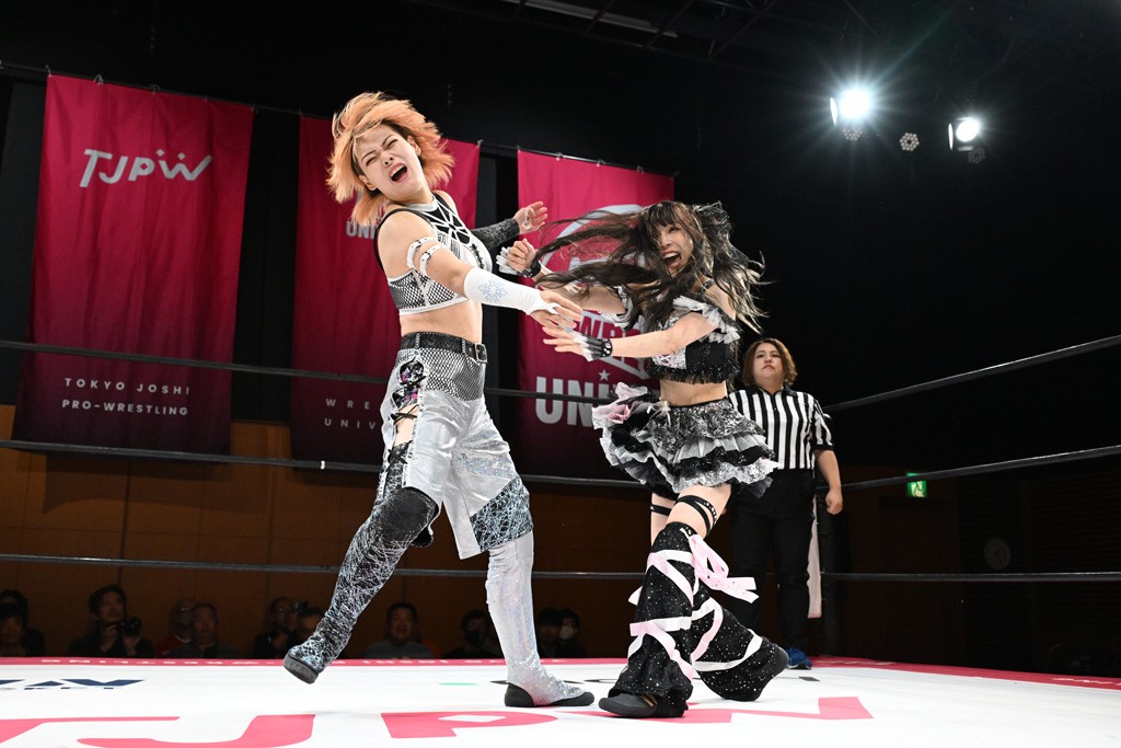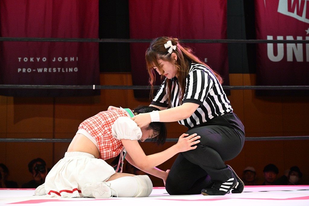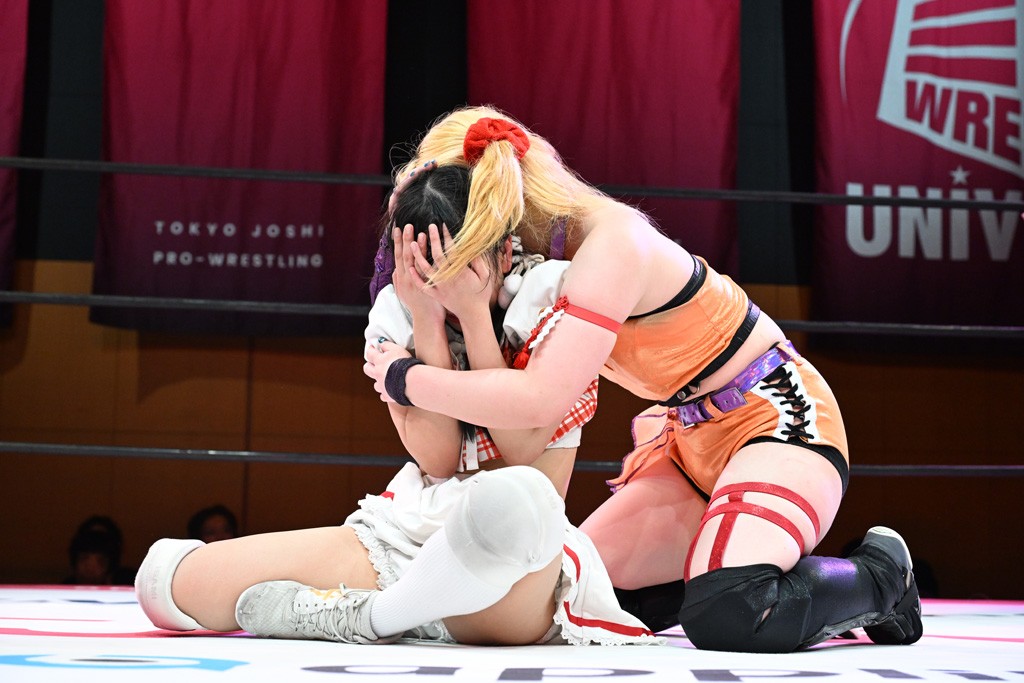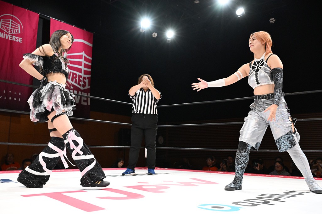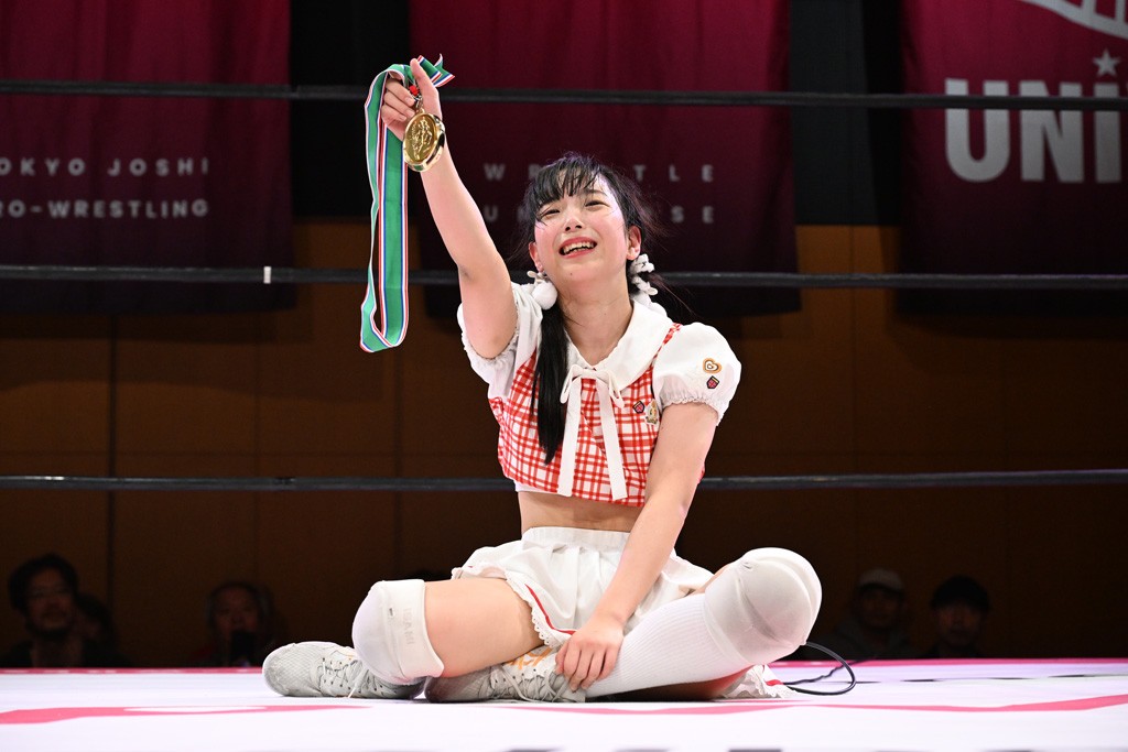 2敗したら脱落のダブルイリミネーション方式のため、汐珠が勝てば負けなしで文句なしの優勝。千花が勝てばお互い1敗ずつとなり、汐珠との再戦で優勝を決める。お互い握手から開始のゴング。汐珠がドロップキックで先制。ハンマーロックで腕を絞っていく汐珠。串刺し攻撃は千花が拒否してボディースラムからヘッドロック。さらにボディースラムからのカバーはカウント2。ボディースラム狙いを汐珠が丸め込みで切り返すとカウンターのドロップキック。バックエルボーからドロップキック、さらにコアラクラッチで勝負に出る汐珠。千花がなんとかロープに逃げる。反転式ミサイルキックは千花がかわしてショルダーアタック。千花がジョン・ウーからエルボードロップもカウント2。5分経過、今度は千花が稲荷鳥居で勝負に出る。抵抗する汐珠に千花が稲荷鳥居・改を仕掛けるも汐珠がかわして丸め込み。さらにカウンターのバックエルボーを決めると反転式ミサイルキックから振り子式ドロップキック。そして再度のコアラクラッチへ。振り解く千花がエルボーもカウント2。さらにエルボーを見舞って渾身のカバーで3カウント。再試合へ。