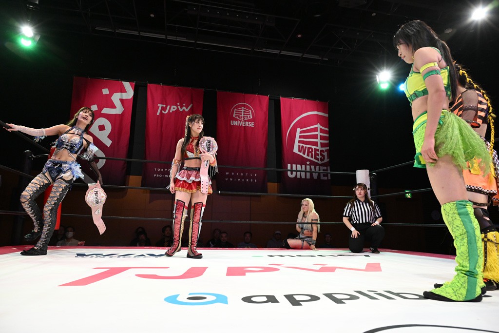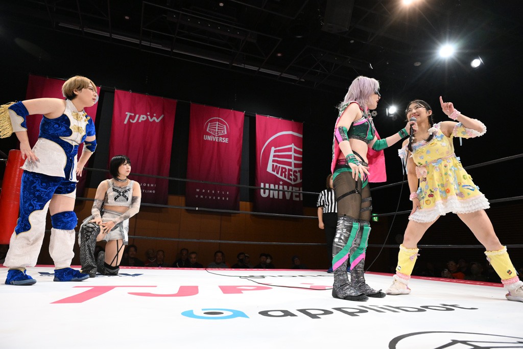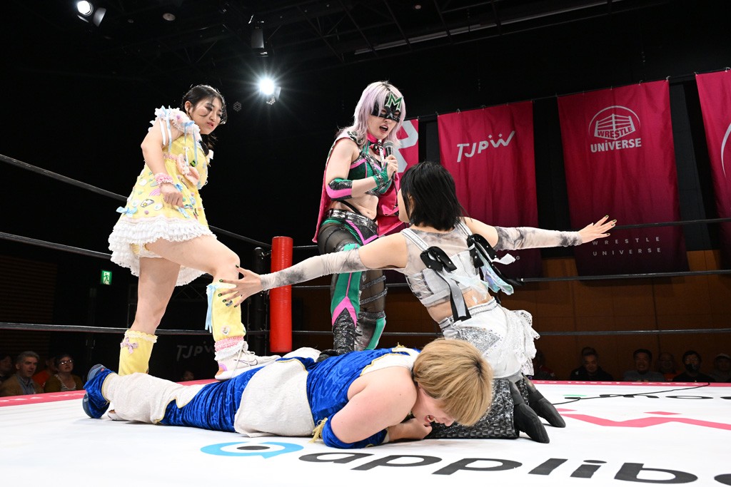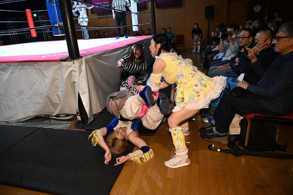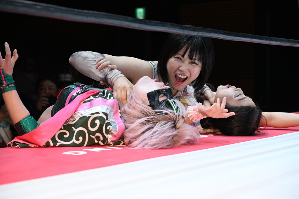 麻雀でも虎の子、アイアンマンヘビーメタル級王座を防衛した桐生真弥を巡る争い。さっそく入場したばかりのミサヲがマイクを取ると「ここで皆様だけに私たちの作戦を発表します。らくちゃん、どっちが獲っても恨みっこなしということで、とにかく真弥からベルトを剝がしましょう。入場が一番油断していると思うから入場したらドヤっている隙に丸め込もう」と言うとミサヲとらくが文りんレフェリーも呼び寄せて入場ゲートで待ち伏せ。しかし真弥とリカが現れたのは入場ゲートとは反対の観客の入場口。あっけに取られたミサヲとらく。ミサヲは再びマイクを要求。ミサヲ「作戦は失敗したんですけどらくちゃんまだ大丈夫だよね?」らく「もう1個ある」ミサヲ「絶対に恨みっこなしで獲っちゃおうね」真弥「うるせー! オマエらに獲らせるわけないだろうが!」ここでミサヲとらくが襲い掛かってようやく開始のゴング。苦しい真弥はらくをボディースラムで叩きつけると「最近負け知らずで大変申し訳ございませんでした」と謝罪式ニードロップ。替わったリカがよっしゃいくぞエルボーで続く。リカの足4の字をロープに逃げたらくがフェースバスター。ミサヲが出てくるとクロスボディーを放ち、カウント2で返されるとチキンウイング・フェースロック。リカがこれを潰して解除し、ヒップアタック。真弥と交替。真弥が串刺しバックエルボーで続くが、ミサヲもスプレーを噴霧して串刺しニー。さらに丸め込み連発も真弥が意地のクリア。疲労困憊で場外に逃げる真弥。カウントが進む中、ミサヲが丸め込むもらくがカット。らくが丸め込むもミサヲがカットして恨みっこなしがなしになったことで揉める。そこにリカが入って2人まとめて首絞め。2人がダウンしていると真弥にロックオン。リングに逃げる真弥にリカがスライディングヒップを見舞ってカバーすると3カウントが入ってアイアンマンが移動してしまったが、タッグマッチは続行中。場外カウント14のところでミサヲがリングに戻るが、リング内にはアイアンマン王者ではなくなったグロッキーな真弥が。用なしとばかりに相手コーナーに戻すがリカがタッチを拒否。真弥もなんとかエルボーを見舞ってタッチを求めるがリカが拒否し、その間にミサヲから替わったらくにブレーンチョップされてしまう。真弥もなんとか河底撈魚を決めたがスパインバスターはかわされてしまう。ミサヲがエプロンからにニーアタック、らくがコーナーからのぽっぽーチョップを放つがカバーはリカがカット。リカがミサヲをドラゴンバックブリーカーで排除し、真弥との連係を試みるも、真弥のエルボーはリカに決まってしまう。らくが孤立した真弥をハリケーンターンで丸め込んで勝負あり。アイアンマンを手に喜ぶリカが脱兎のごとく退場していった。