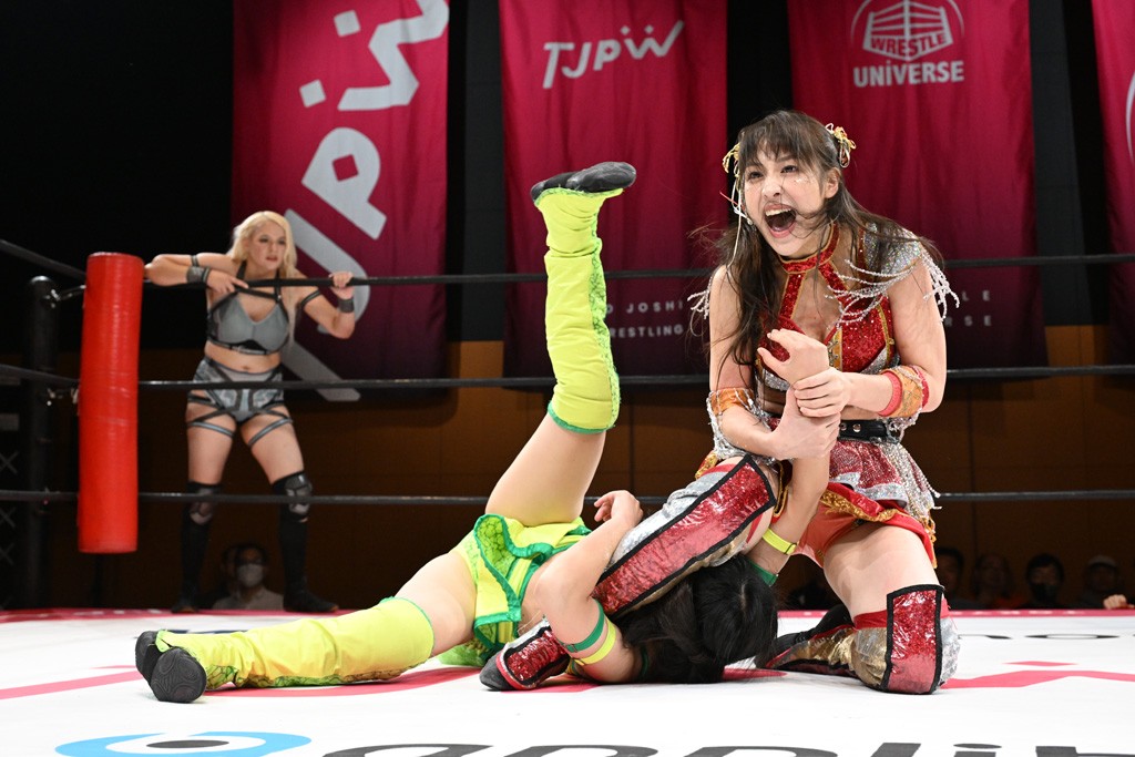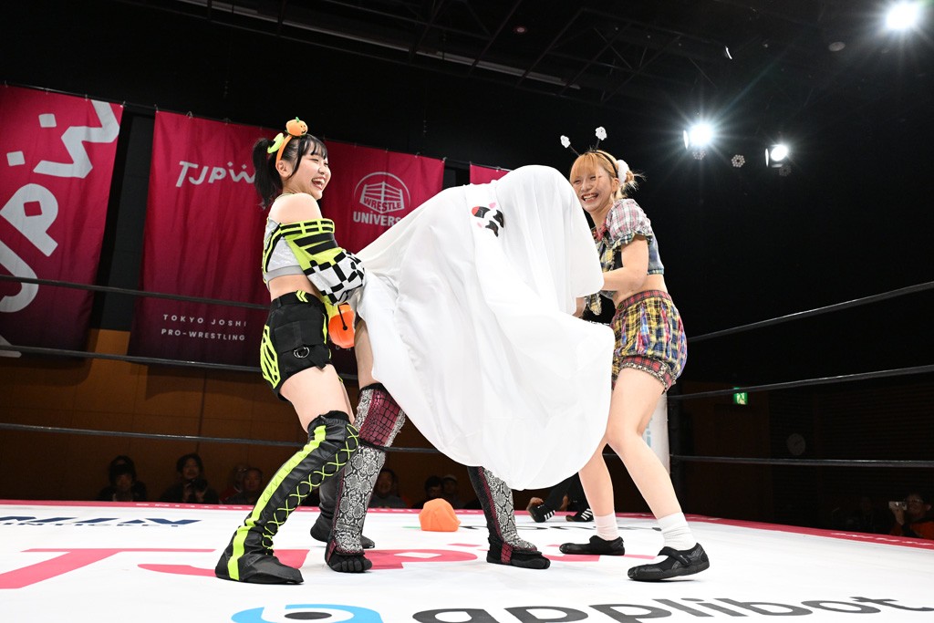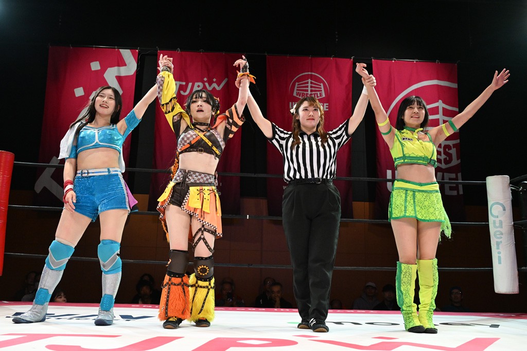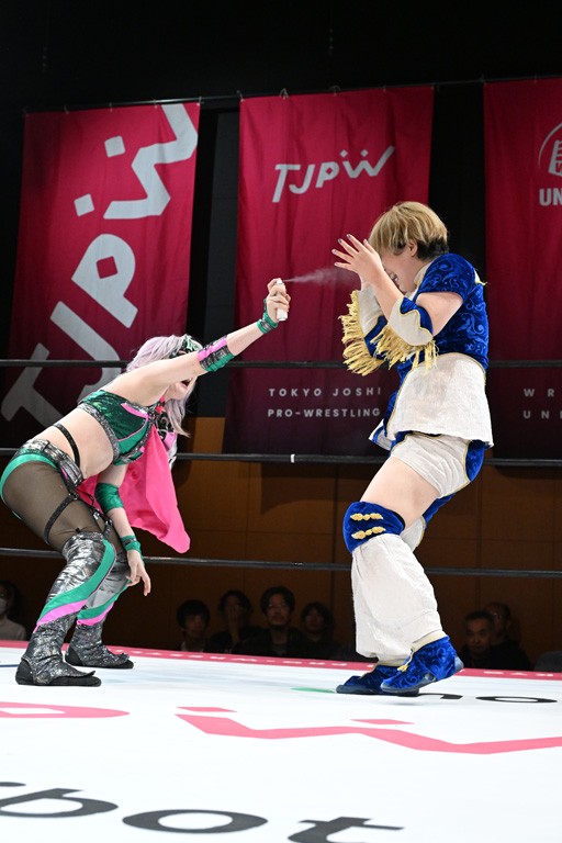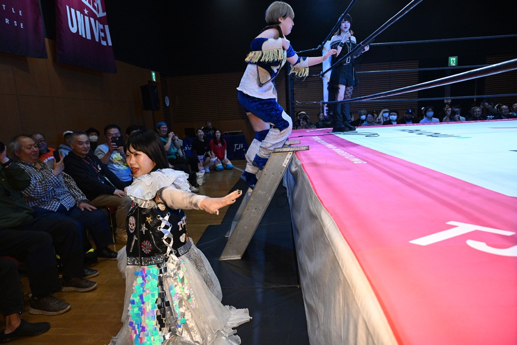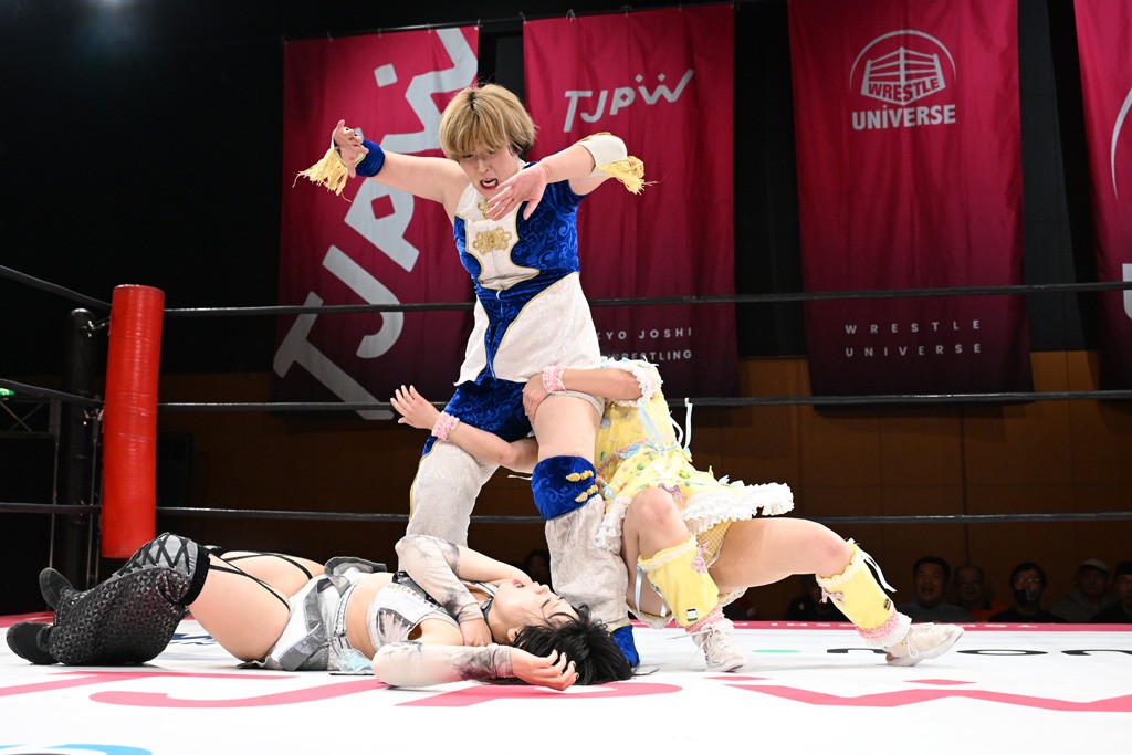 麻雀でも虎の子、アイアンマンヘビーメタル級王座を防衛した桐生真弥を巡る争い。さっそく入場したばかりのミサヲがマイクを取ると「ここで皆様だけに私たちの作戦を発表します。らくちゃん、どっちが獲っても恨みっこなしということで、とにかく真弥からベルトを剝がしましょう。入場が一番油断していると思うから入場したらドヤっている隙に丸め込もう」と言うとミサヲとらくが文りんレフェリーも呼び寄せて入場ゲートで待ち伏せ。しかし真弥とリカが現れたのは入場ゲートとは反対の観客の入場口。あっけに取られたミサヲとらく。ミサヲは再びマイクを要求。ミサヲ「作戦は失敗したんですけどらくちゃんまだ大丈夫だよね?」らく「もう1個ある」ミサヲ「絶対に恨みっこなしで獲っちゃおうね」真弥「うるせー! オマエらに獲らせるわけないだろうが!」ここでミサヲとらくが襲い掛かってようやく開始のゴング。苦しい真弥はらくをボディースラムで叩きつけると「最近負け知らずで大変申し訳ございませんでした」と謝罪式ニードロップ。替わったリカがよっしゃいくぞエルボーで続く。リカの足4の字をロープに逃げたらくがフェースバスター。ミサヲが出てくるとクロスボディーを放ち、カウント2で返されるとチキンウイング・フェースロック。リカがこれを潰して解除し、ヒップアタック。真弥と交替。真弥が串刺しバックエルボーで続くが、ミサヲもスプレーを噴霧して串刺しニー。さらに丸め込み連発も真弥が意地のクリア。疲労困憊で場外に逃げる真弥。カウントが進む中、ミサヲが丸め込むもらくがカット。らくが丸め込むもミサヲがカットして恨みっこなしがなしになったことで揉める。そこにリカが入って2人まとめて首絞め。2人がダウンしていると真弥にロックオン。リングに逃げる真弥にリカがスライディングヒップを見舞ってカバーすると3カウントが入ってアイアンマンが移動してしまったが、タッグマッチは続行中。場外カウント14のところでミサヲがリングに戻るが、リング内にはアイアンマン王者ではなくなったグロッキーな真弥が。用なしとばかりに相手コーナーに戻すがリカがタッチを拒否。真弥もなんとかエルボーを見舞ってタッチを求めるがリカが拒否し、その間にミサヲから替わったらくにブレーンチョップされてしまう。真弥もなんとか河底撈魚を決めたがスパインバスターはかわされてしまう。ミサヲがエプロンからにニーアタック、らくがコーナーからのぽっぽーチョップを放つがカバーはリカがカット。リカがミサヲをドラゴンバックブリーカーで排除し、真弥との連係を試みるも、真弥のエルボーはリカに決まってしまう。らくが孤立した真弥をハリケーンターンで丸め込んで勝負あり。アイアンマンを手に喜ぶリカが脱兎のごとく退場していった。