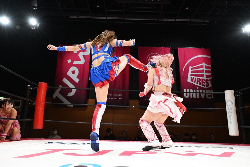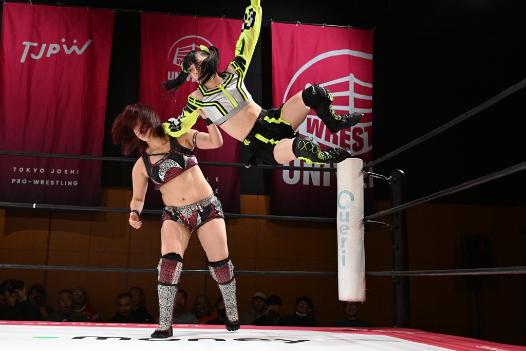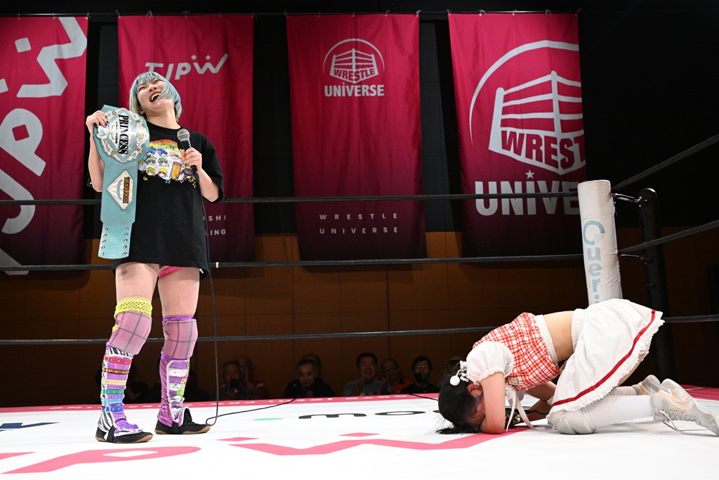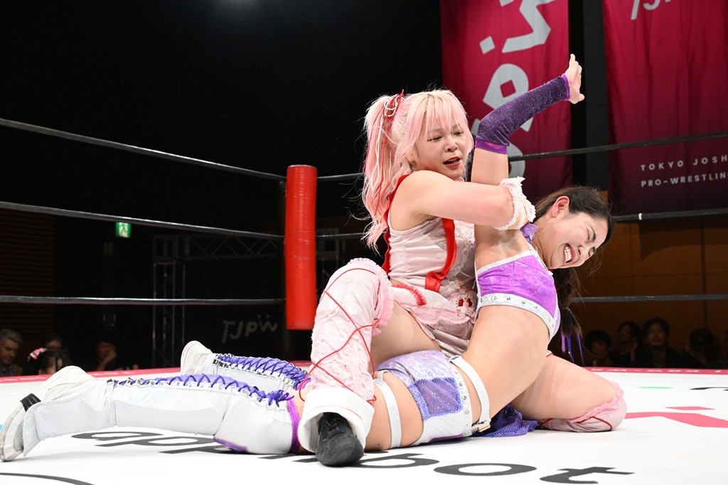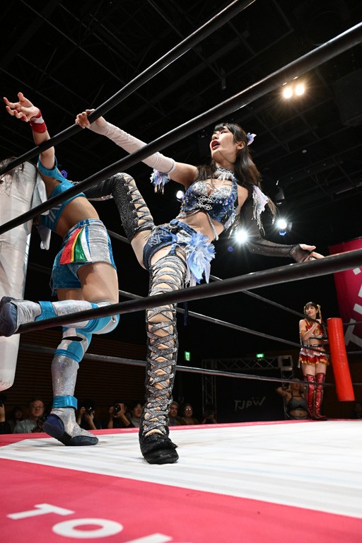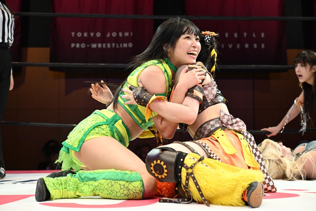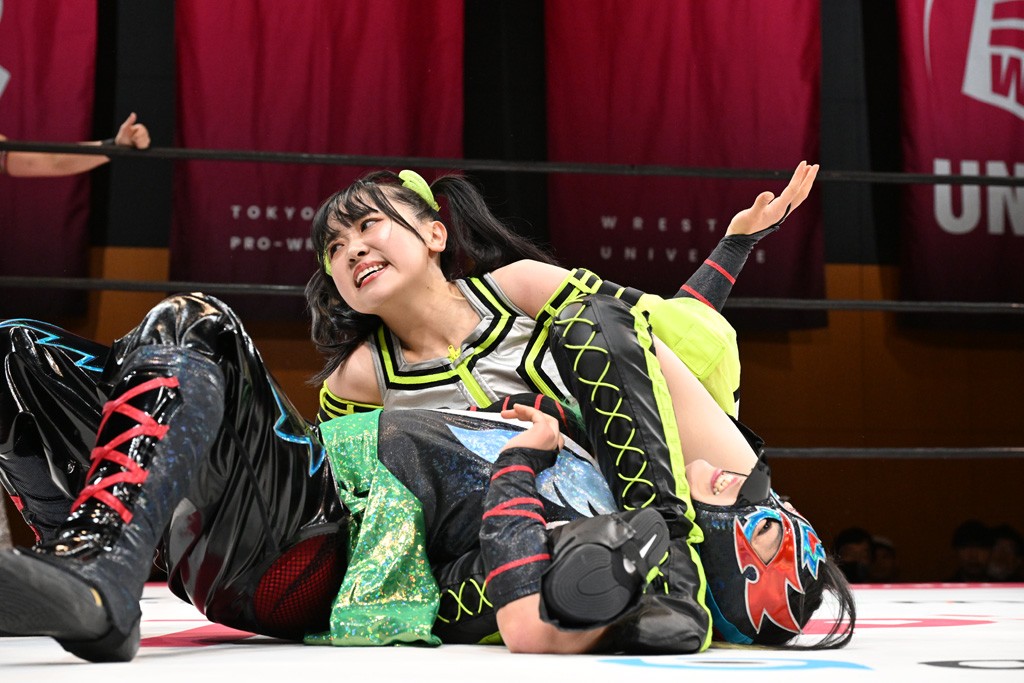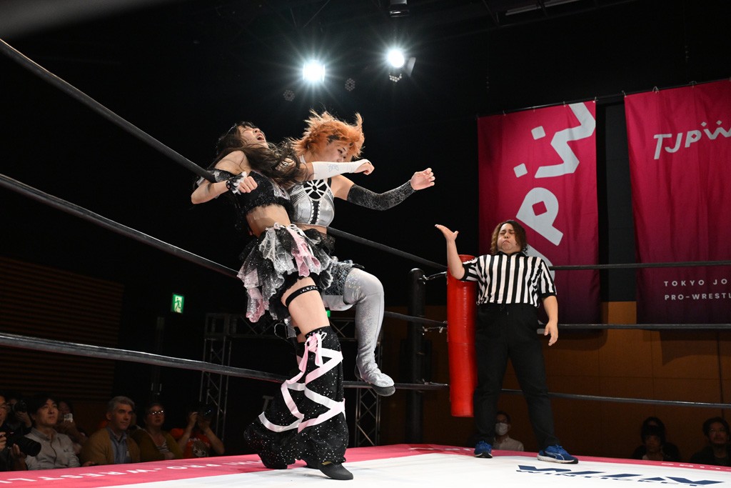 汐珠 自分の口から有栖さんとシングルがしたいとか、言いたくても思っていても言えなかったことで。でも有栖さんには一回だけ普通に言ったことがあって。なんでかって言うといっぱい理由があるので、これから11月9日までにどこかで発信していくんですけど、一番は身長が同じなんですよ! 気づいてない人もいると思うんですけど。有栖さんと汐珠って身長が同じで、汐珠はすごい小さいということですごく心配させちゃうというか、そういう目で見られることが多かったので。そこの一つの光になってくださっている方だし、それは有栖さんだけじゃなくて、中島(翔子)さんとか鈴芽さんとかもそうなんですけど、今、(渡辺)未詩さんが一番のベルトを持っているんですけど、ずっと汐珠は未詩さんに憧れてここに来ましたって言ってるんですけど、どう頑張っても(未詩のようには)なれないと思っているので、言い方が難しいんですけど、まだ自分は見えてないんですけど、一番近い(なりたい)像が有栖さんかなって自分の中では思っているので、なのでそうです。