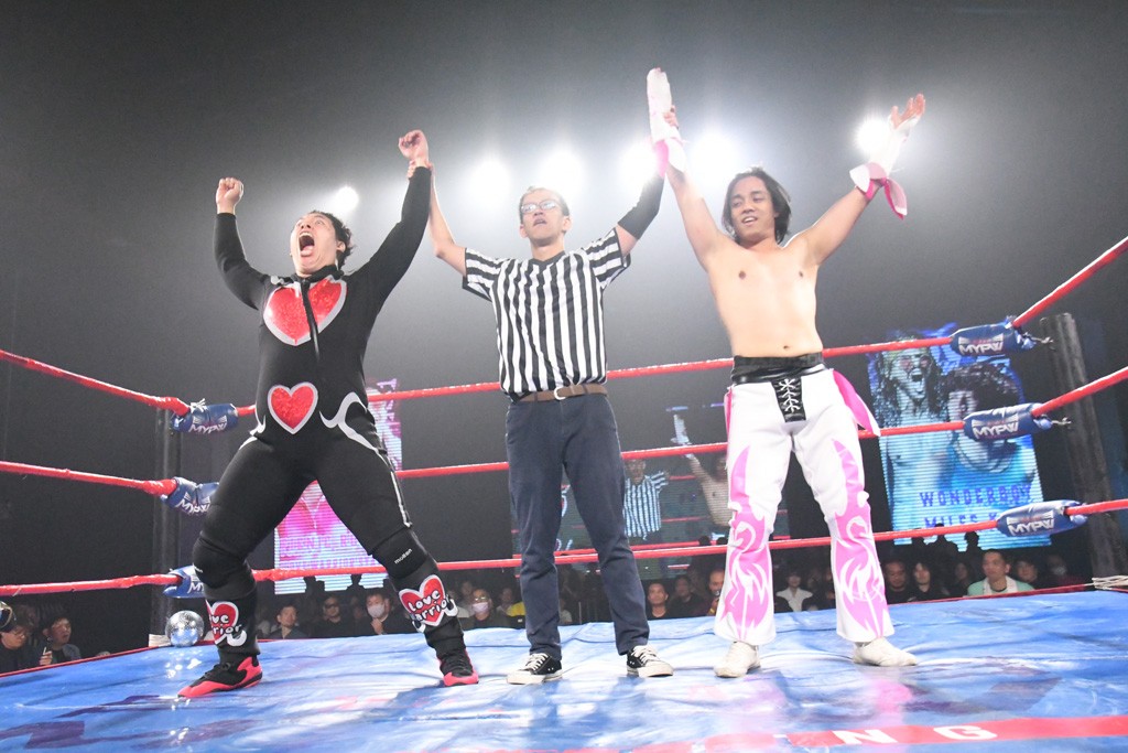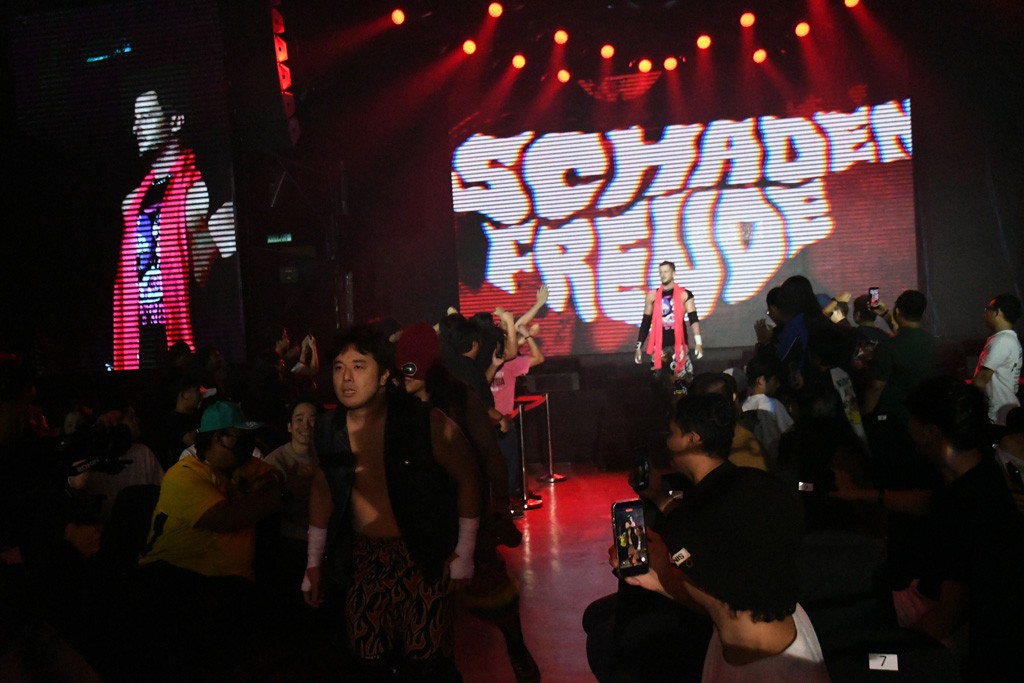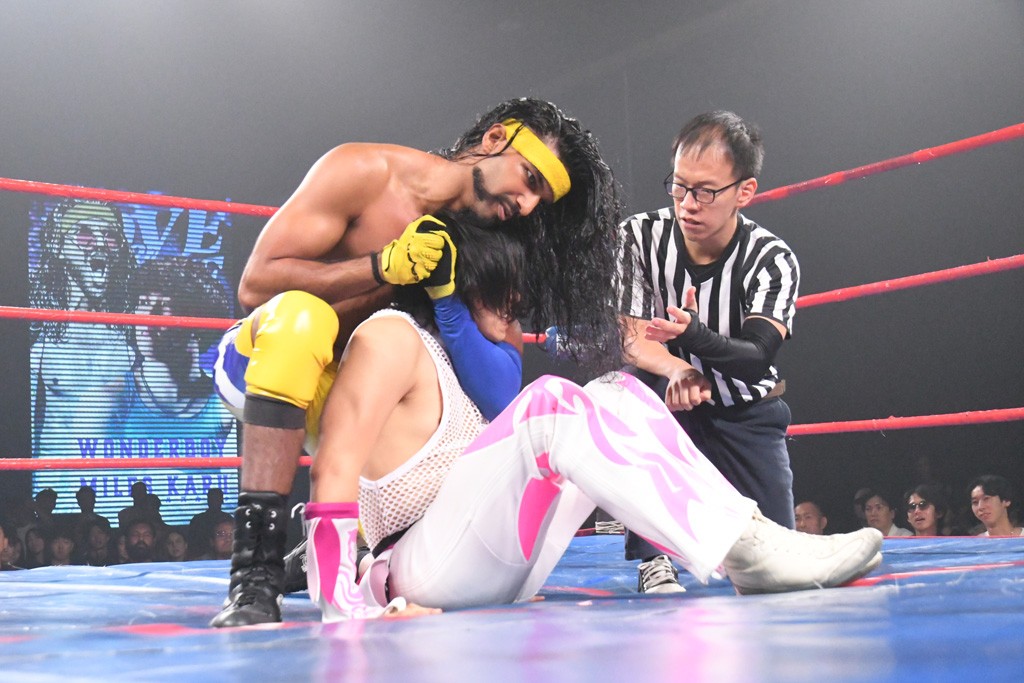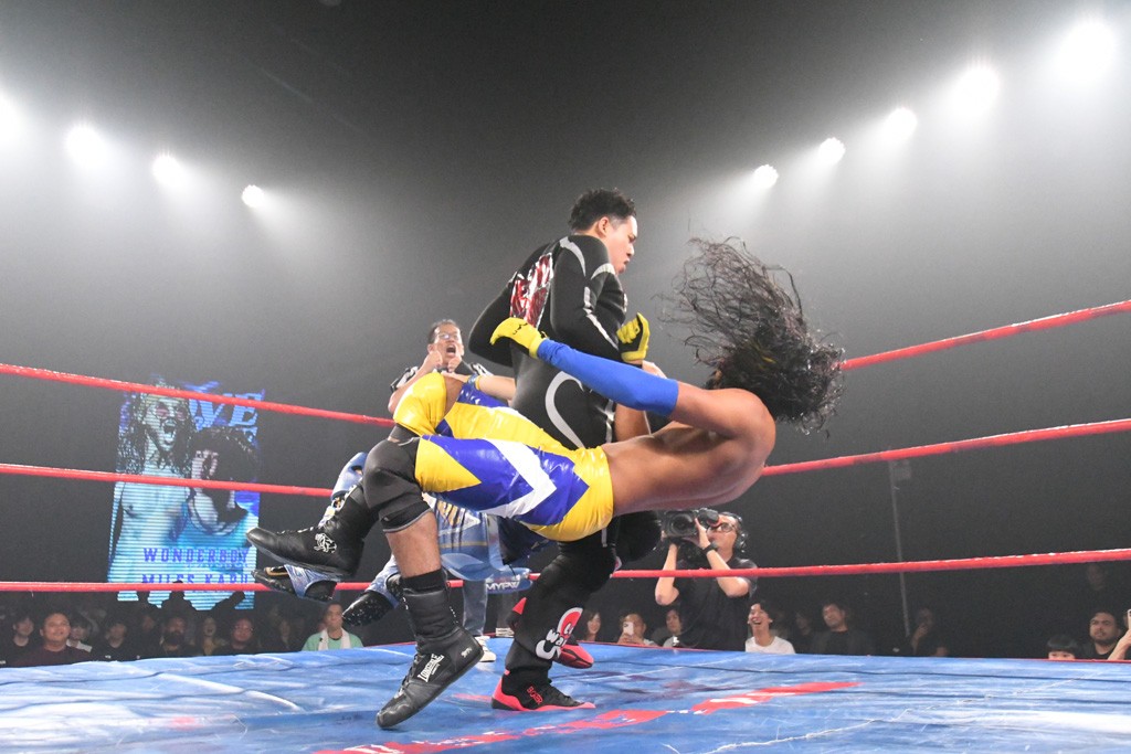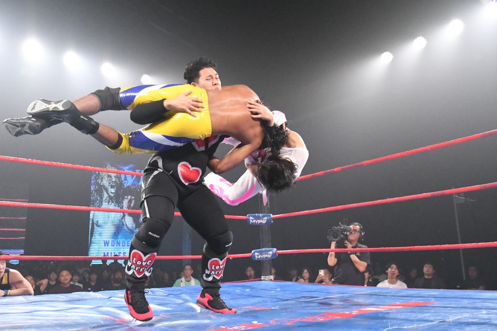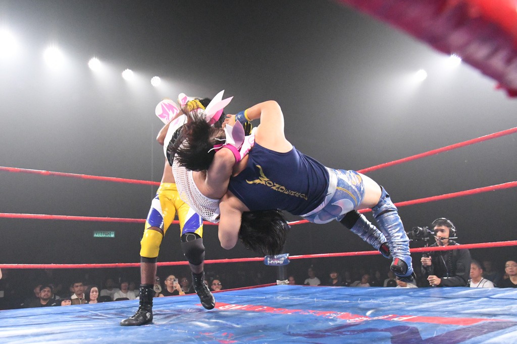 マレーシアプロレスの提供試合はローズ&シャワールのLOVE×FRDMとワンダーボーイ&カルゥのJuicy Boyzのタッグチーム対決。ガタイのいいJuicy Boyzに攻め込まれるLOVE×FRDM。ローズがワンダーボーイにダブルアーム式のデュランダルで盛り返すと、シャワールがミラーボールを持ち出し、音響に指示を出す。場内にKLP48の『Flying Get』が流れてローズがダンス。カルゥがドロップキックで止めるも、シャワールが助けに入って最後は孤立したワンダーボーイを合体技のアトミックラブボムで仕留めた。