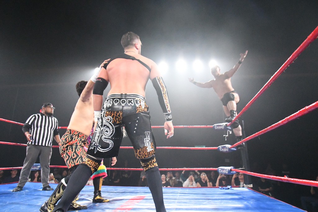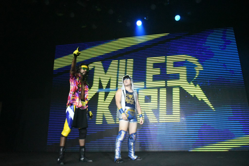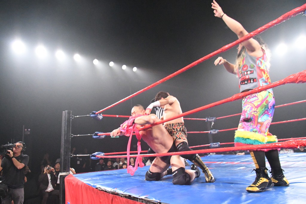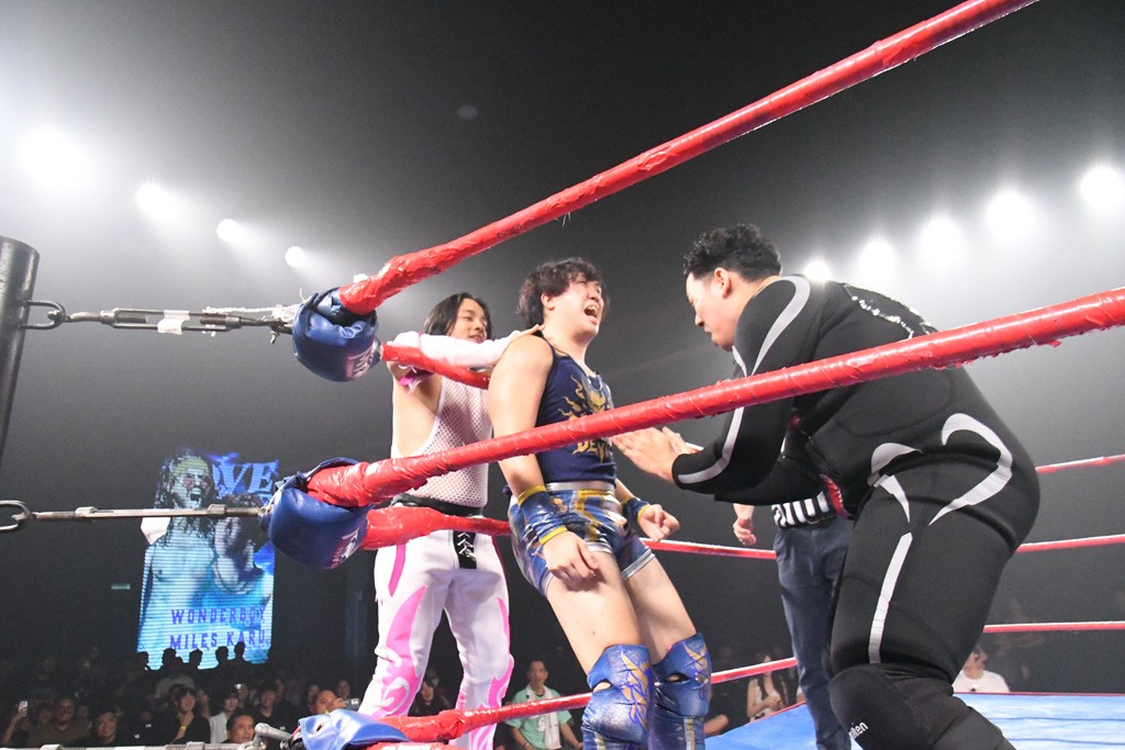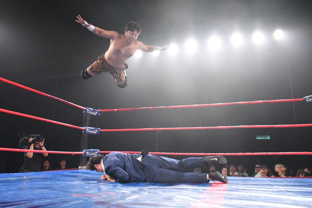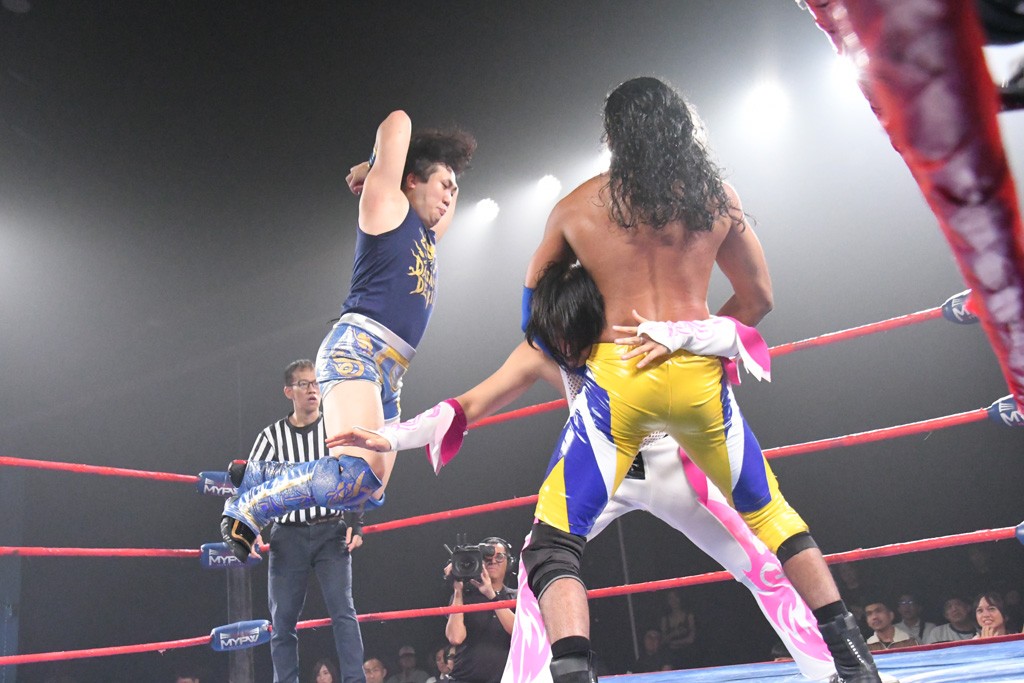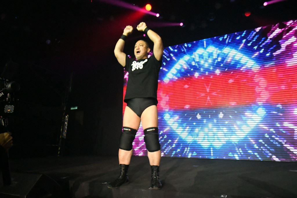 マレーシアプロレスの提供試合はローズ&シャワールのLOVE×FRDMとワンダーボーイ&カルゥのJuicy Boyzのタッグチーム対決。ガタイのいいJuicy Boyzに攻め込まれるLOVE×FRDM。ローズがワンダーボーイにダブルアーム式のデュランダルで盛り返すと、シャワールがミラーボールを持ち出し、音響に指示を出す。場内にKLP48の『Flying Get』が流れてローズがダンス。カルゥがドロップキックで止めるも、シャワールが助けに入って最後は孤立したワンダーボーイを合体技のアトミックラブボムで仕留めた。