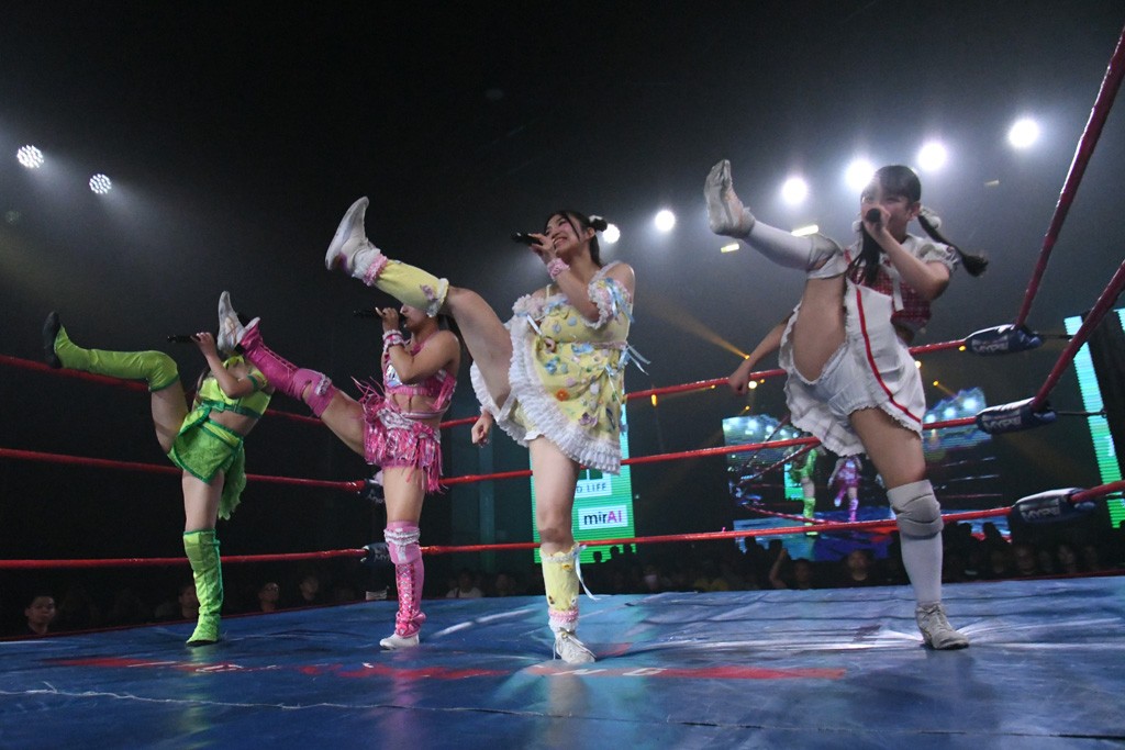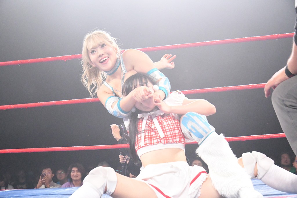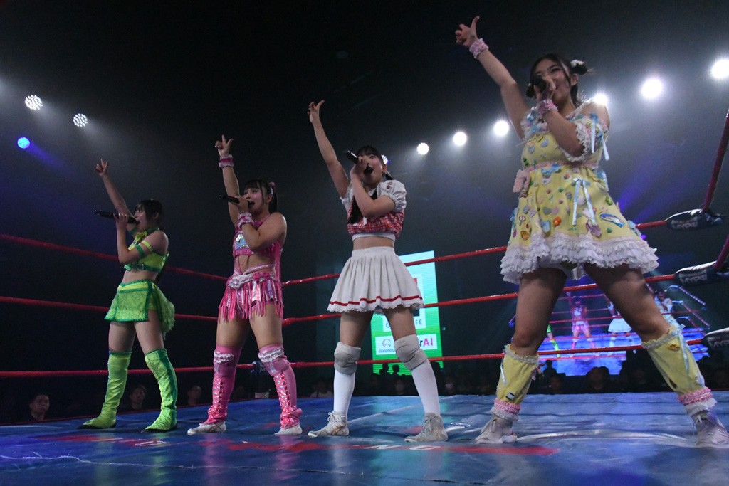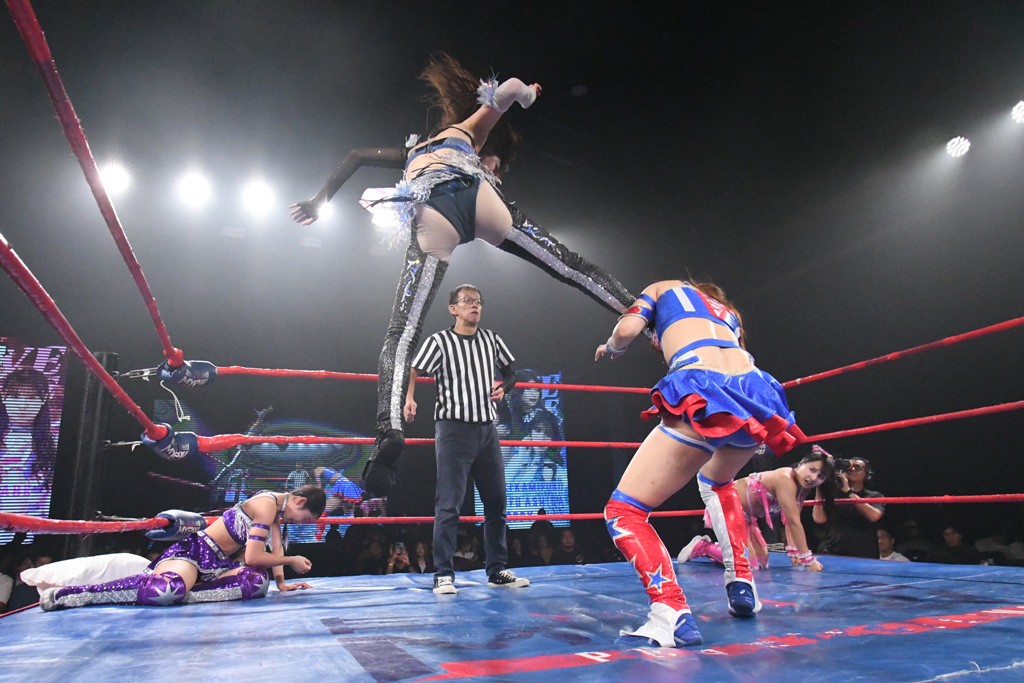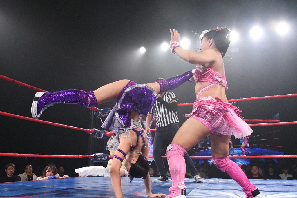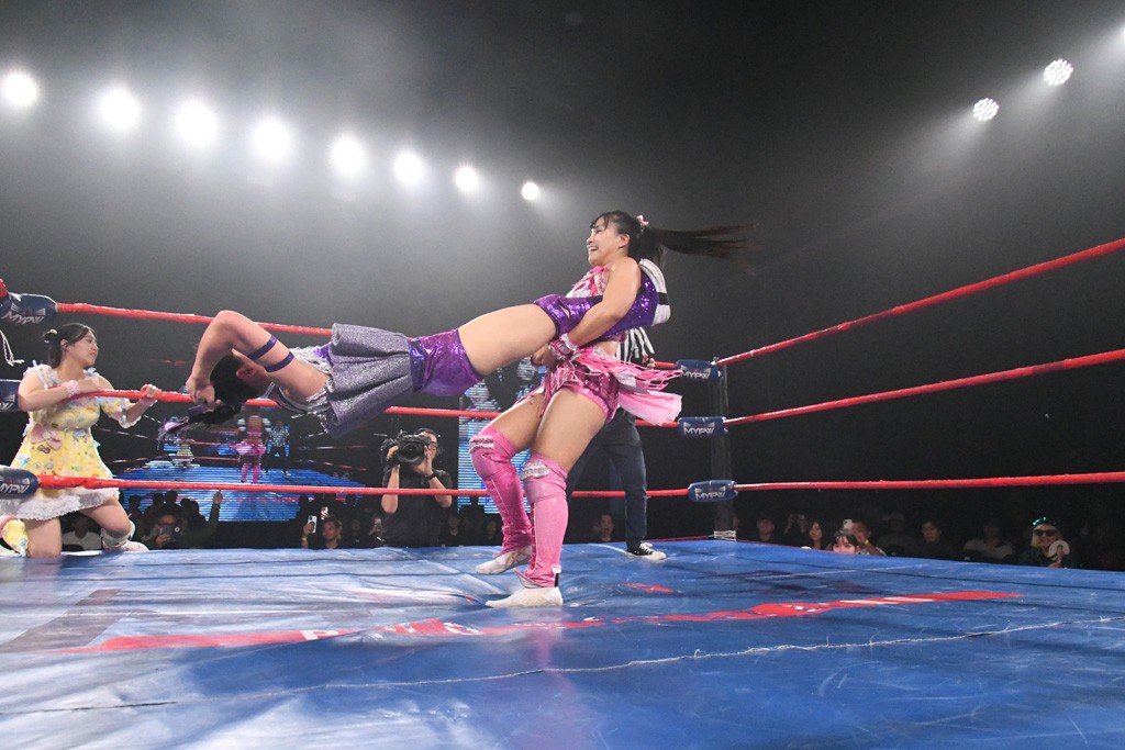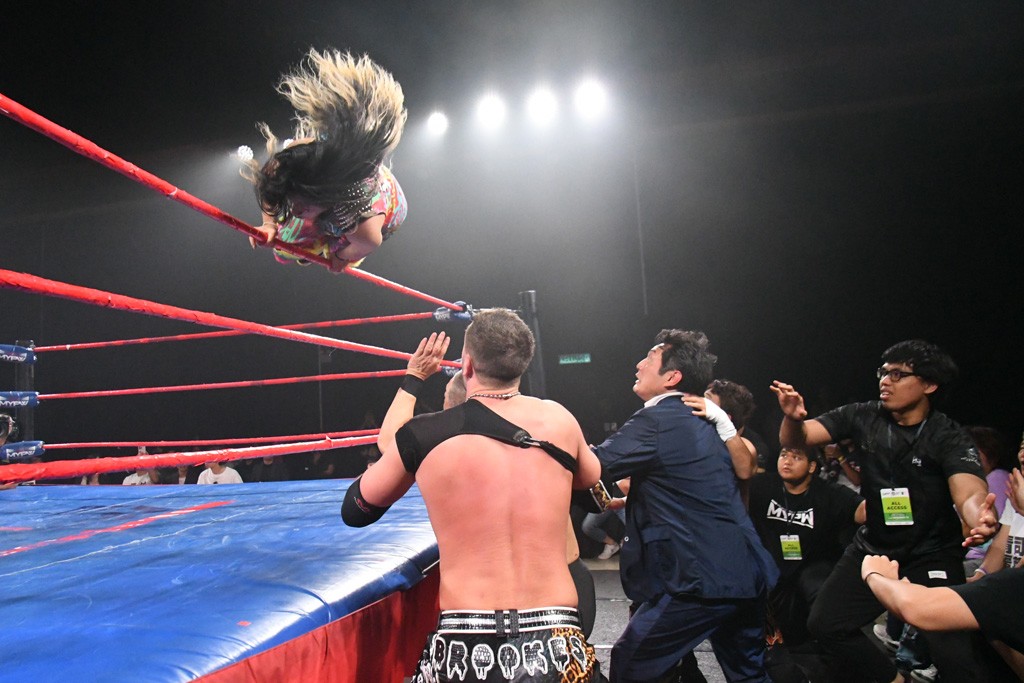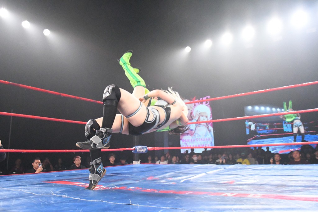 マレーシアでもらくが持参した枕を使って寝だし、芦田がチアアップで起こそうとするも、気分を害したらくがぽっぽーチョップで怒りの一撃という展開。その後は捕まったらくがシェイにフェースバスターを決めて荒井と交替。荒井はビッグブーツ連打。シェイも反撃すると替わった上福がドロップキックを突き刺す。ブートのラリーは上福が制してブレーンバスター。荒井もフルネルソンバスターで返す。未詩が出てきてコーナースプラッシュ。上福も卍固めでやり返すも、未詩は振り子式バックブリーカー。カナディアン・バックブリーカー狙いは上福が踏ん張って裏フェイマサー。芦田がY字ギロチンで続く。芦田のXファクターを食らった未詩だが、ジャーマン狙いは阻止してボディースラム。高速ジャイアントスイングでぶん回してカナディアン・バックブリーカーで勝負に出たが上福がカット。らくが上福にぽっぽーチョップ。そのらくにシェイがニールキック。そのシェイに荒井がビッグブーツ。その荒井に上福がヤッホー83cm。未詩は上福と芦田をまとめてボディースラムで叩きつける。孤立した芦田に未詩はレーザービームからティアドロップの黄金パターンで勝利。