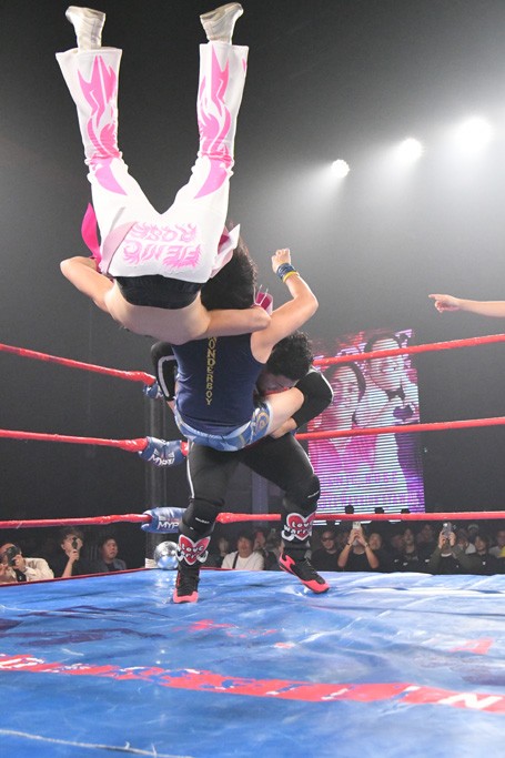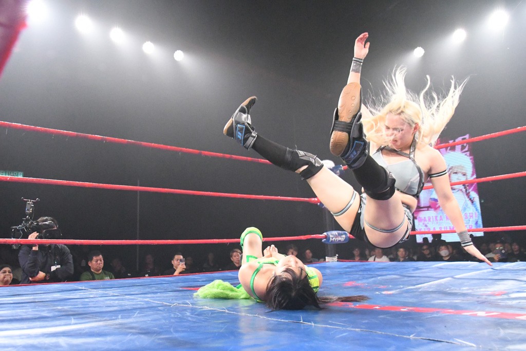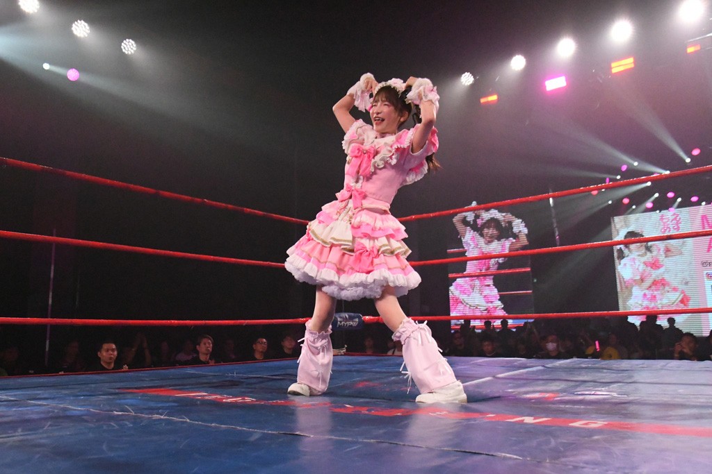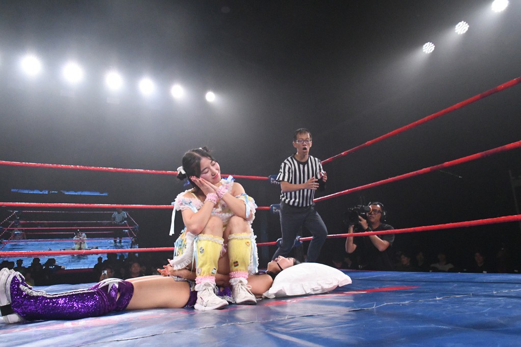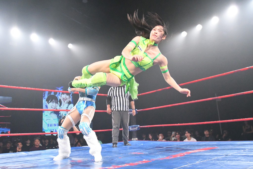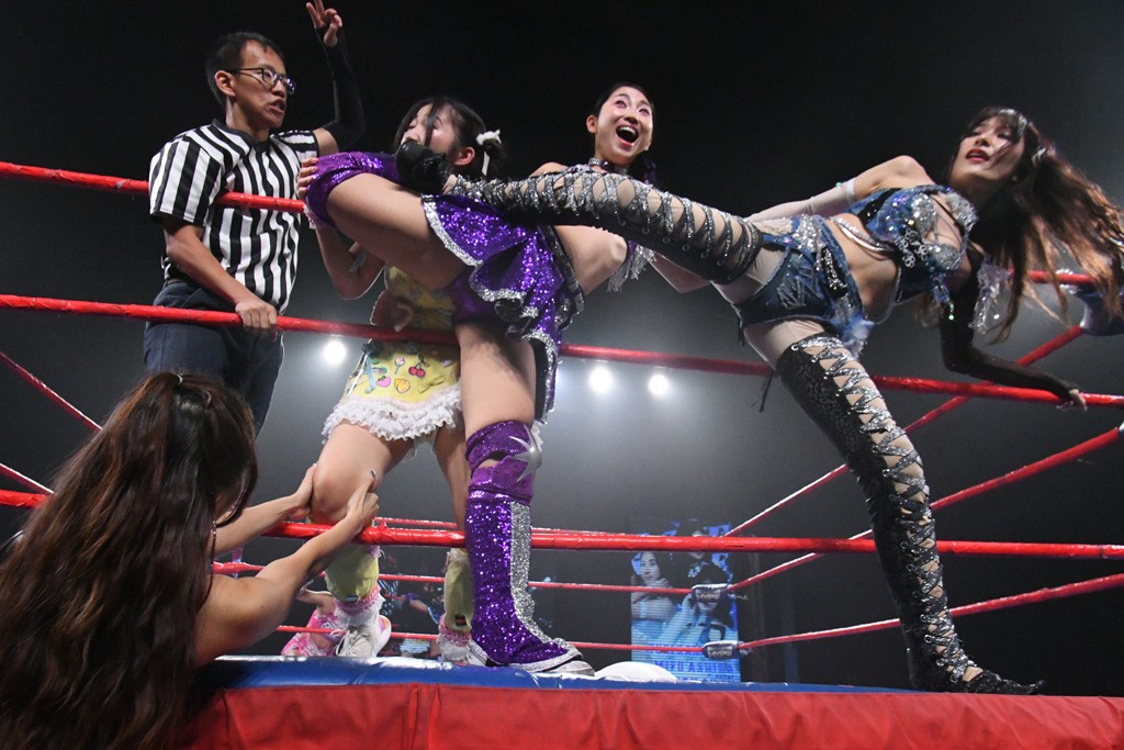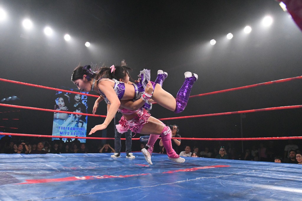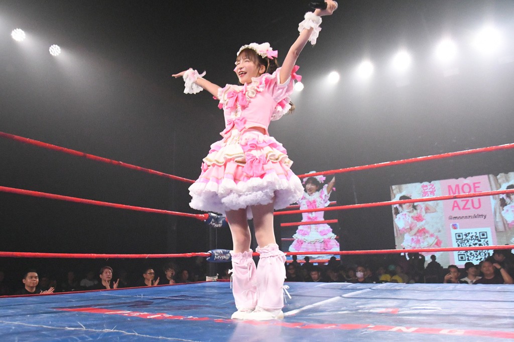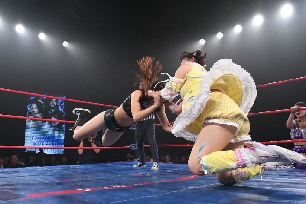 マレーシアでもらくが持参した枕を使って寝だし、芦田がチアアップで起こそうとするも、気分を害したらくがぽっぽーチョップで怒りの一撃という展開。その後は捕まったらくがシェイにフェースバスターを決めて荒井と交替。荒井はビッグブーツ連打。シェイも反撃すると替わった上福がドロップキックを突き刺す。ブートのラリーは上福が制してブレーンバスター。荒井もフルネルソンバスターで返す。未詩が出てきてコーナースプラッシュ。上福も卍固めでやり返すも、未詩は振り子式バックブリーカー。カナディアン・バックブリーカー狙いは上福が踏ん張って裏フェイマサー。芦田がY字ギロチンで続く。芦田のXファクターを食らった未詩だが、ジャーマン狙いは阻止してボディースラム。高速ジャイアントスイングでぶん回してカナディアン・バックブリーカーで勝負に出たが上福がカット。らくが上福にぽっぽーチョップ。そのらくにシェイがニールキック。そのシェイに荒井がビッグブーツ。その荒井に上福がヤッホー83cm。未詩は上福と芦田をまとめてボディースラムで叩きつける。孤立した芦田に未詩はレーザービームからティアドロップの黄金パターンで勝利。