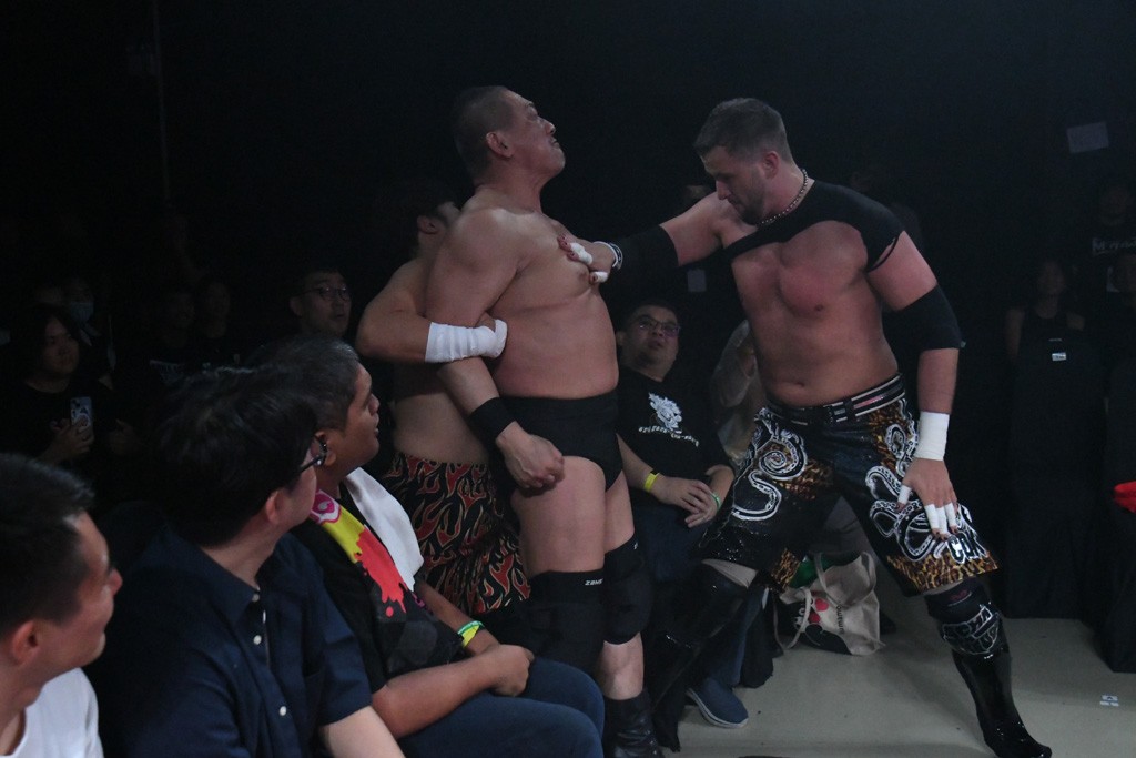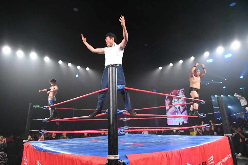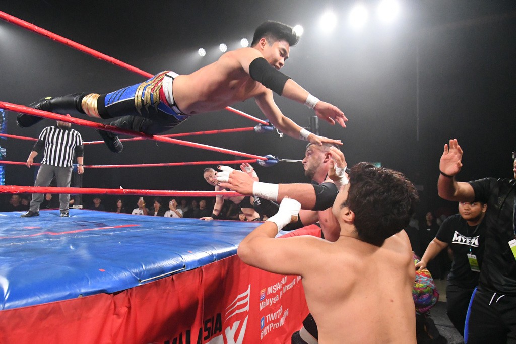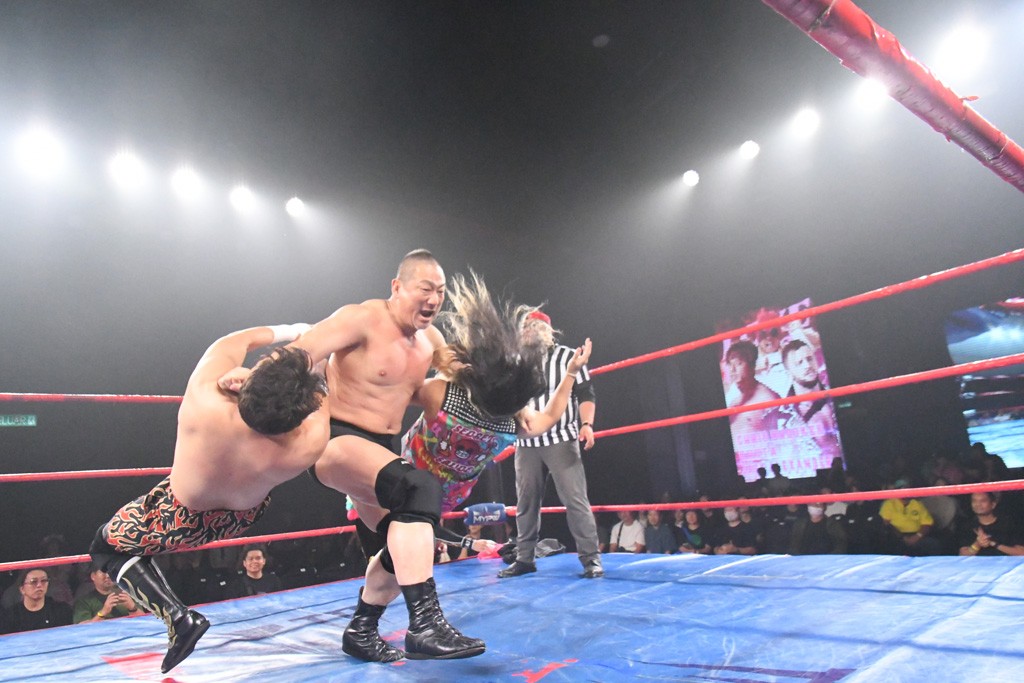 今大会の開催に尽力した髙木、川松の重鎮コンビとMYPWからエマンが加わったトリオ。対するはクリス、翔太、アレキサンダーはヒールっぽいスタンス。クリス組が襲い掛かって試合がスタートすると、のっけからの場外戦で地元マレーシアのお客さんは大興奮。リングに戻した川松に3人はシャーデンタワー。これは髙木とエマンがカットに入って川松を救出。髙木が翔太とアレキサンダーに両腕ラリアット。しかしながらドラゴンリングインはマレーシアでも迎撃されてしまうと、クリスがゴムベルトを持ちだして髙木の口に突っ込むと、ステージまで引っ張ってのゴムパッチンの刑。苦しい髙木だったがクリスのブレーンバスター狙いを切り返してぶん投げてピンチを脱出。エマンがクリスにエプロンからのスイングDDT。クリスもエマンをトップロープに叩きつけてのネックスクリューでやり返し、アレキサンダーとタッチ。エマンとアレキサンダーのラリアットが相打ちとなって戦況は川松vs翔太。川松が東京スカイツリーボムを放つも続くアックスボンバーは翔太に見切られ、クリス組の串刺し攻撃の餌食に。翔太が川松を羽交い絞め。クリスがビンタもかわされて翔太に誤爆。エマンがウラカンホイップでクリスも場外に出すとトペ・スイシーダ。髙木が飛ぶと思われたがアレキサンダーが阻止。アレキサンダーはトルニージョを投下。勝機と見た翔太がリングに戻された川松にフロッグスプラッシュもかわされて自爆。髙木がスタナー、エマンがスイングDDTで加勢。川松の下町ロケットはクリスとアレキサンダーがカット。髙木とエマンが2人を排除し、川松が孤立した翔太にアックスボンバーを放って3カウント。
